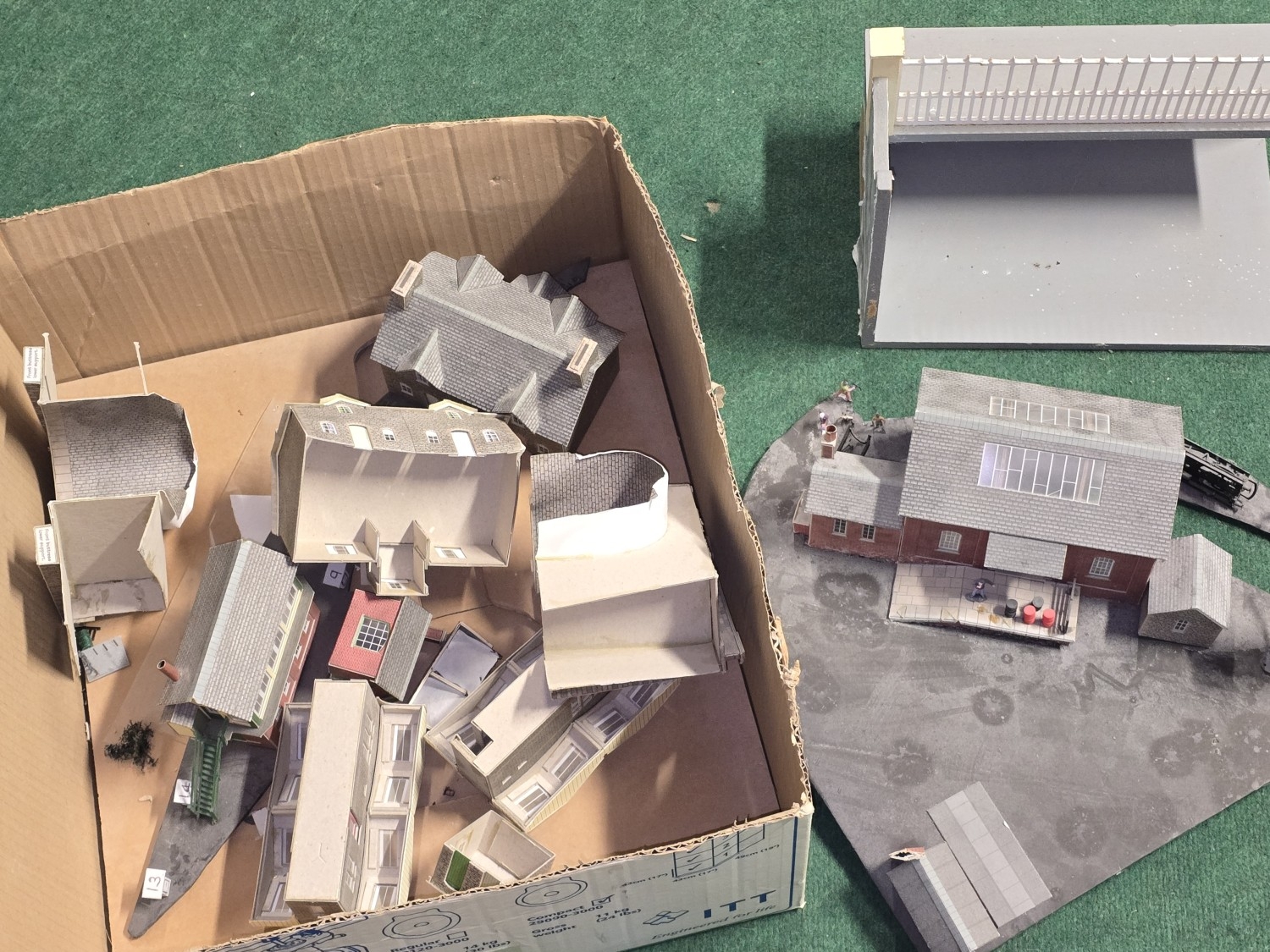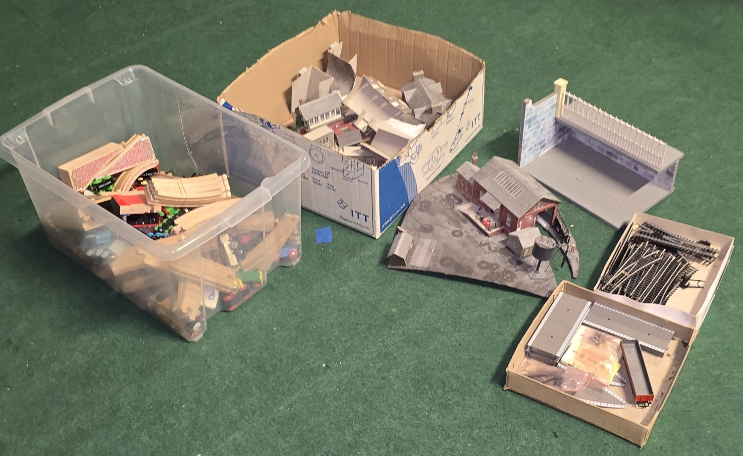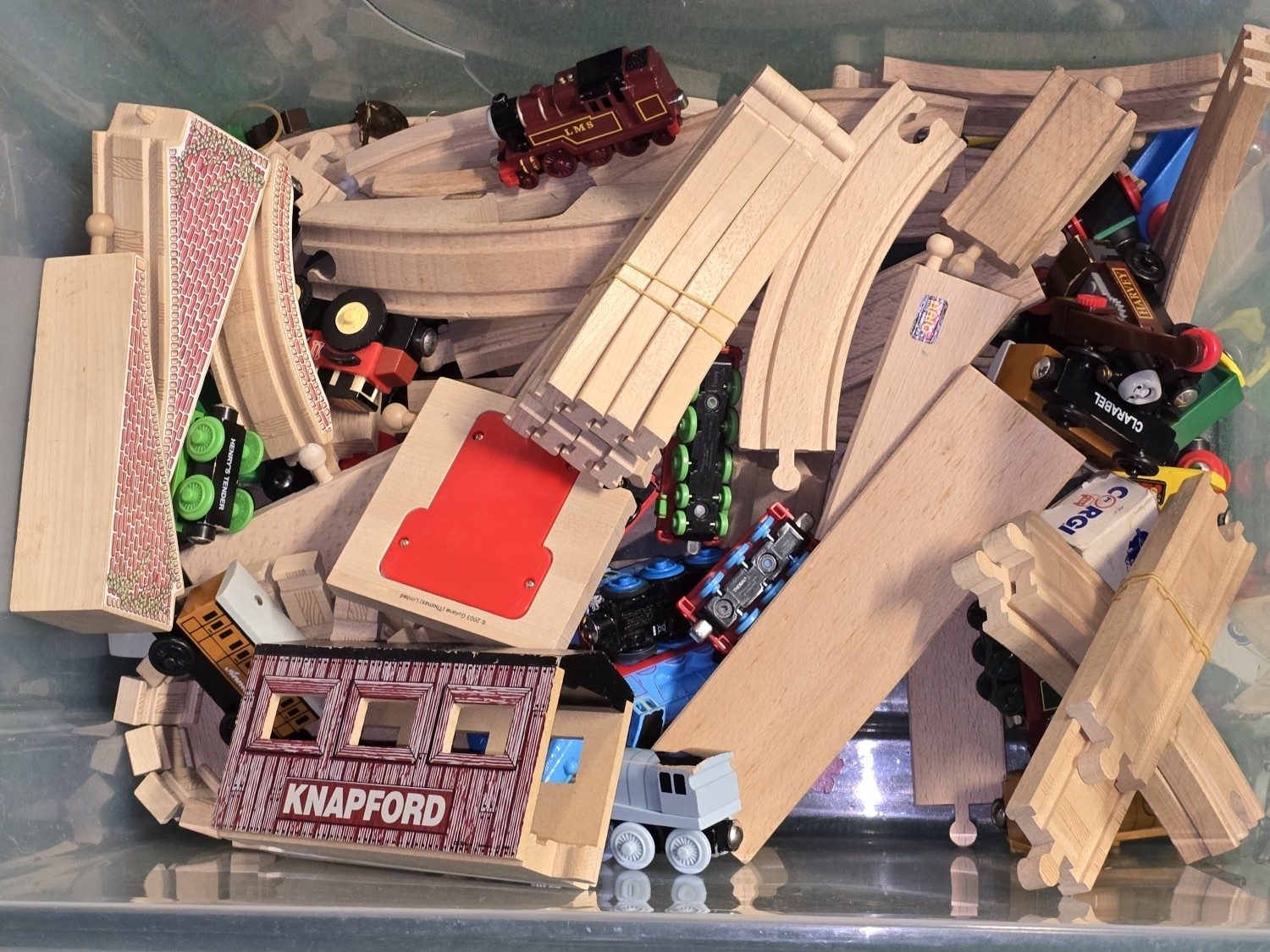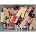 Collection of model railway scenery and track items together with a quantity of Brio and other wooden train set items.