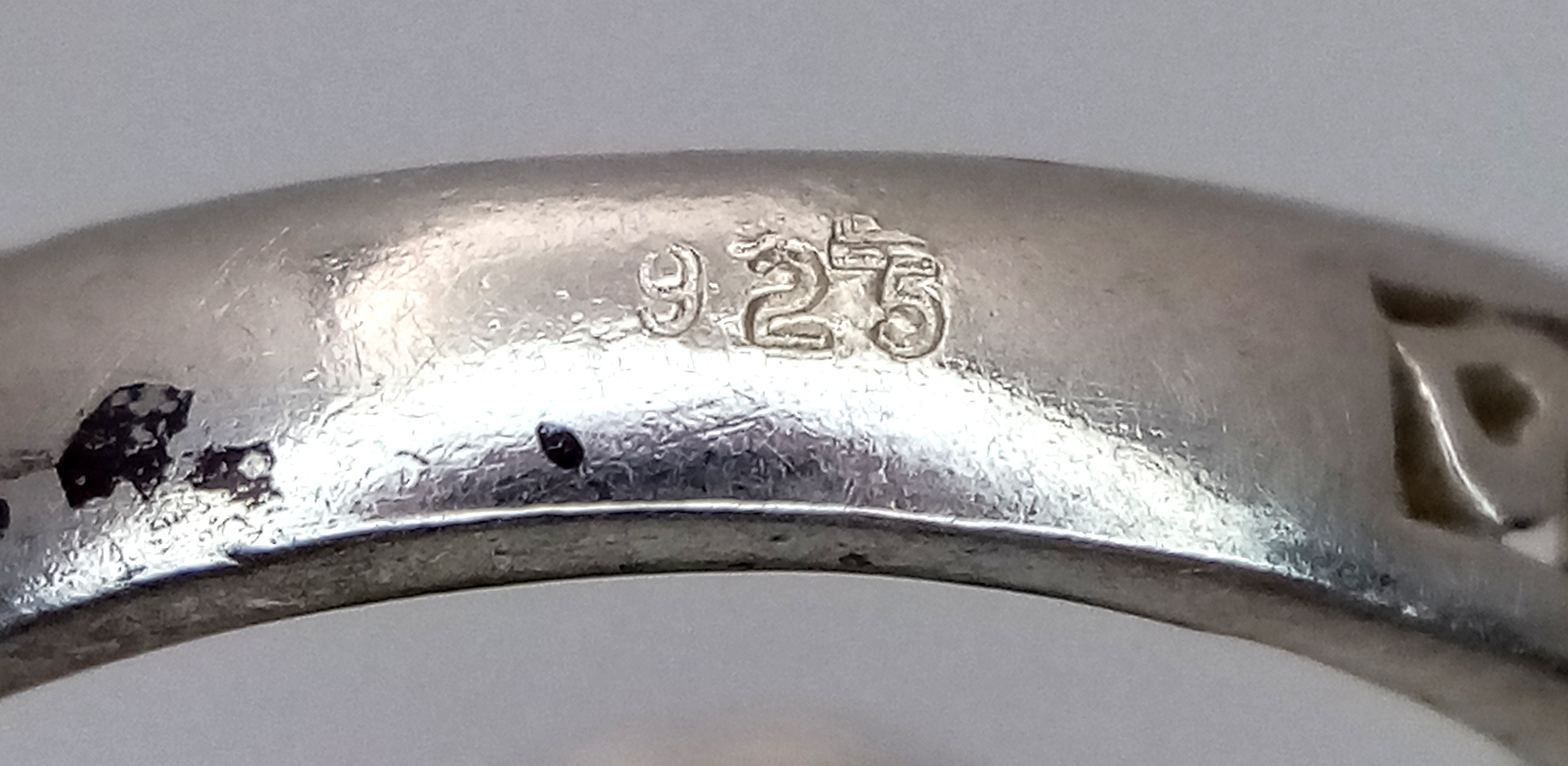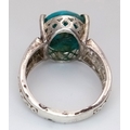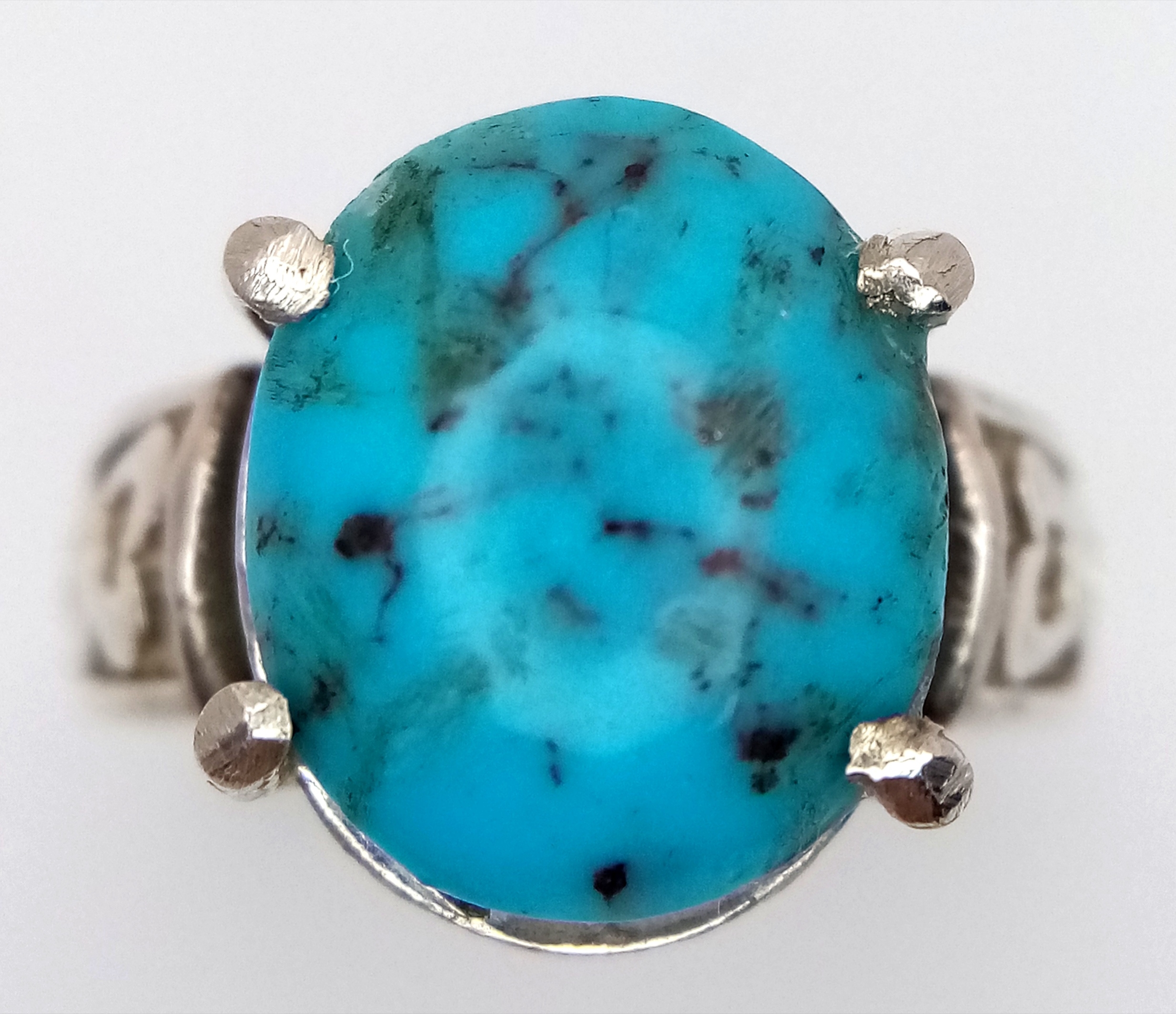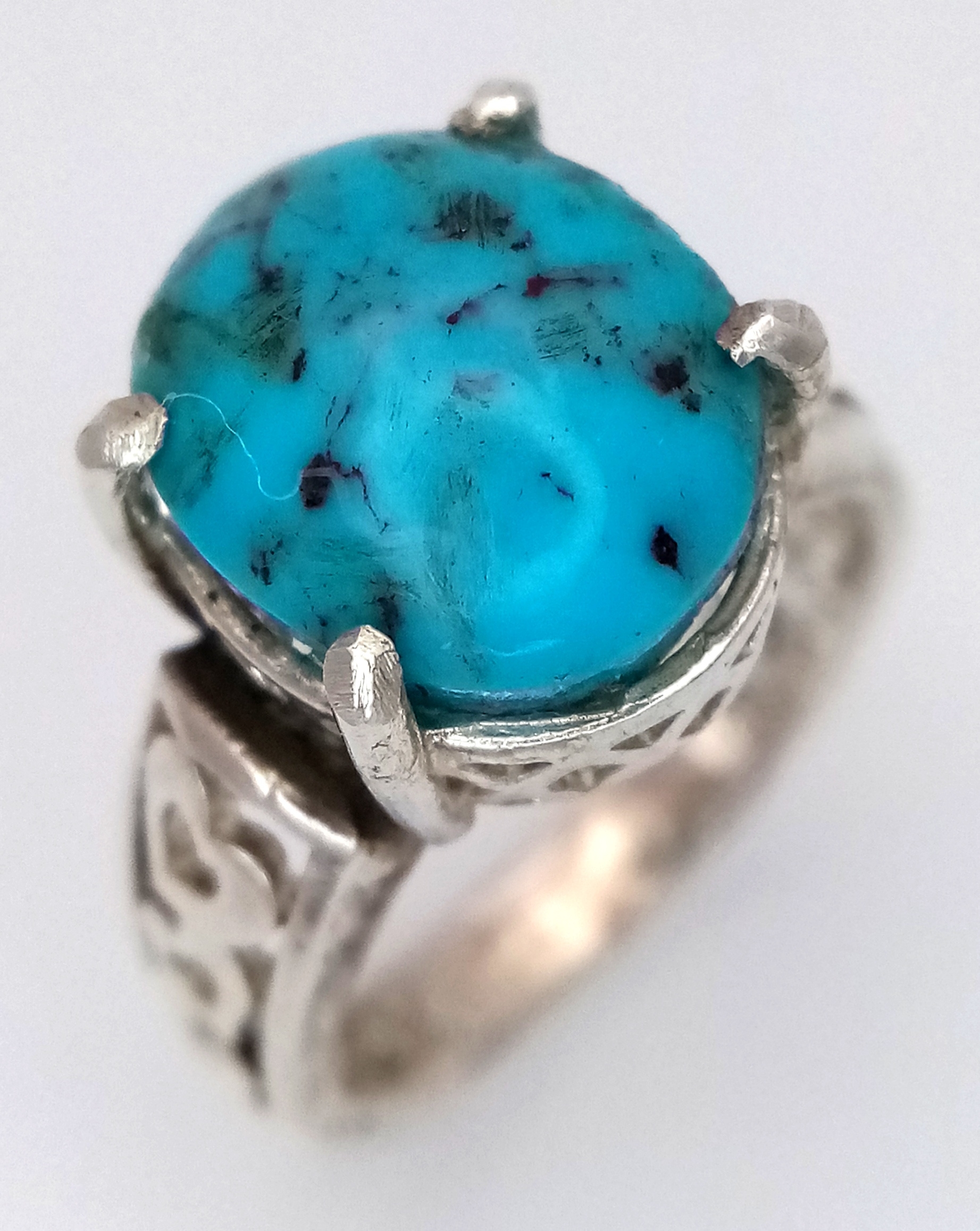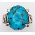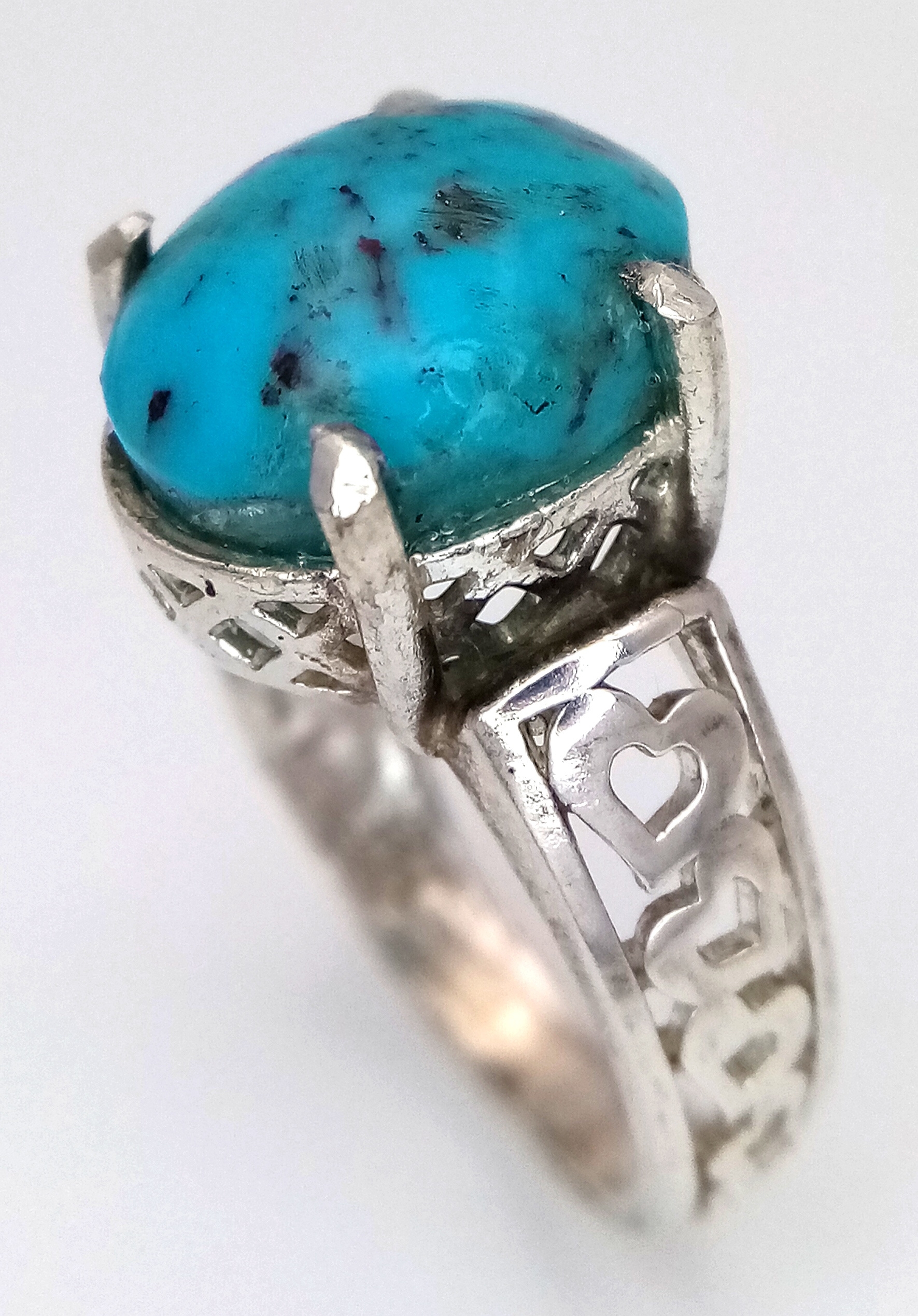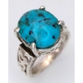 A 925 silver Turquoise ring with further ornate decoration on the shoulders. Total weight 5.3G. Size O.