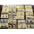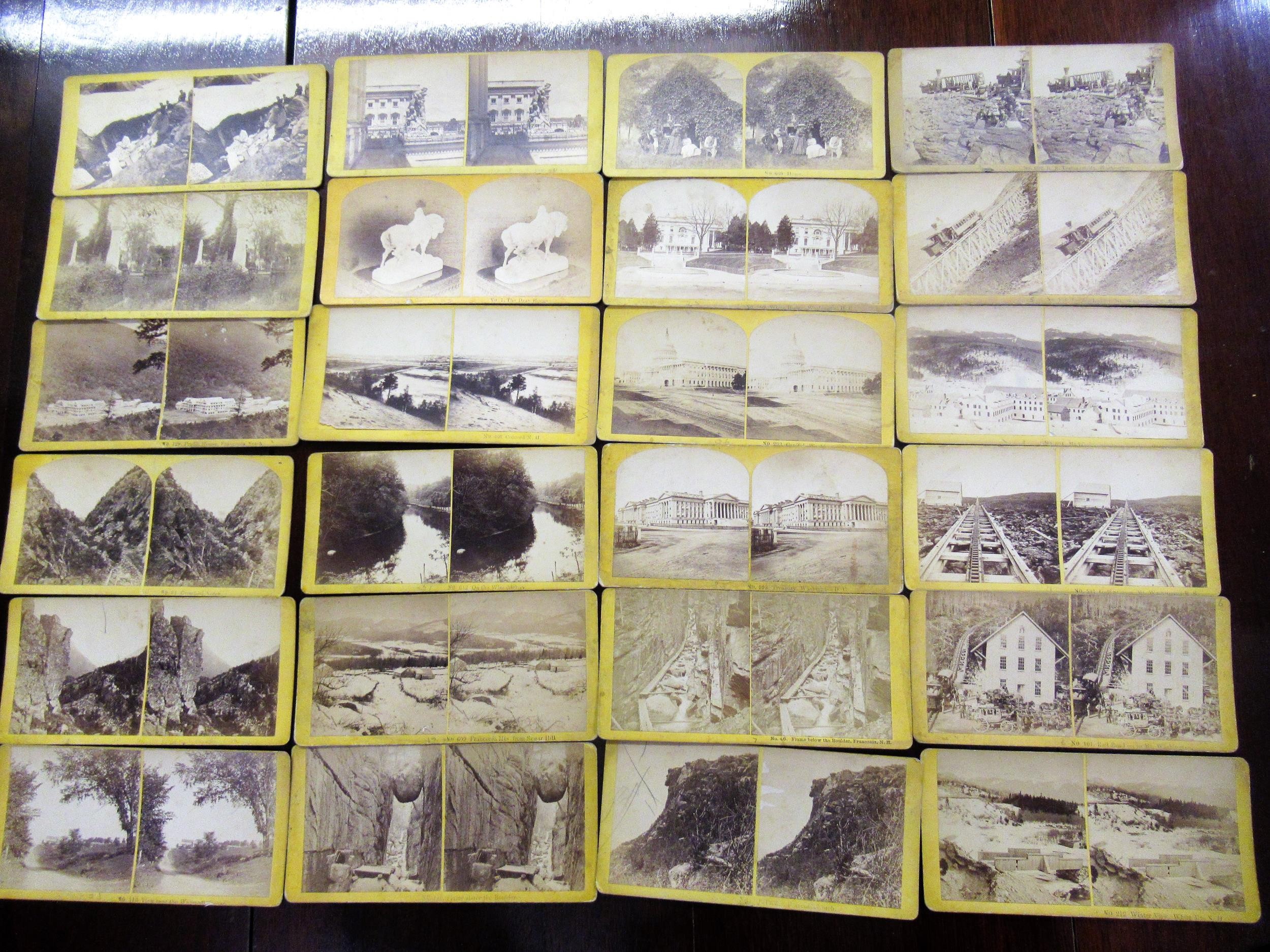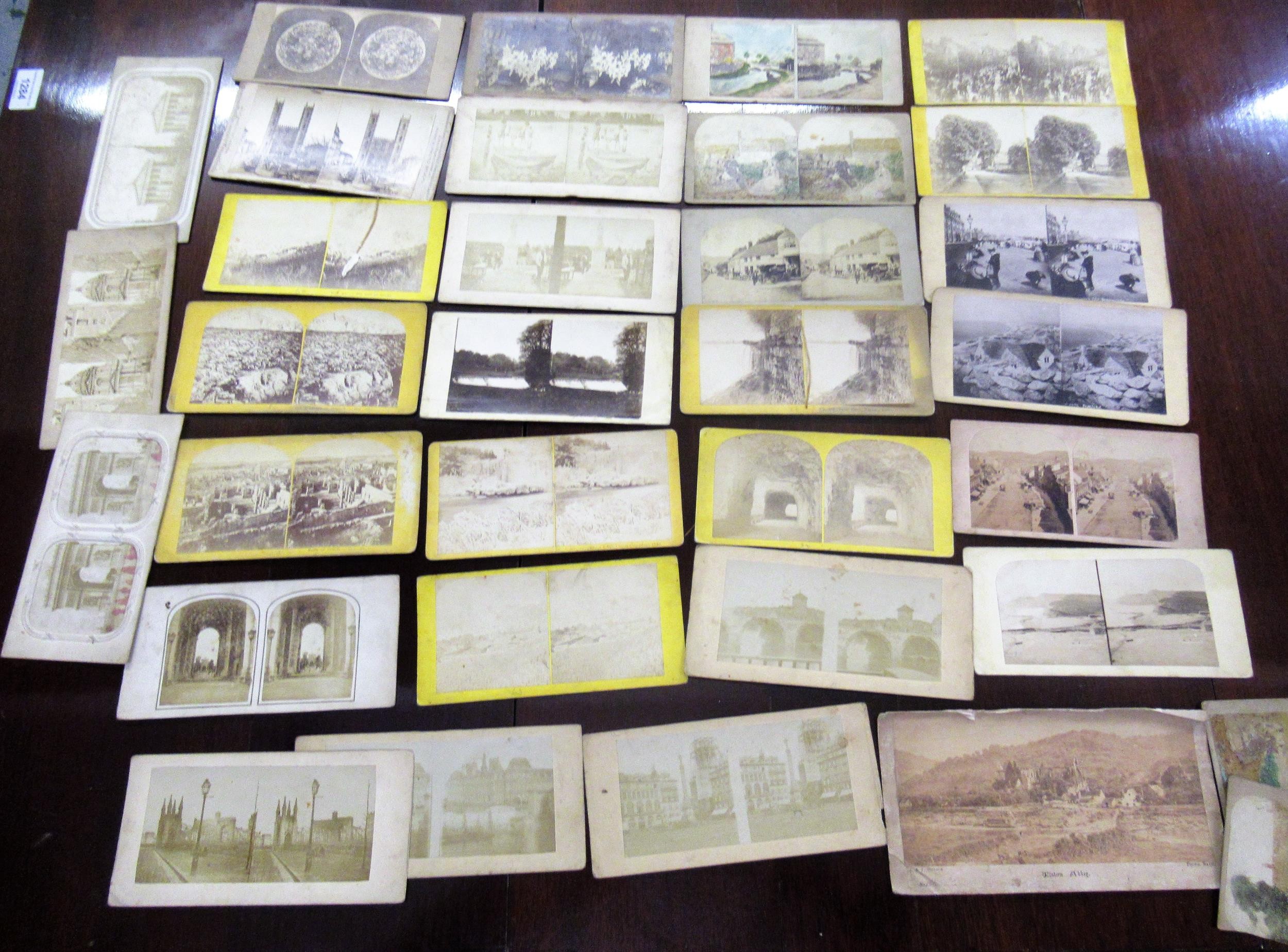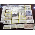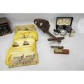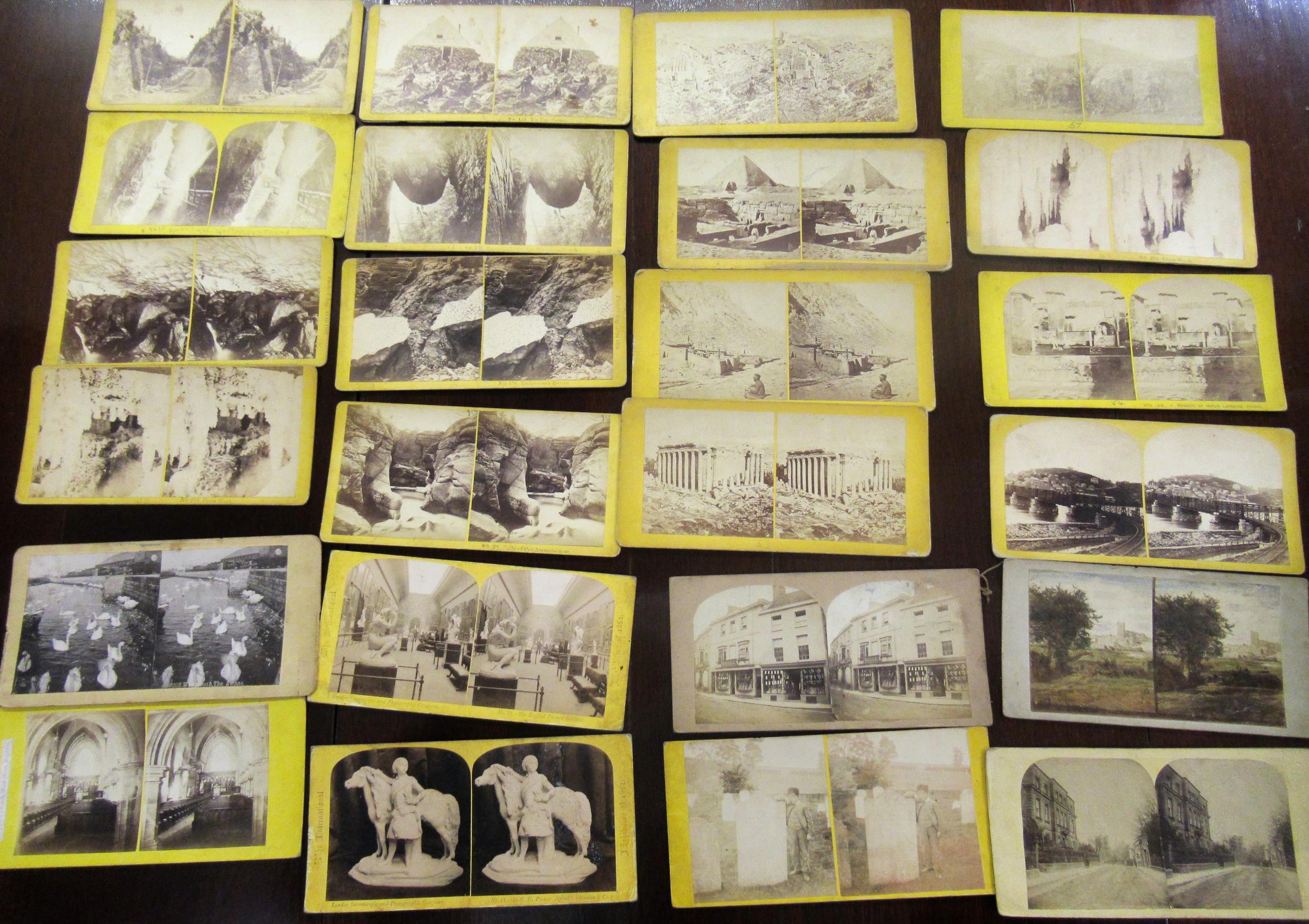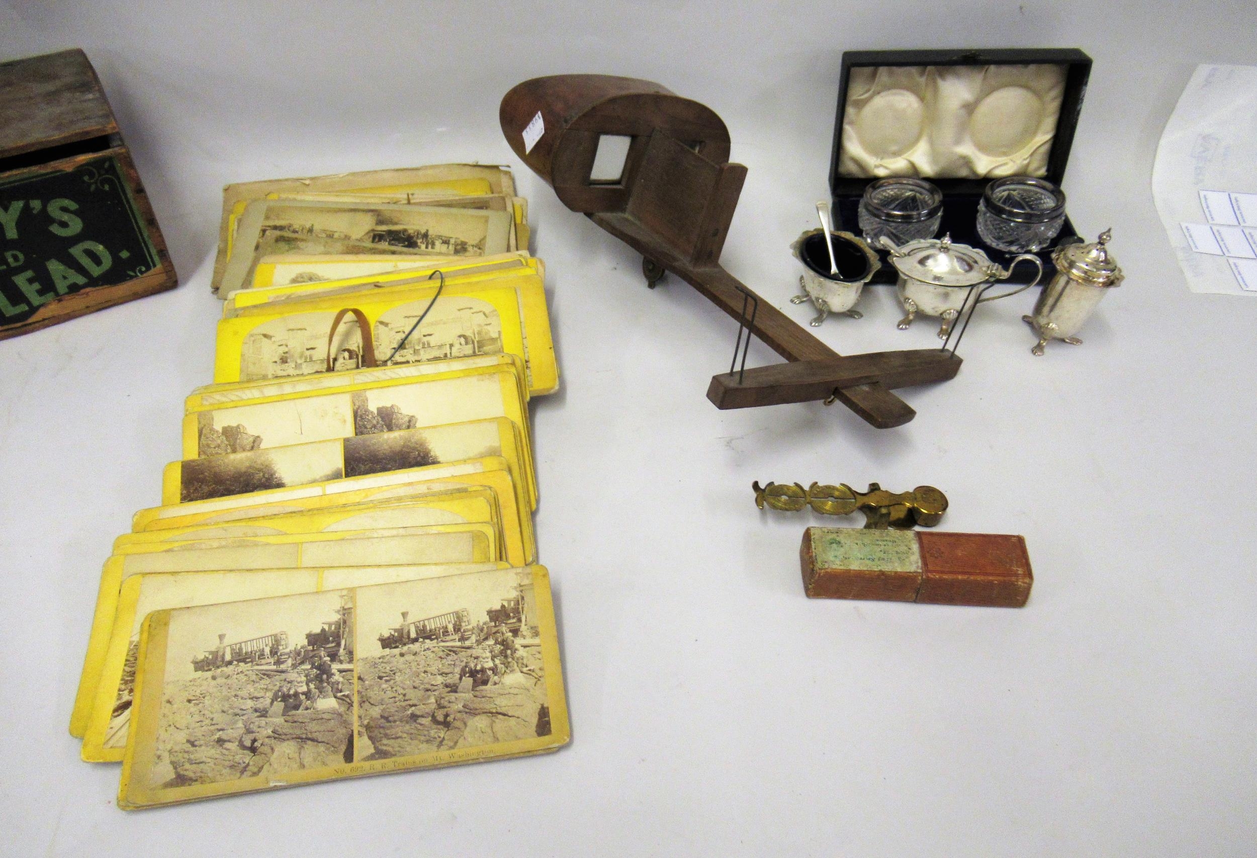 Handheld stereoscopic viewer (at fault), together with a box containing a collection of stereoscopic cards including American views, a cased pair of coin scales and two condiment sets