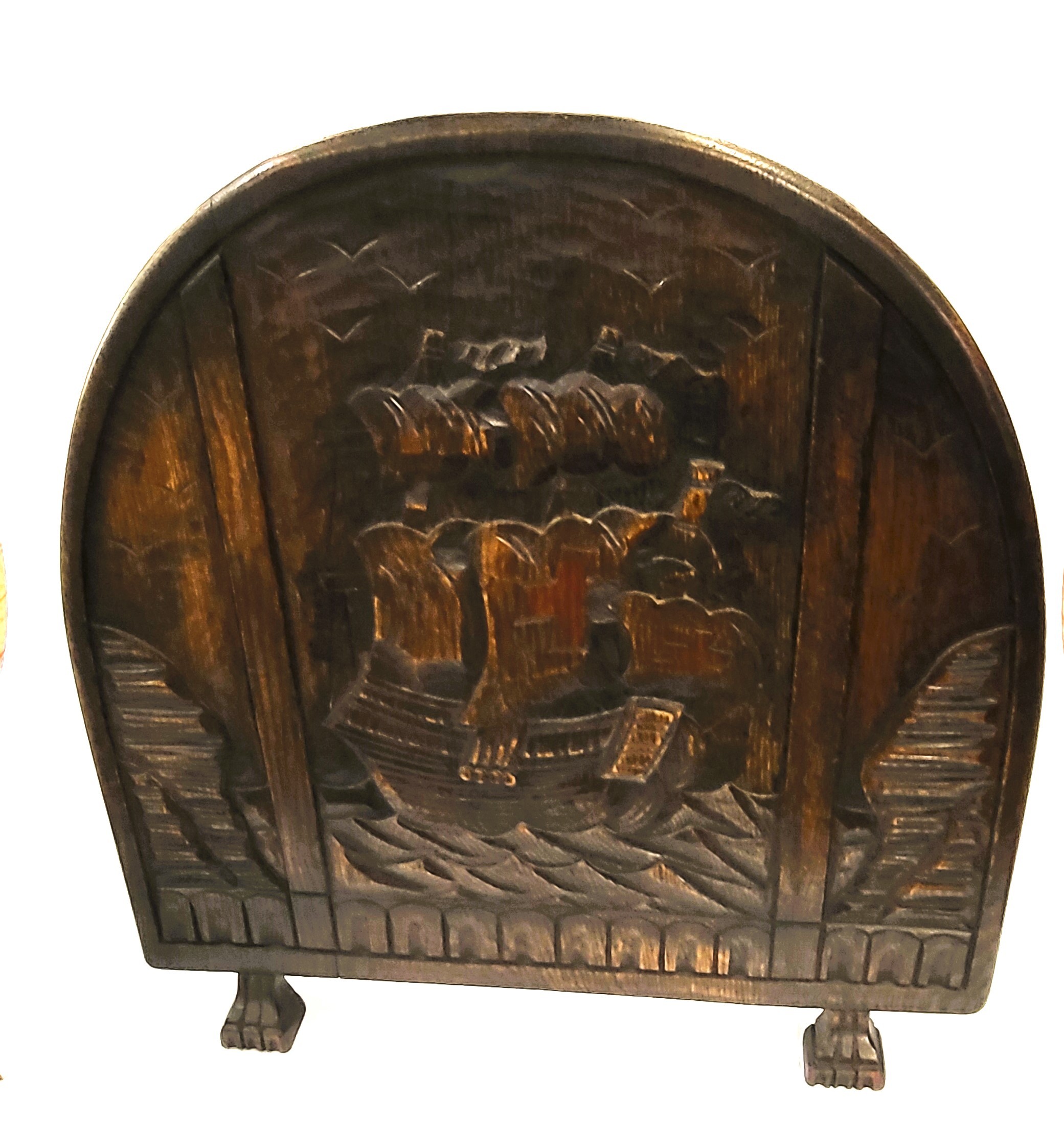 An oak fire screen depicting a sailing vessel. 68 x 68cm.