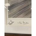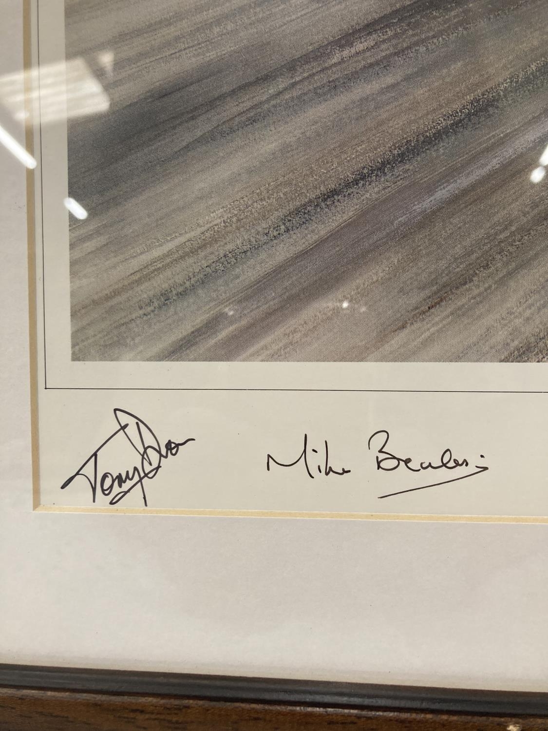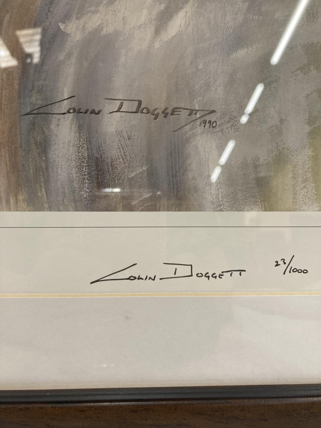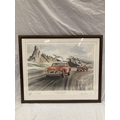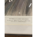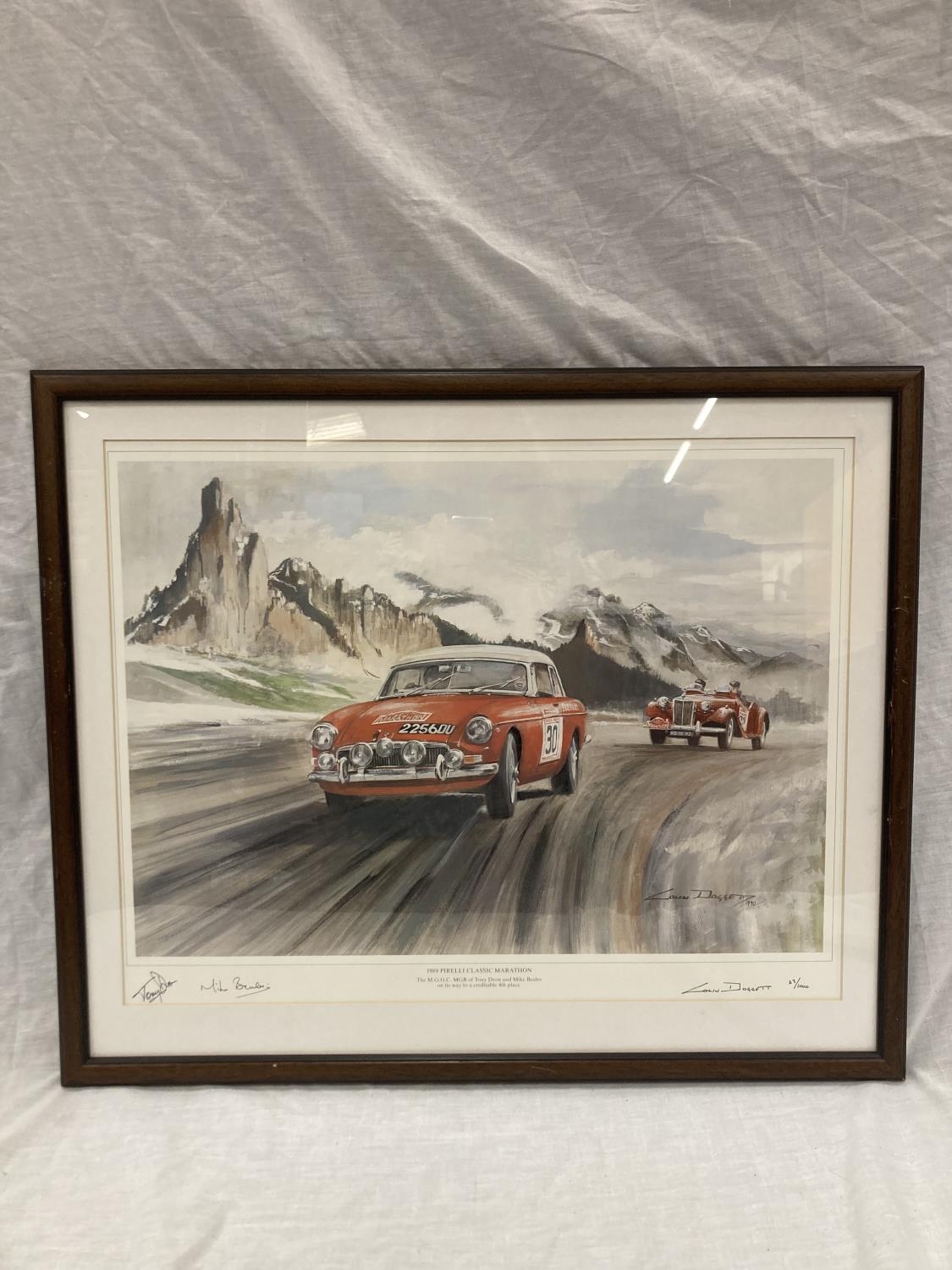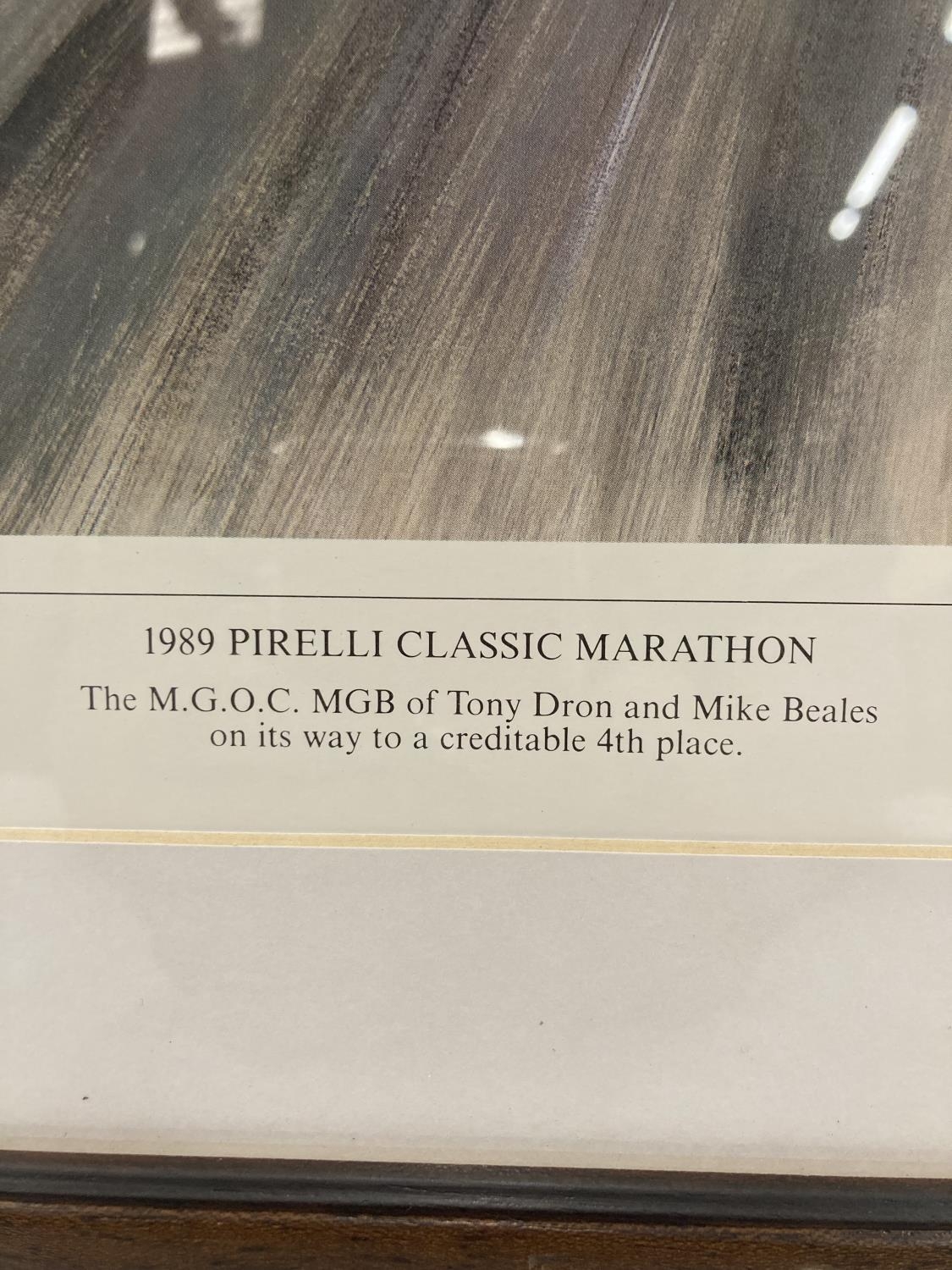 A FRAMED LIMITED EDITION 23/1000 PRINT OF THE 1989 PIRELLI CLASSIC MARATHON, SHOWING THE M. G. O. C. MGB OF TONY DRON AND MIKE BEALES WHO FINISHED FOURTH. SIGNED BY TONY DRON, MIKE BEALES AND COLIN DOGGETT (THE ARTIST)