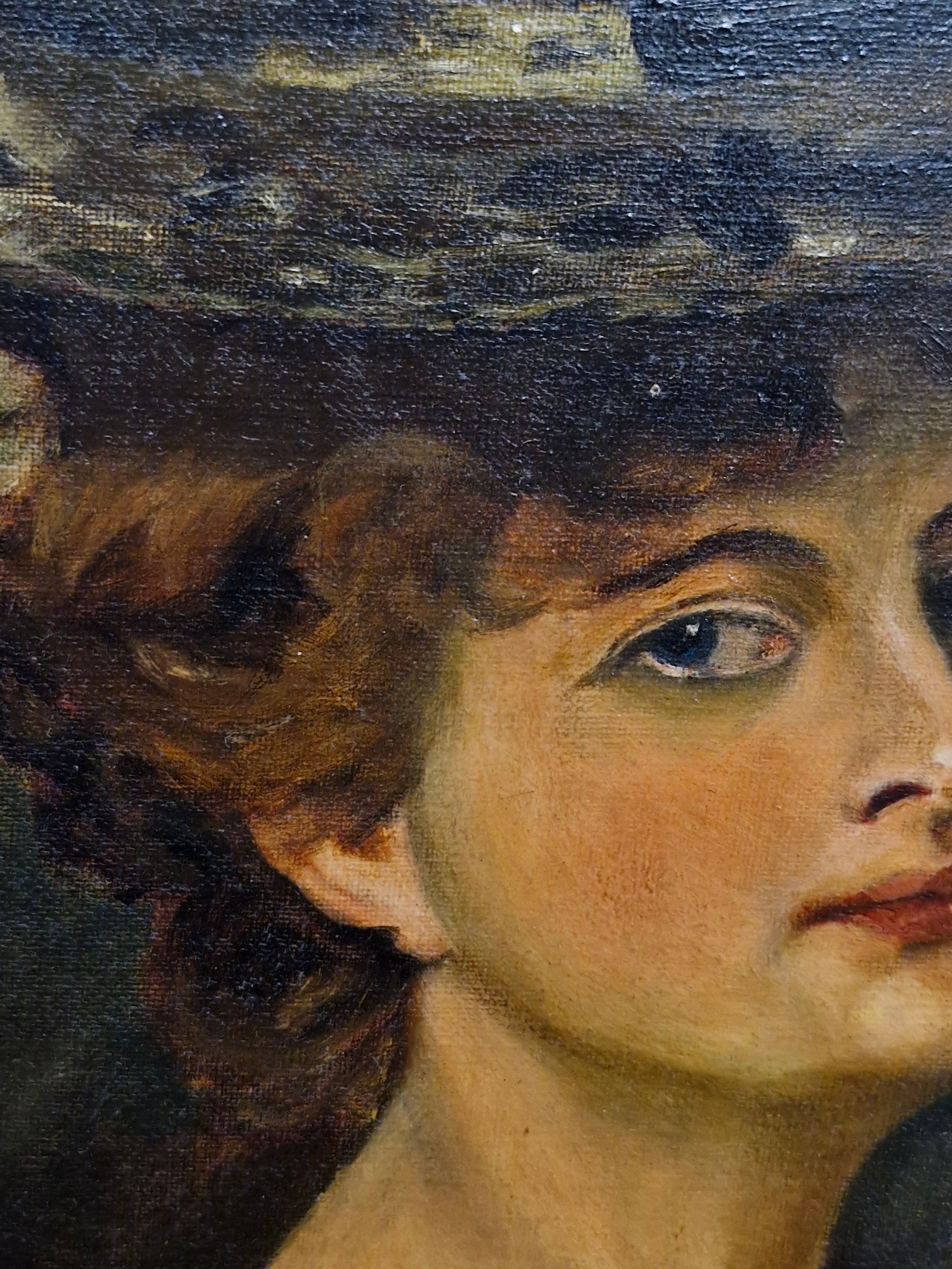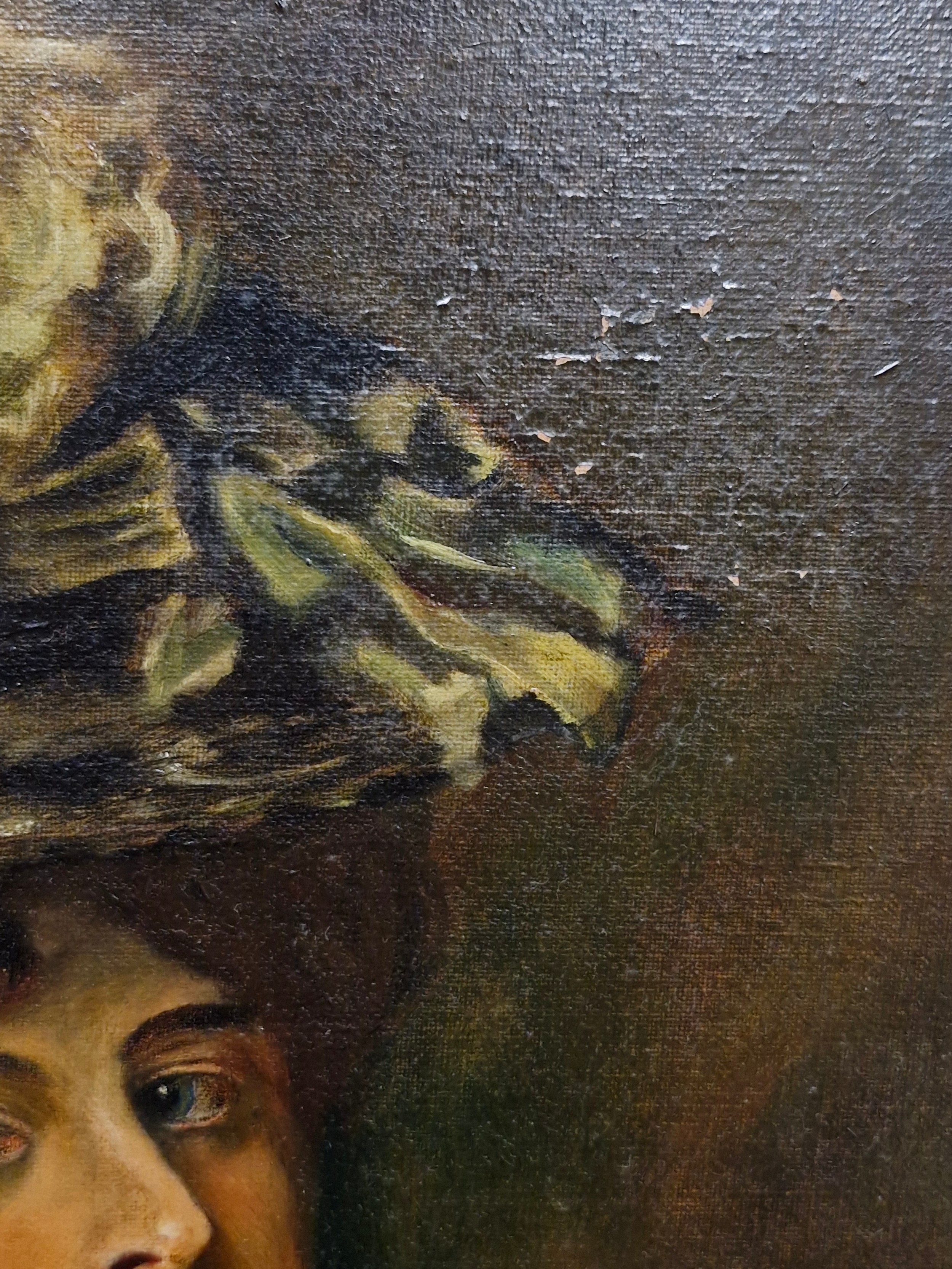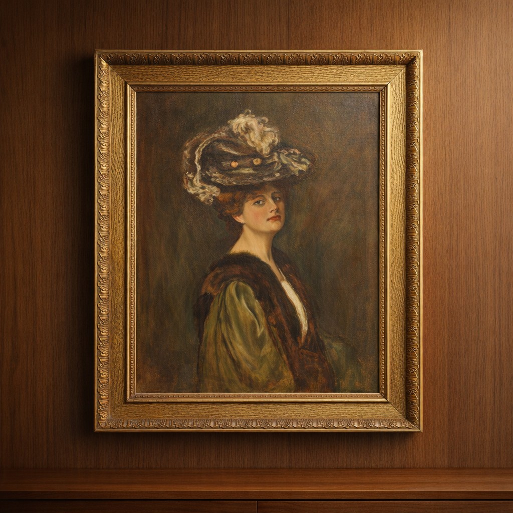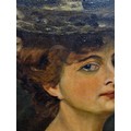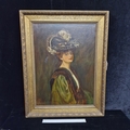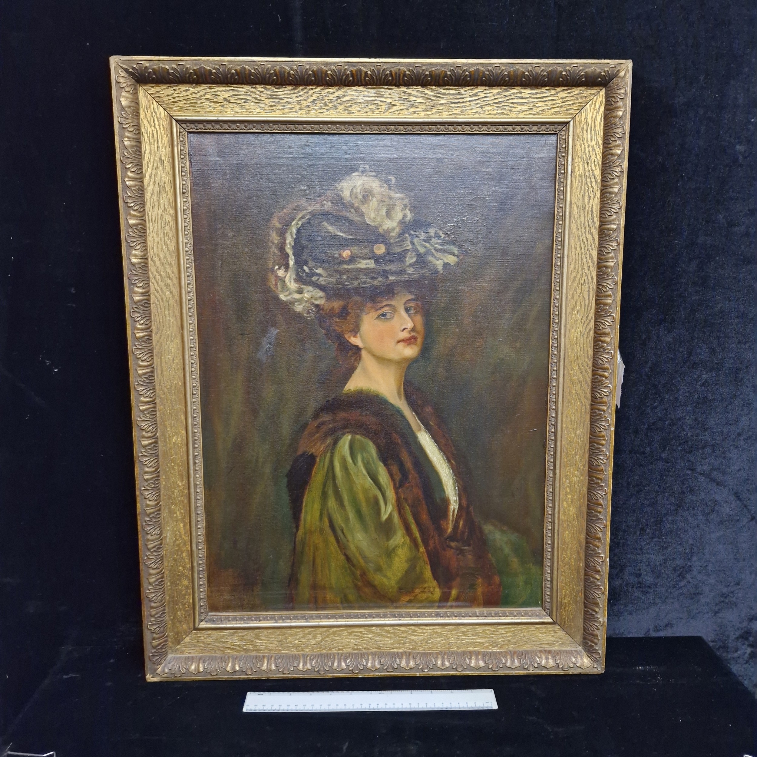 Super Star Lot: A fine and beautiful 19th century oil on canvas painting after an Alfred Schwartz (German b.1833) portrait titled 'Nathalie'. Features the well observed 'Portrait of a Lady' with elaborate ostrich feathered hat and fur stole. Titled to verso and housed in a molded agapanthus leaf gilt frame. Small repair to canvas but not noticeable from front. Beautiful Work.