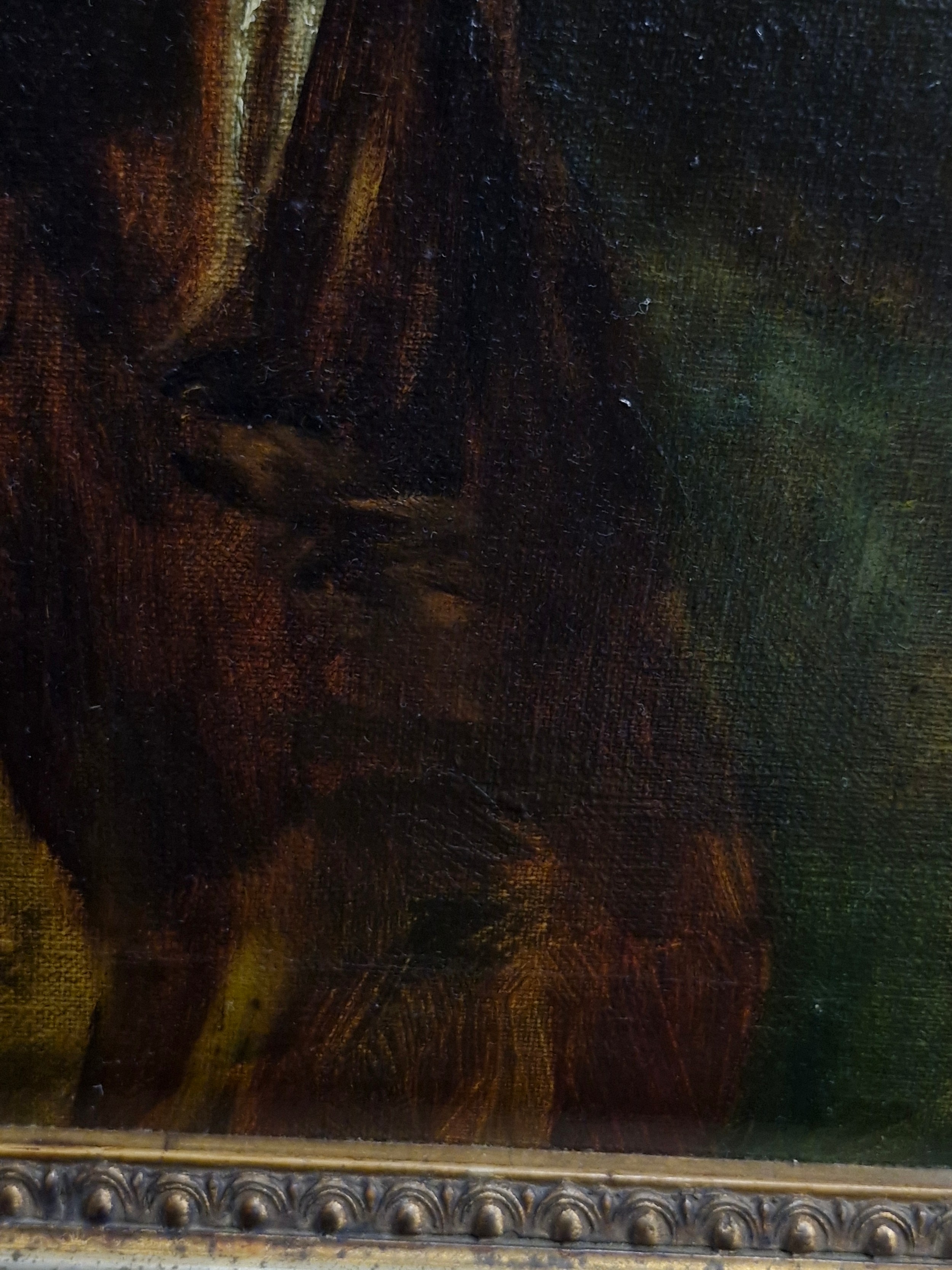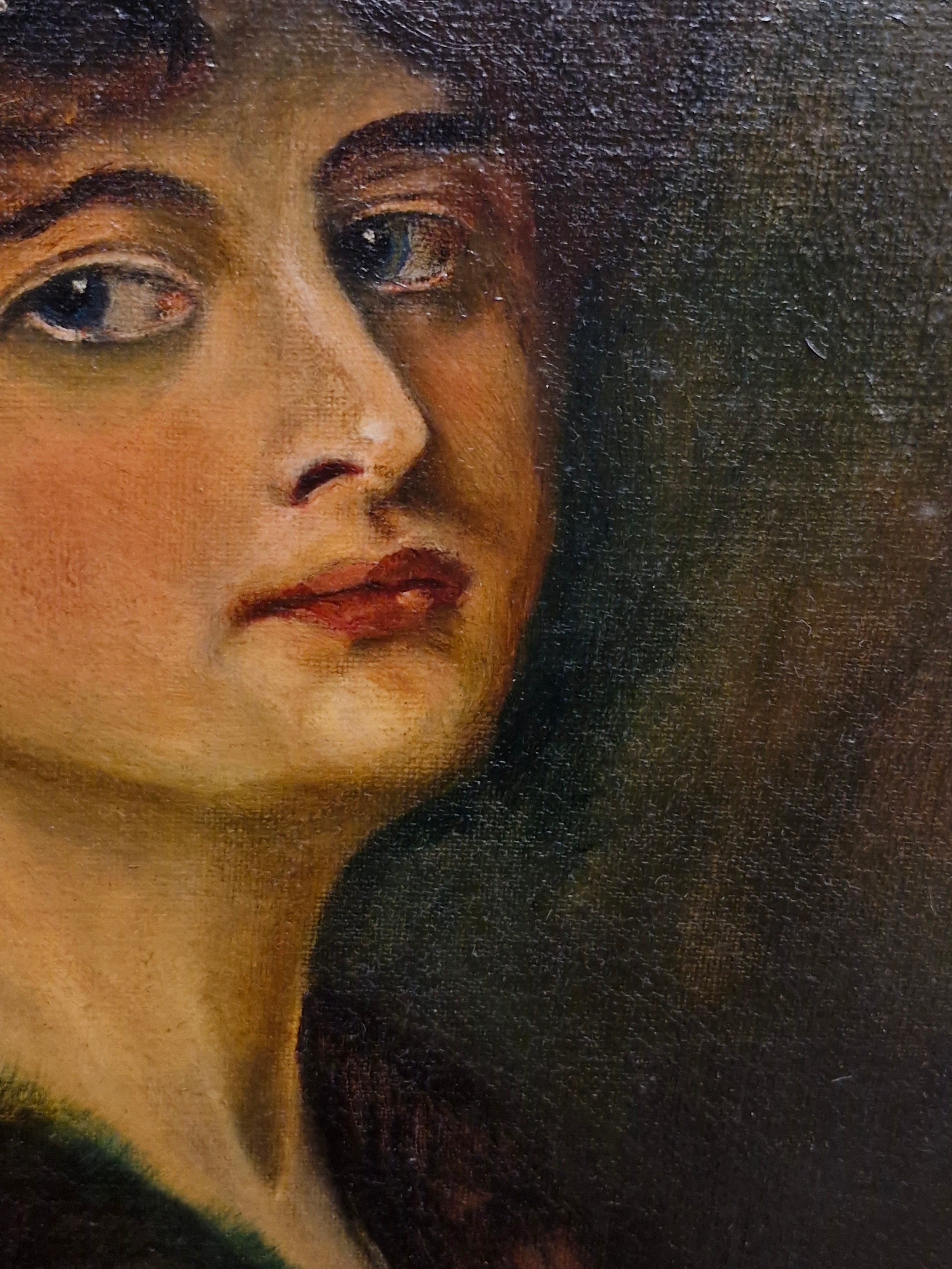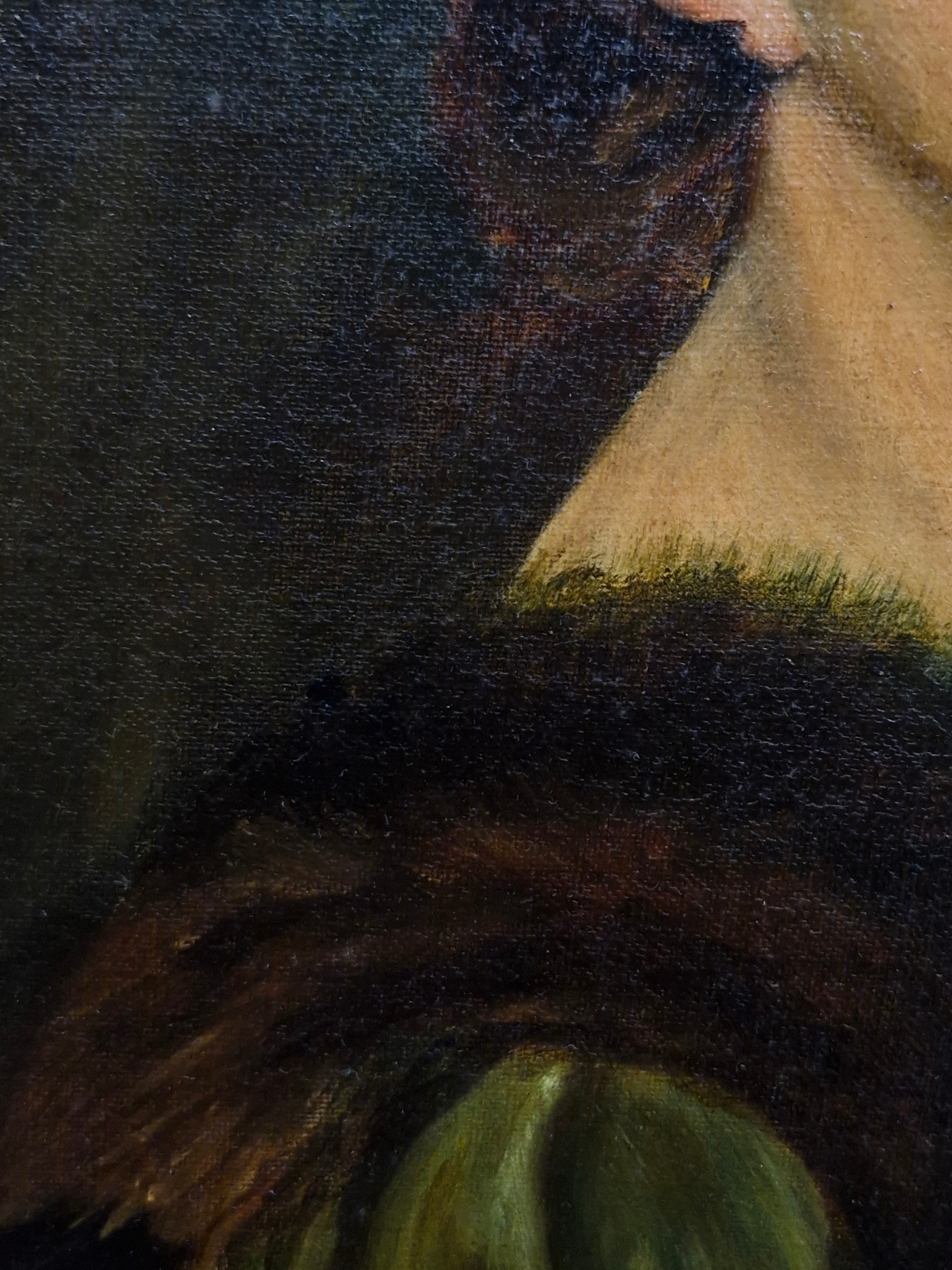 Super Star Lot: A fine and beautiful 19th century oil on canvas painting after an Alfred Schwartz (German b.1833) portrait titled 'Nathalie'. Features the well observed 'Portrait of a Lady' with elaborate ostrich feathered hat and fur stole. Titled to verso and housed in a molded agapanthus leaf gilt frame. Small repair to canvas but not noticeable from front. Beautiful Work.