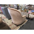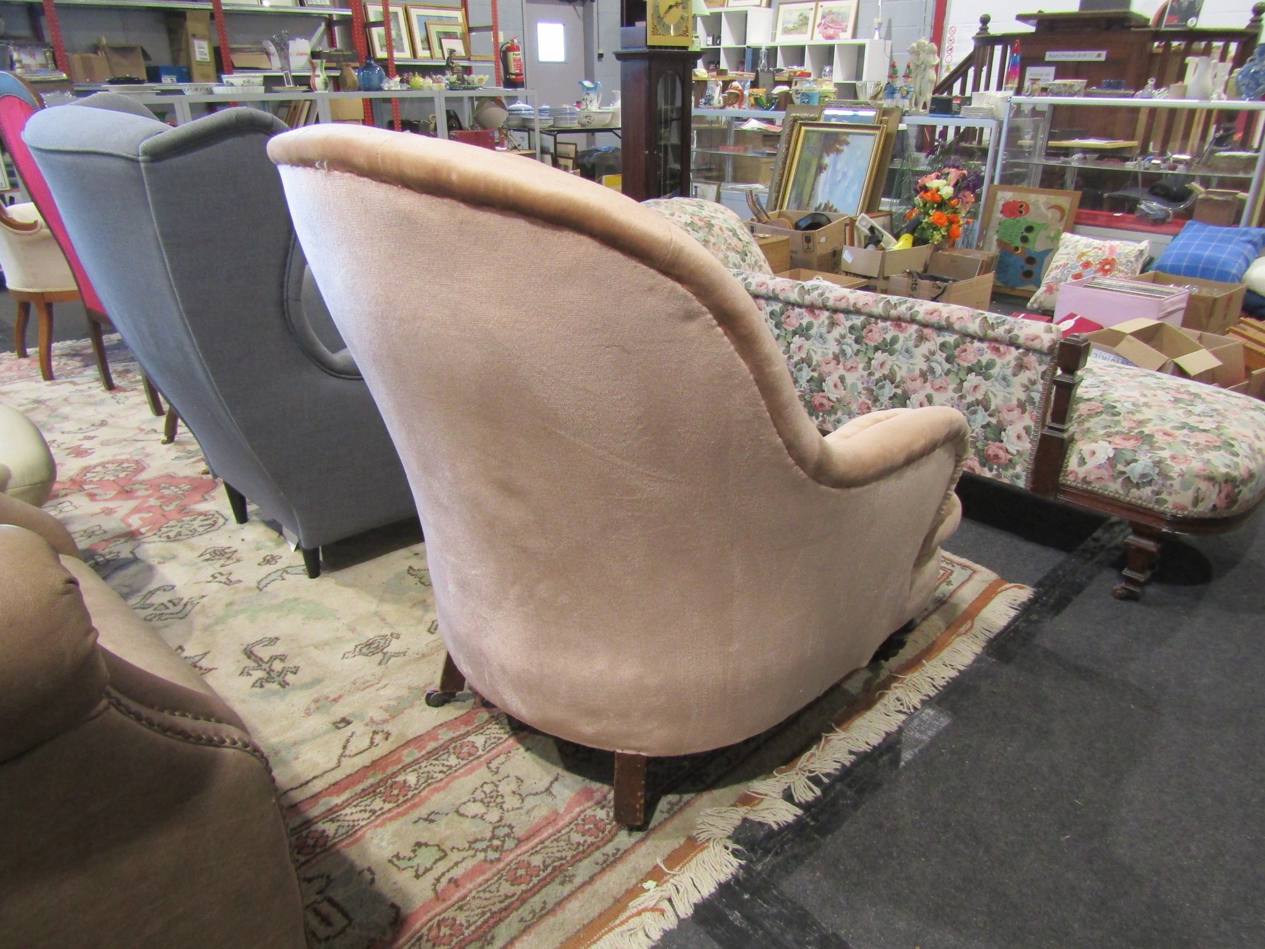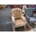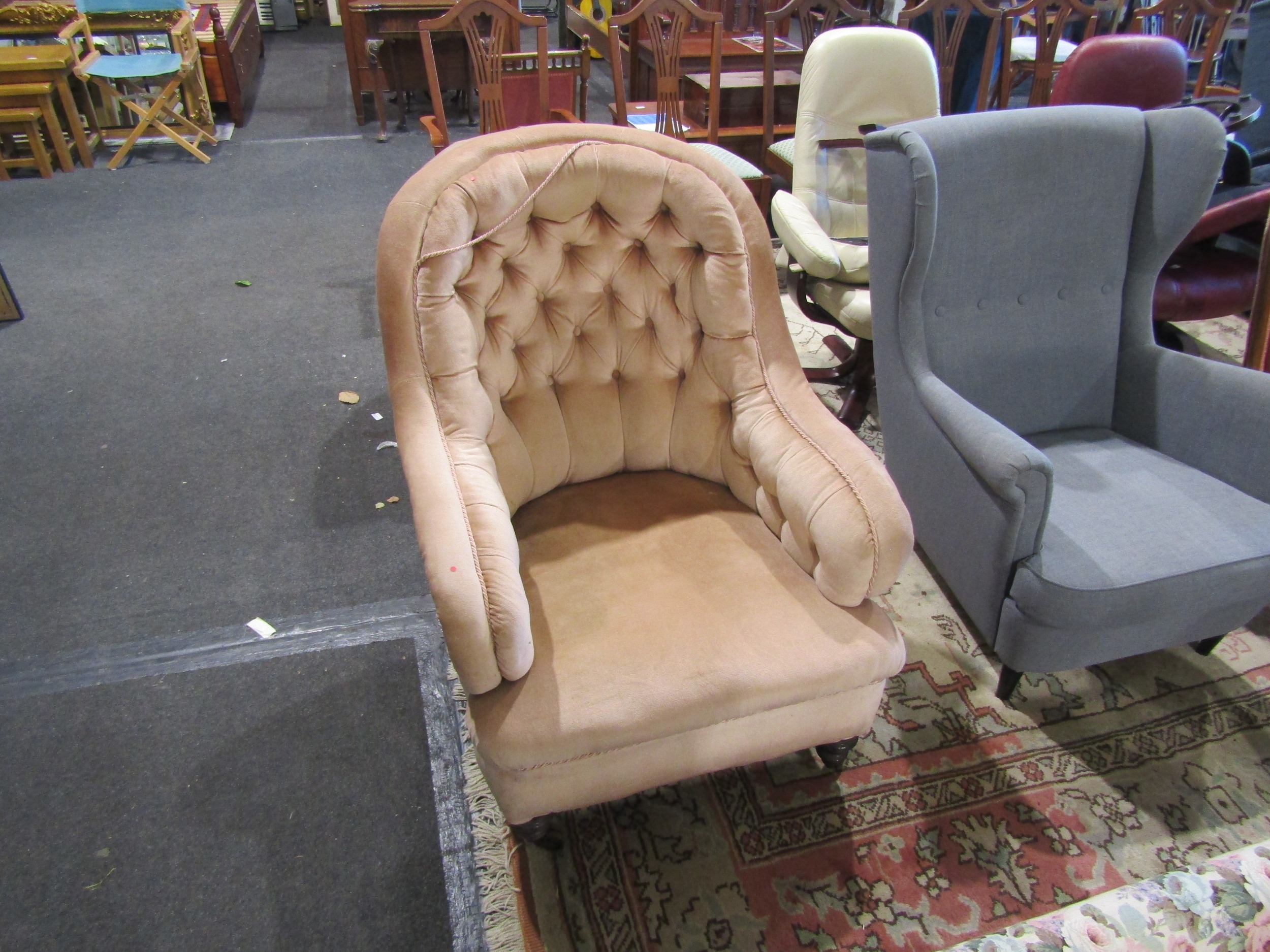 WITHDRAWN - A Victorian button-back armchair, pale peach velour upholstery, turned supports to castors