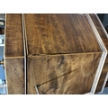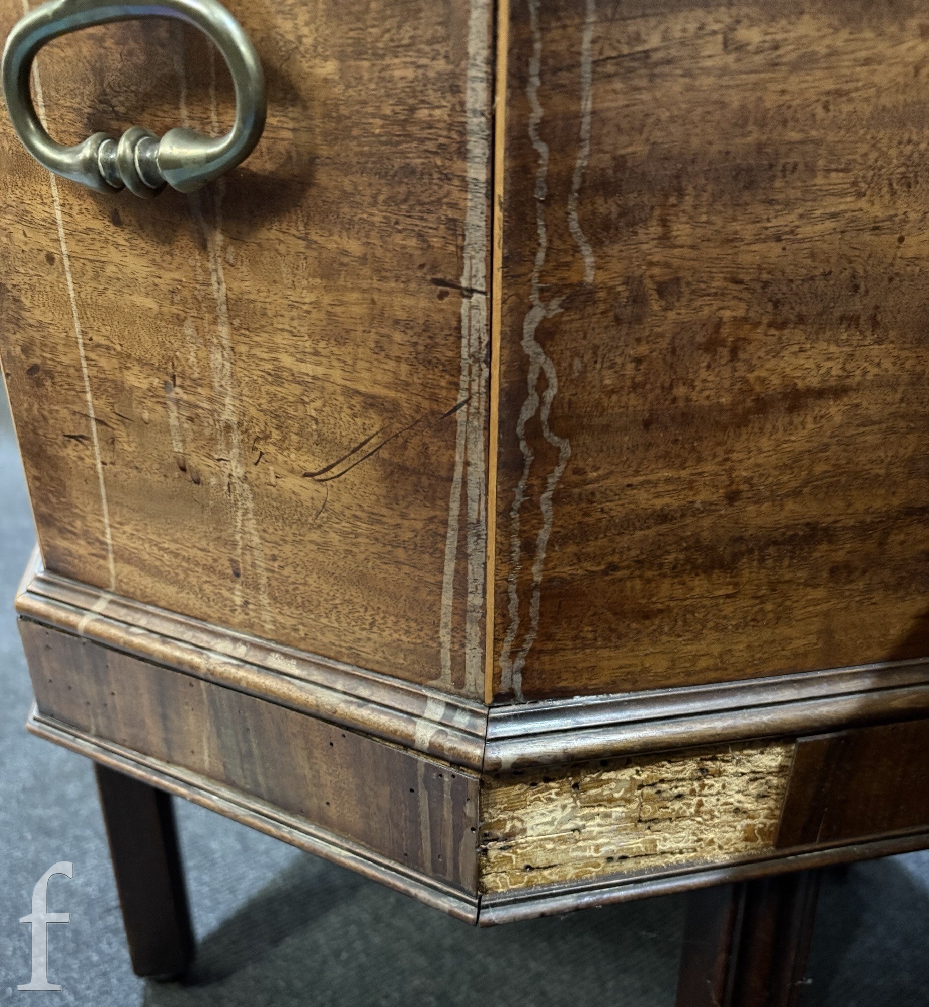 There is a section of cock beading missing from the rear edge of the lid. A section of crossbanded veneer missing from the apron frieze - there are also some old woodworm flight holes to this section as well.
