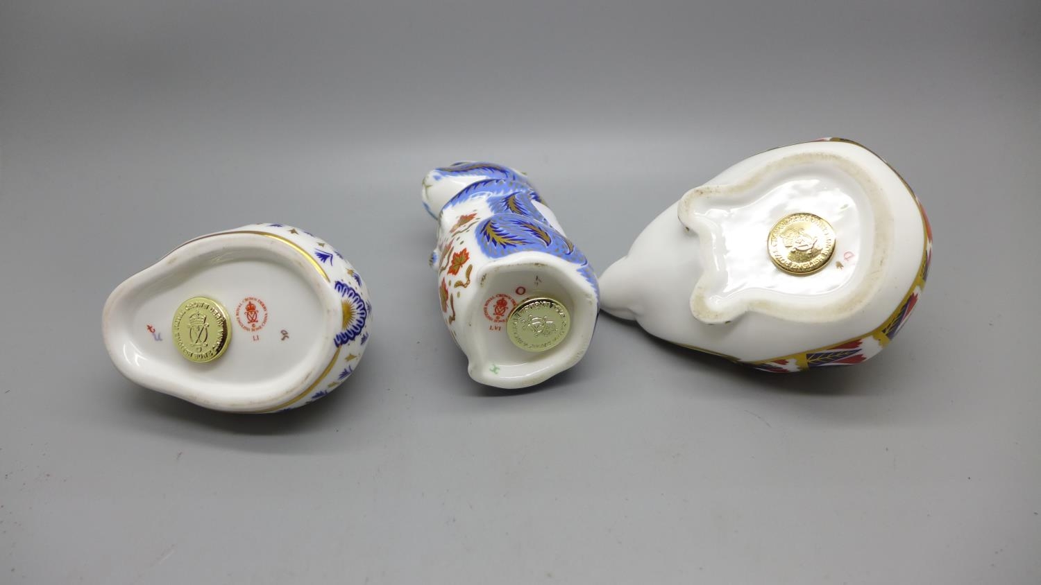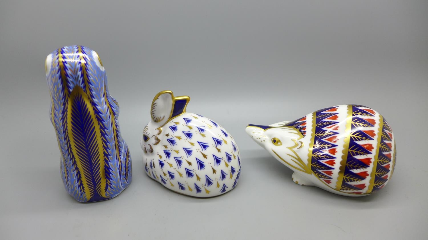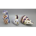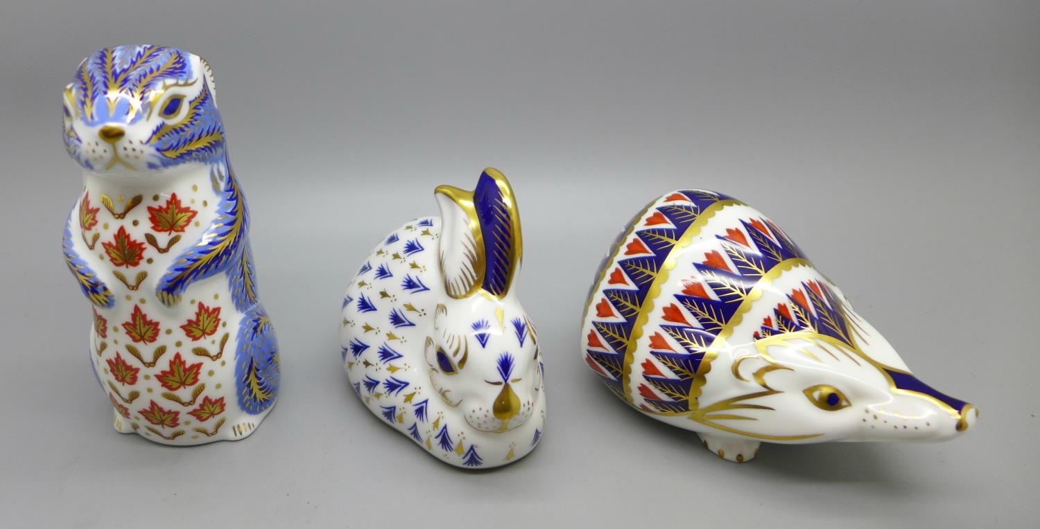Three Royal Crown Derby paperweights, rabbit, hedgehog and chipmunk