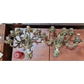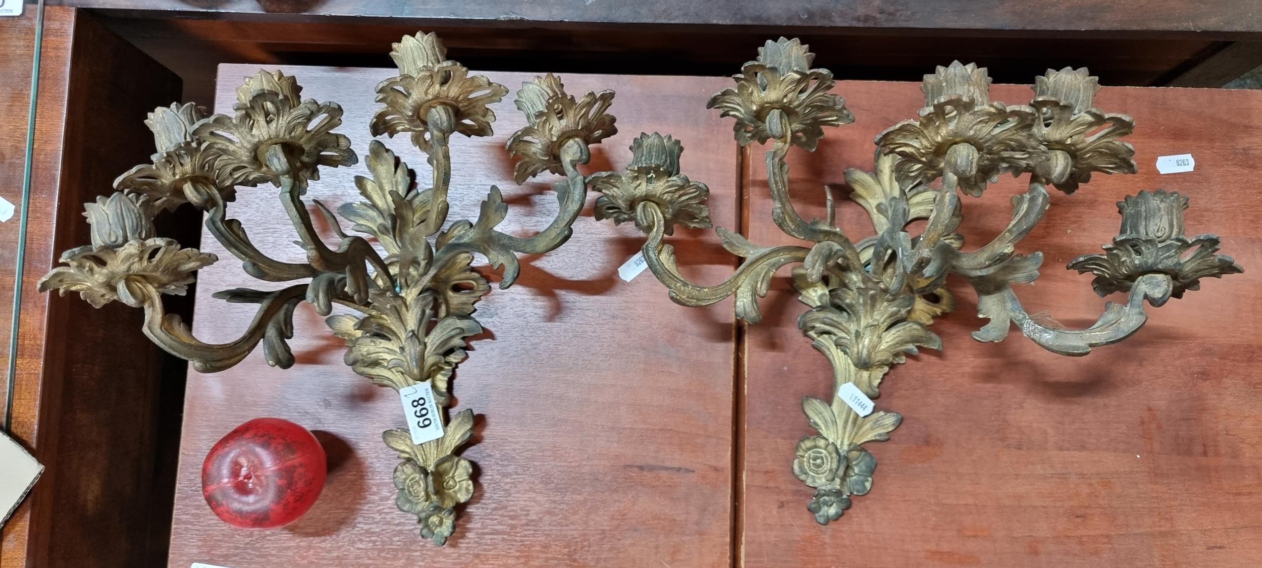Two gorgeous antique French brass wall candle sconces featuring five branches each, boasting organic foliate detail throughout. Would come up lovely with a clean and polish.