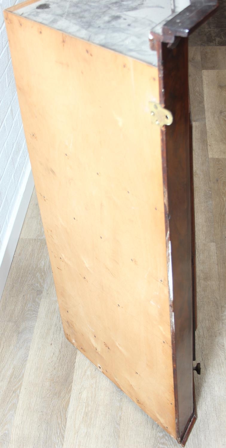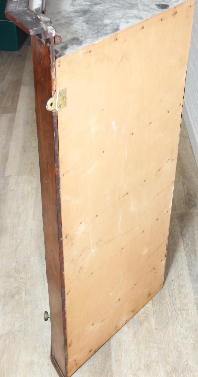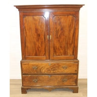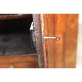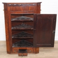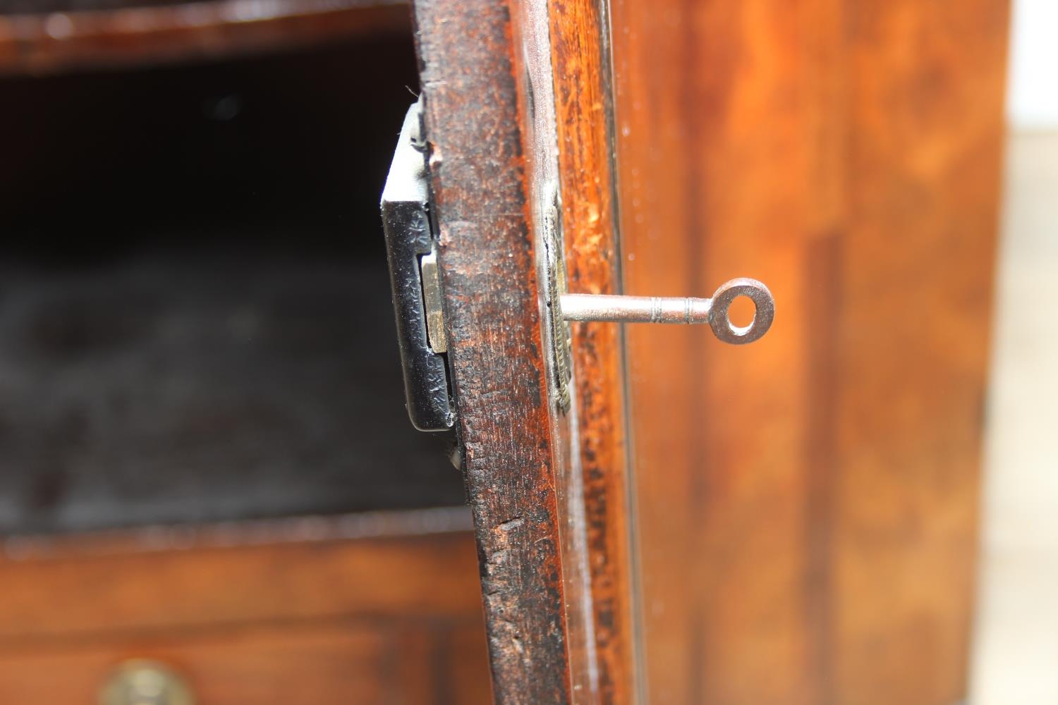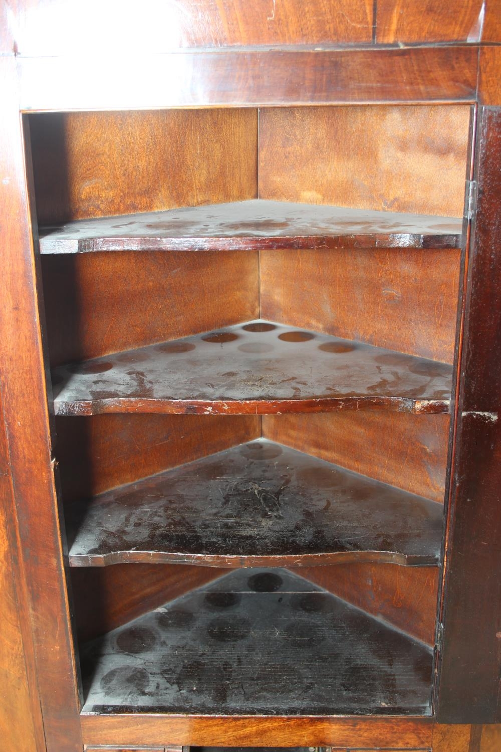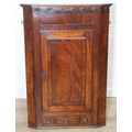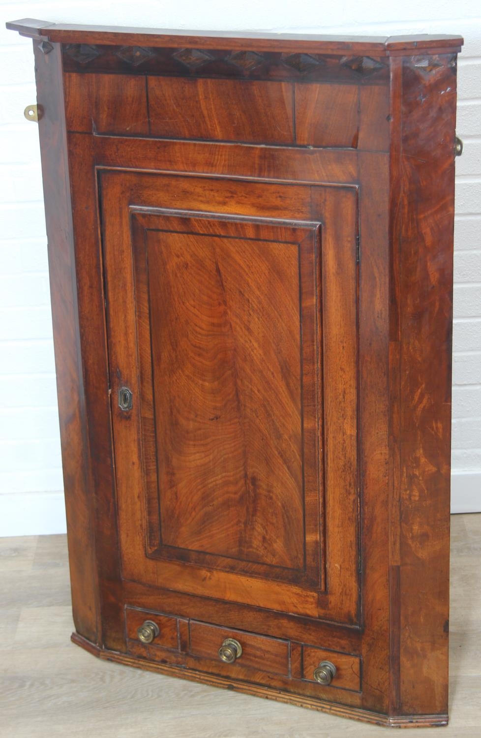 A Georgian mahogany corner cupboard with a central drawer to bottom frieze flanked by two faux drawers, with key, 79cm x 45cm x 117cm