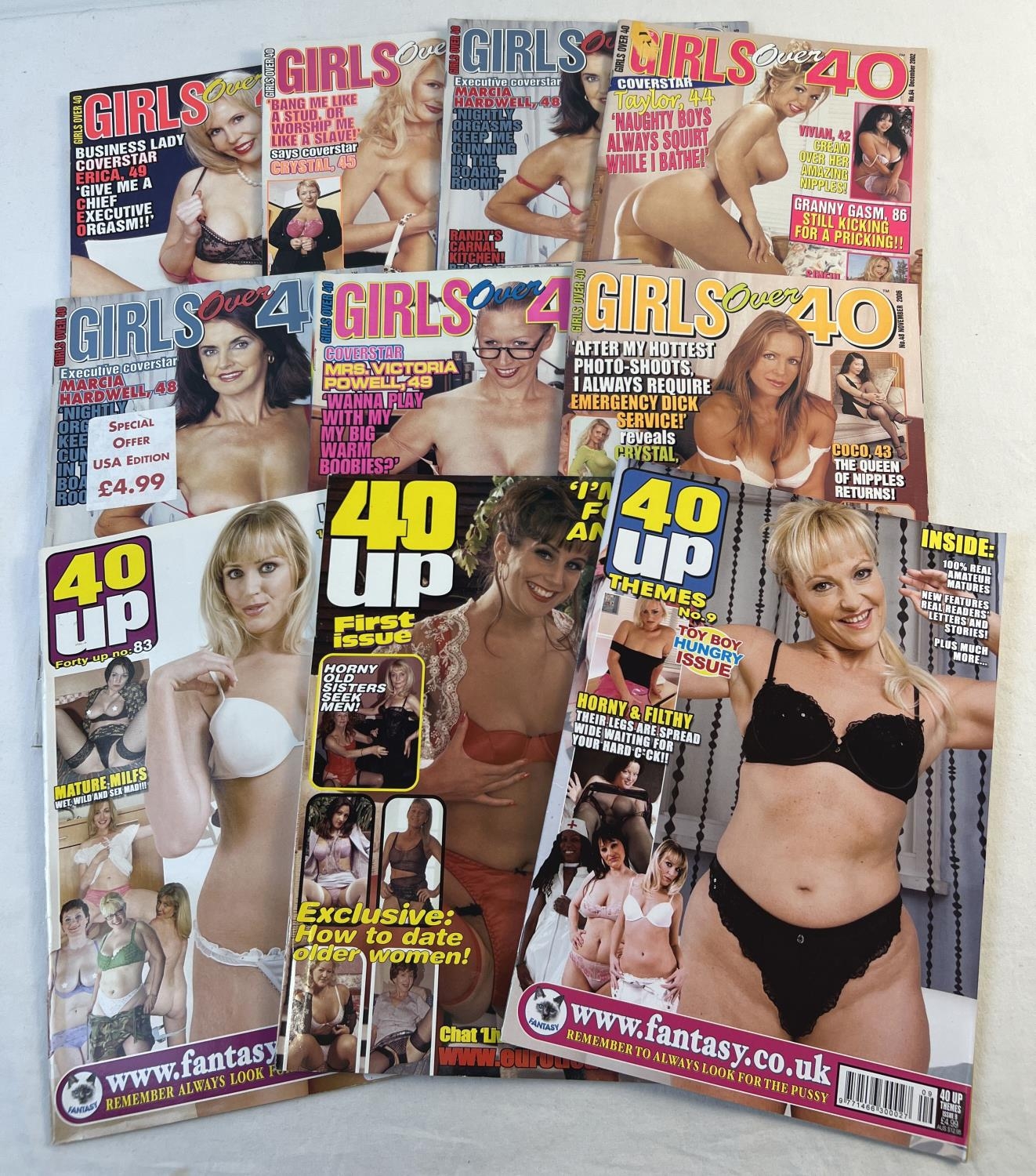 10 assorted adult erotic magazines featuring mature women. 7 issues of Girls Over 40 together with 3 issues of 40 Up.