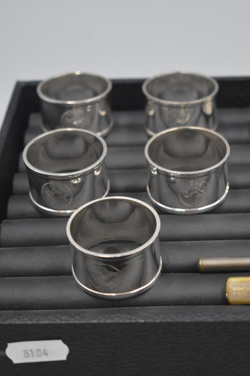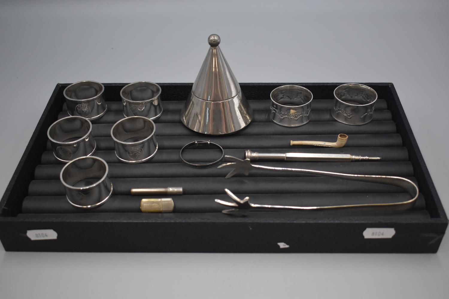 Collectors Tray including Nasonic Napkin Rings, Silver Bracelet, Wembley 1925 Pen, and More