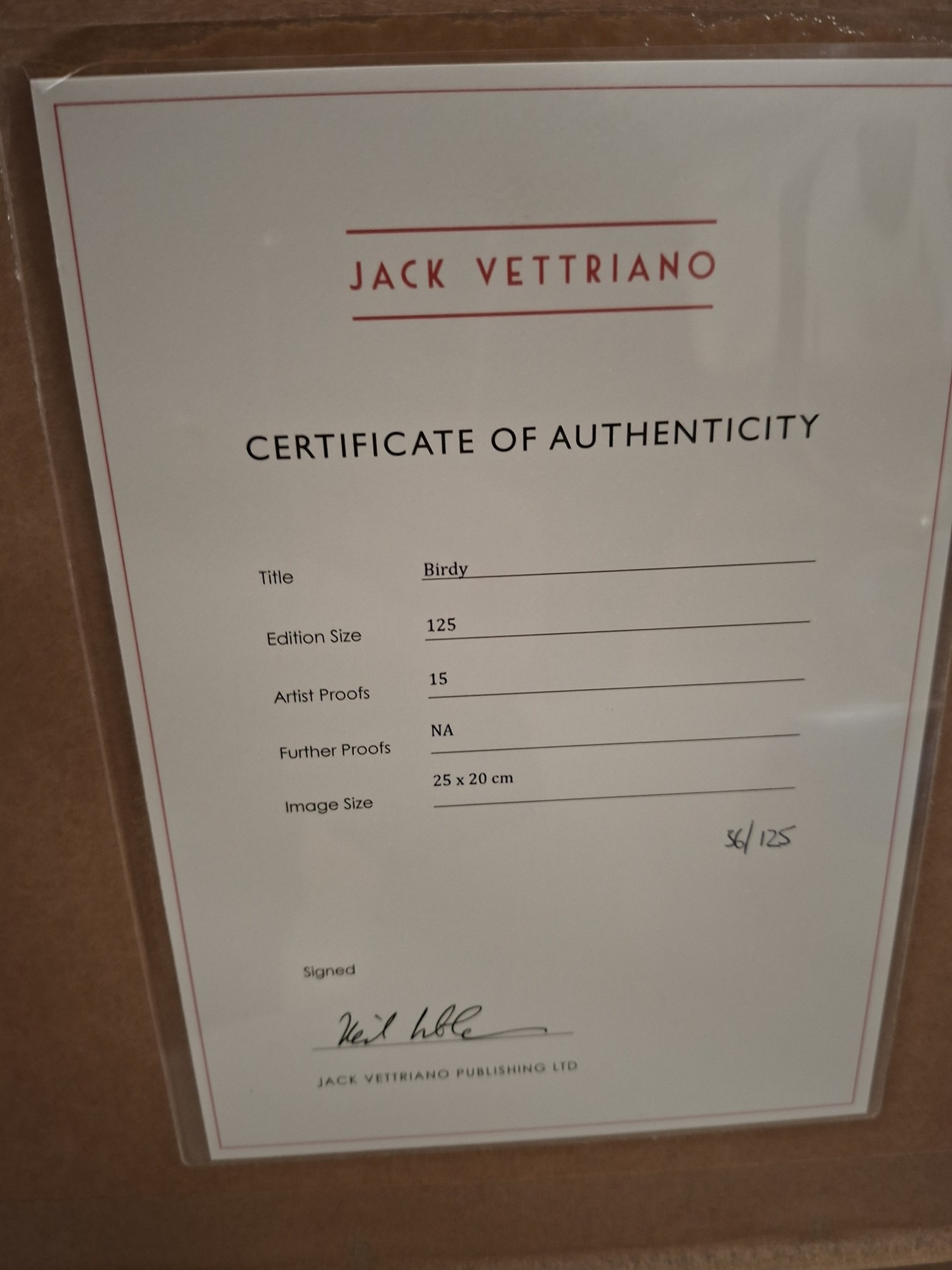 'Birdy' Limited Edition print signed by Jack Vettriano, Framed by Jack Vettriano Publishing. Direct from one collector, prints never hung for display, no. 36/125 with COA.