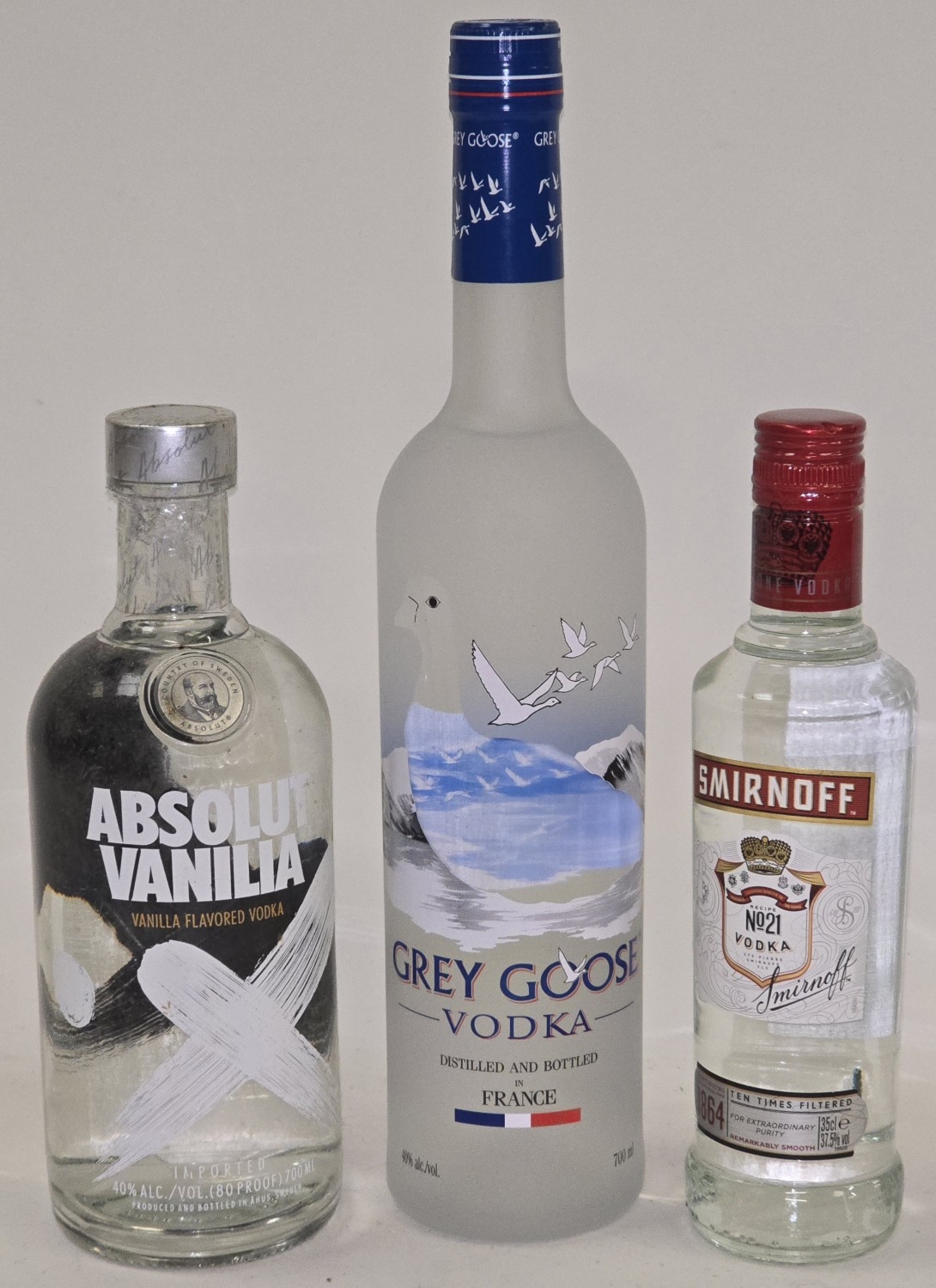 3 x bottles vodka to include Grey Goose 70cl, Absolut Vanilla 70cl and Smirnoff 35cl (REF P97, P80).