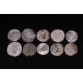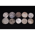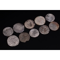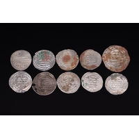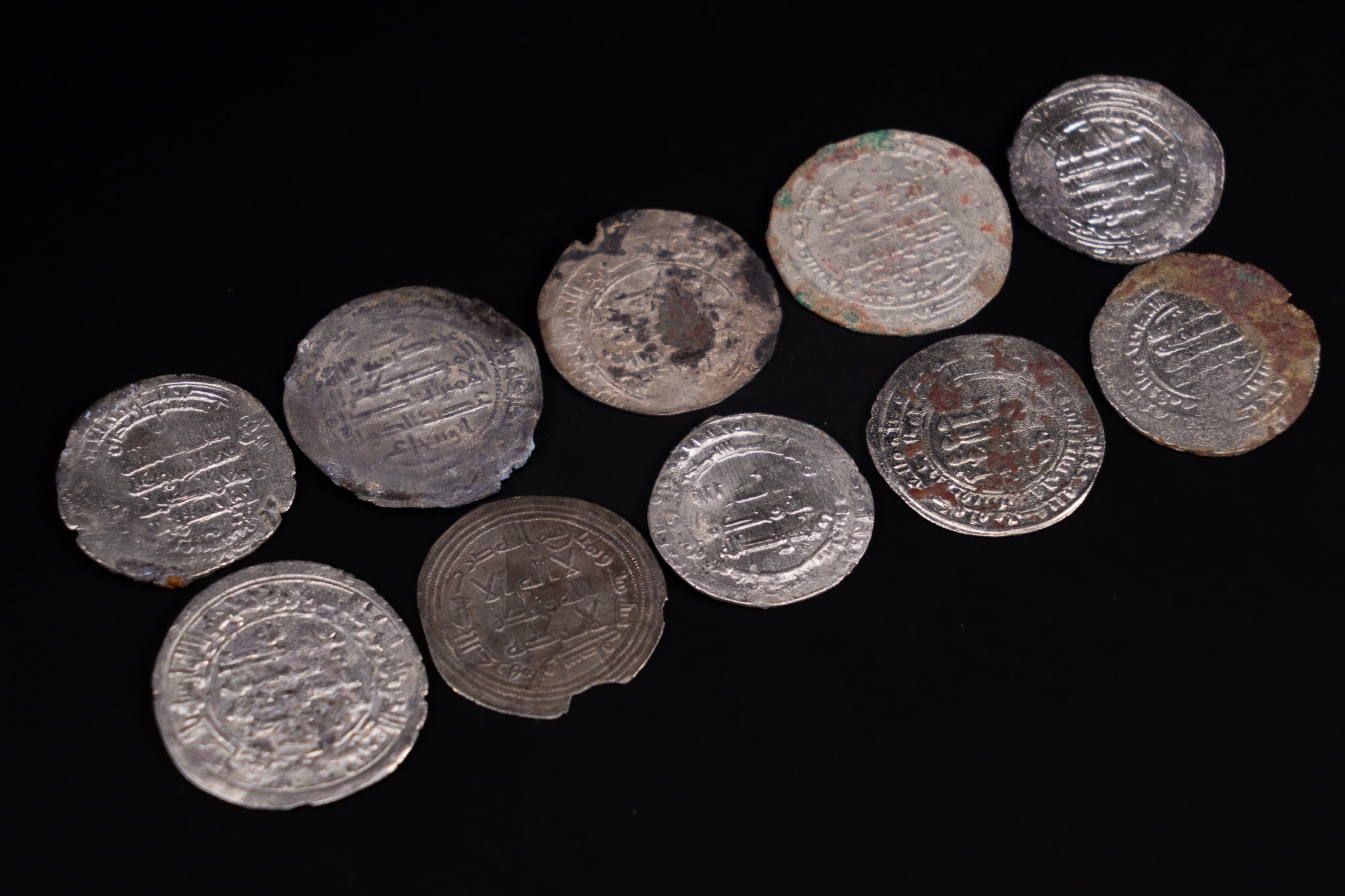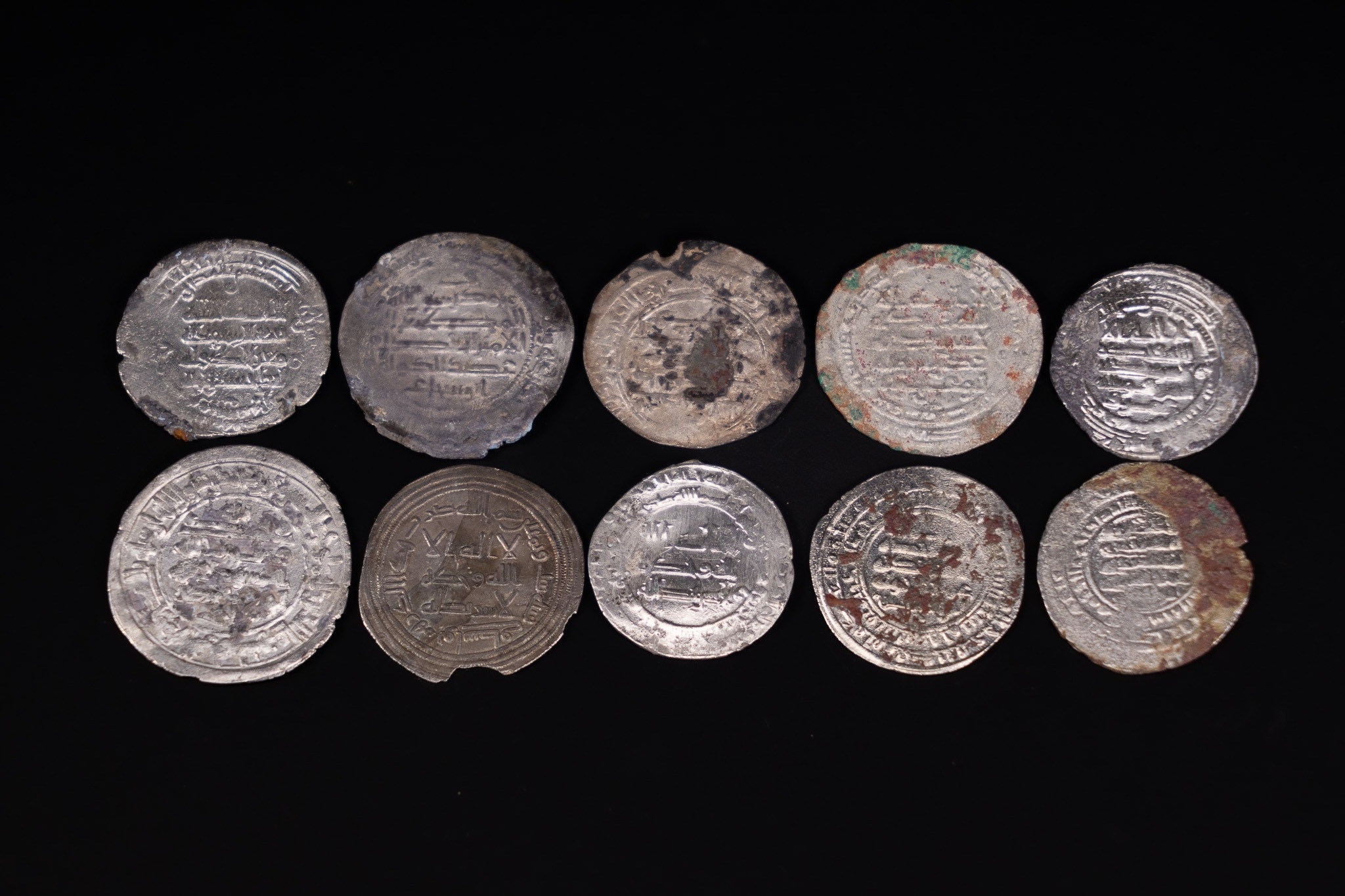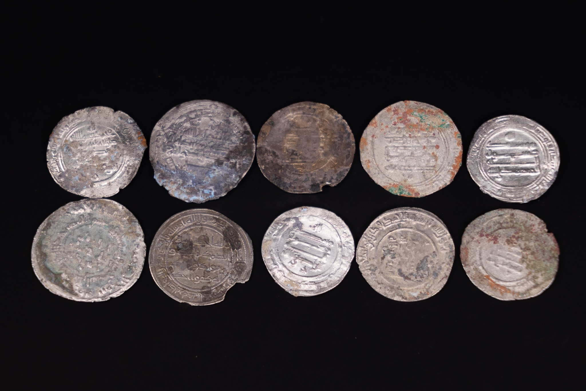 A COLLECTION OF ILKHANID SILVER COINS, MONGOL-IRANIAN, 13THââ¬â14TH CENTURY. - A group of Ilkhanid silver coins from the Mongol Ilkhanate period, dating to the 13thââ¬â14th century. Each coin bears Arabic inscriptions arranged in concentric and horizontal bands, including religious formulas and mint details characteristic of Ilkhanid coinage. The coins are struck on irregular flans, with variation in size and shape throughout the group. Surfaces display a range of tones from bright silver to darker areas, with visible oxidation, encrustation, and wear across several examples.