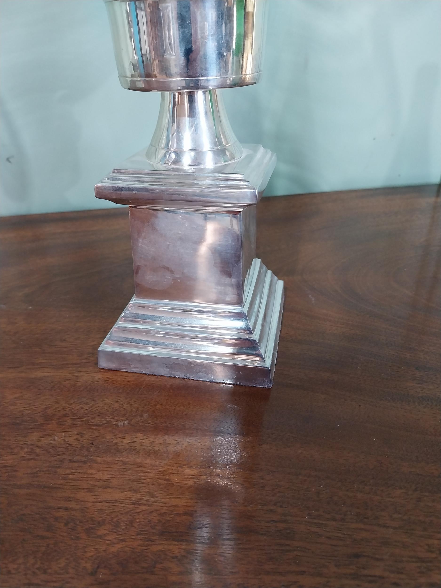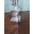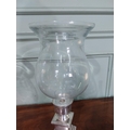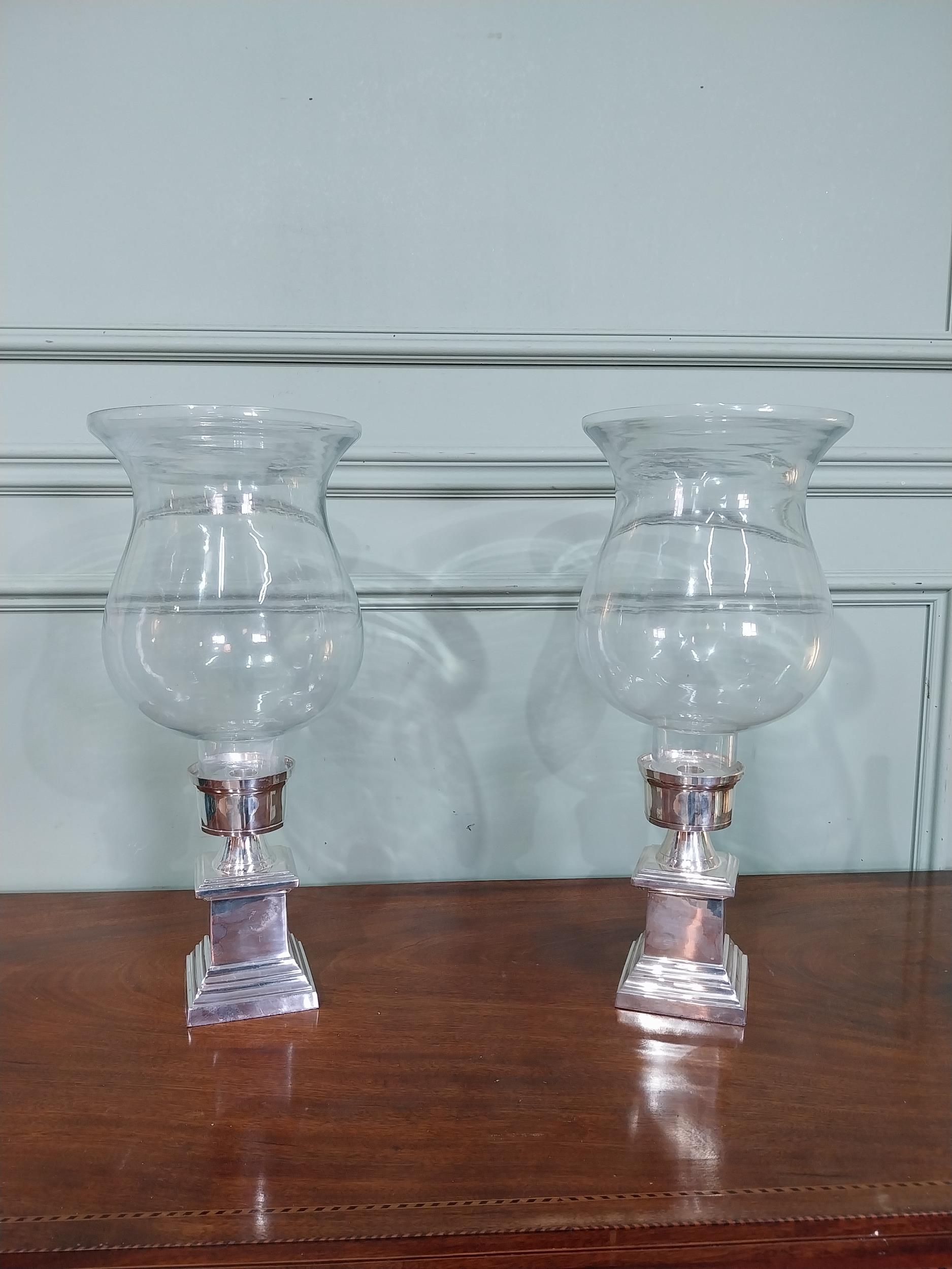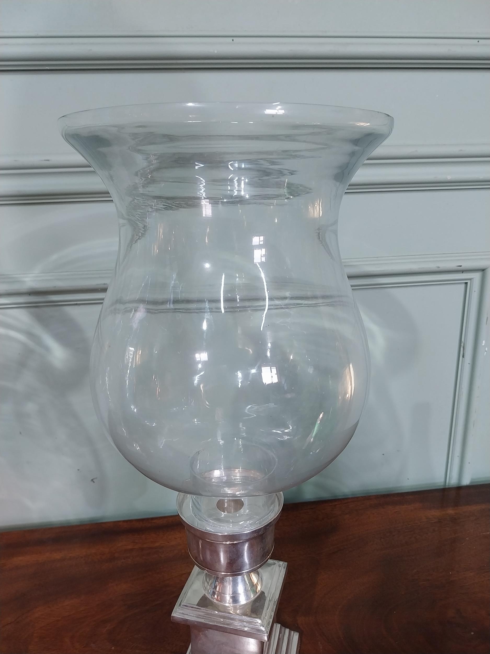 Pair of chrome and glass candle holders. {48 cm H x 21 cm Dia.}.