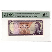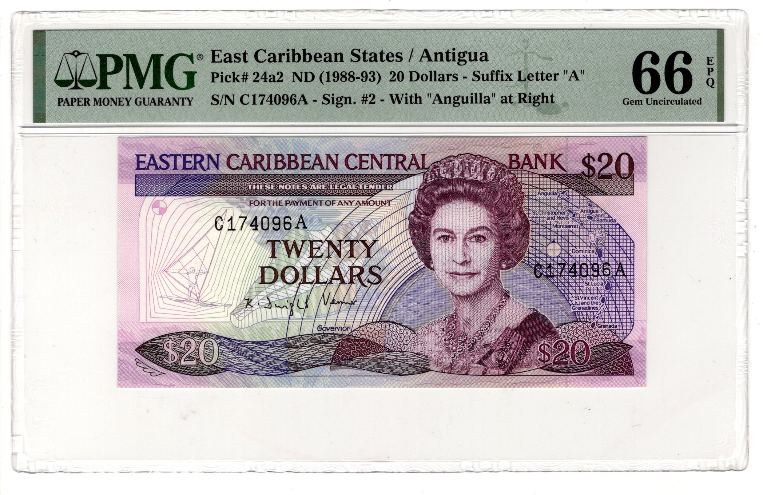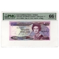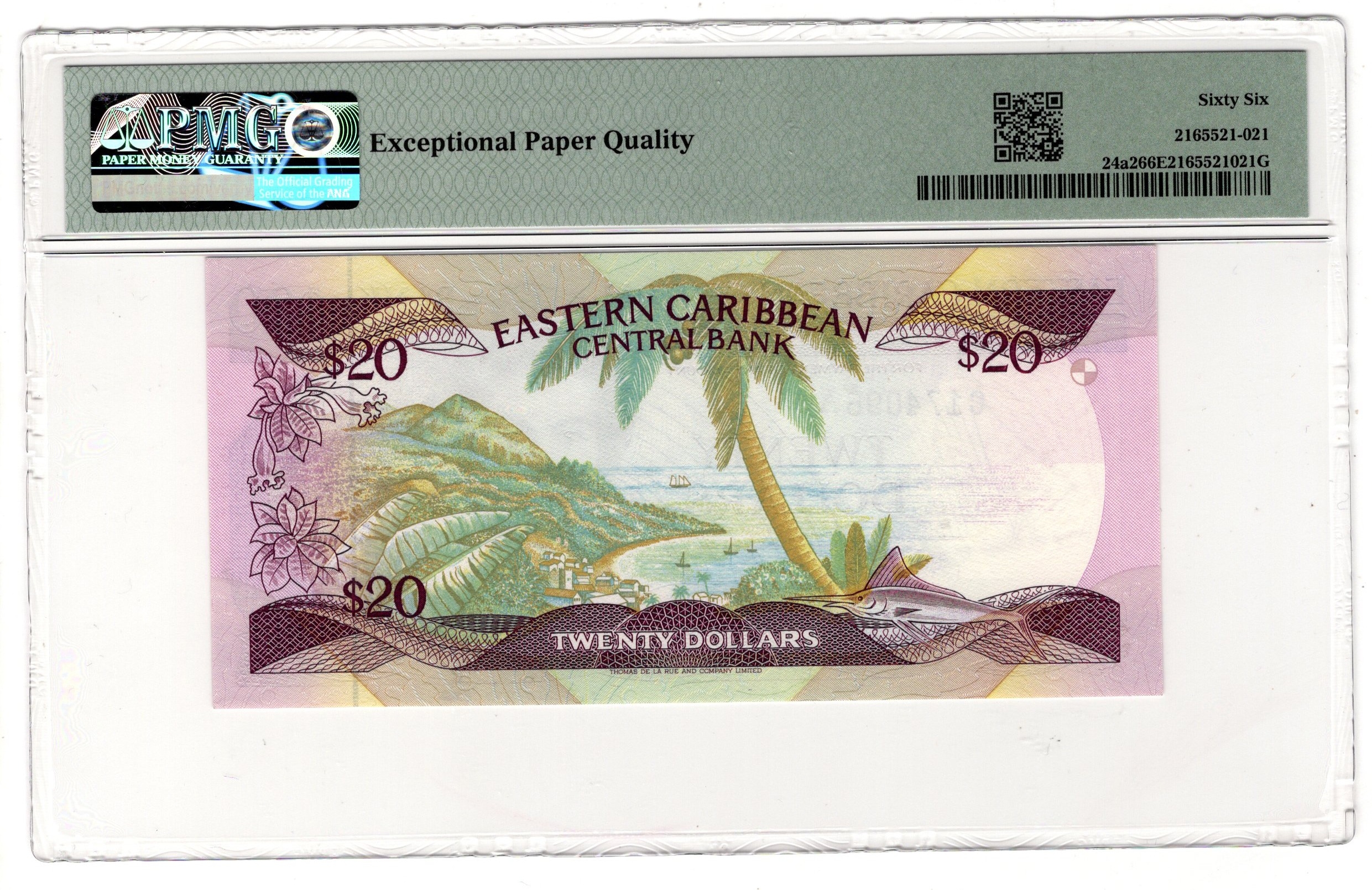 East Caribbean 20 Dollars issued 1988 - 1993, serial C174096A (BNB B208a2, Pick24a2) in PMG holder graded 66 EPQ Gem Uncirculated, exceptional paper quality