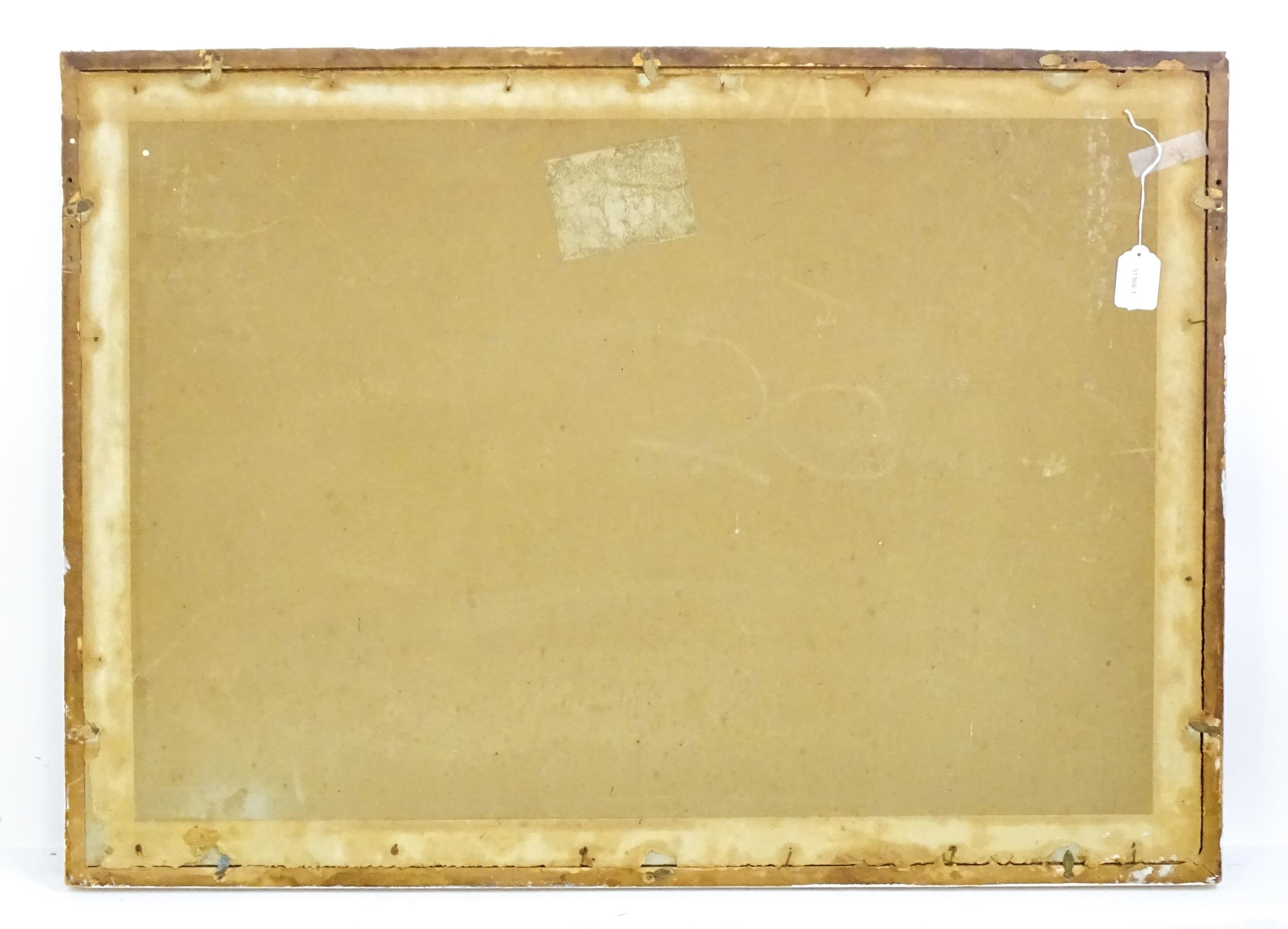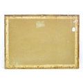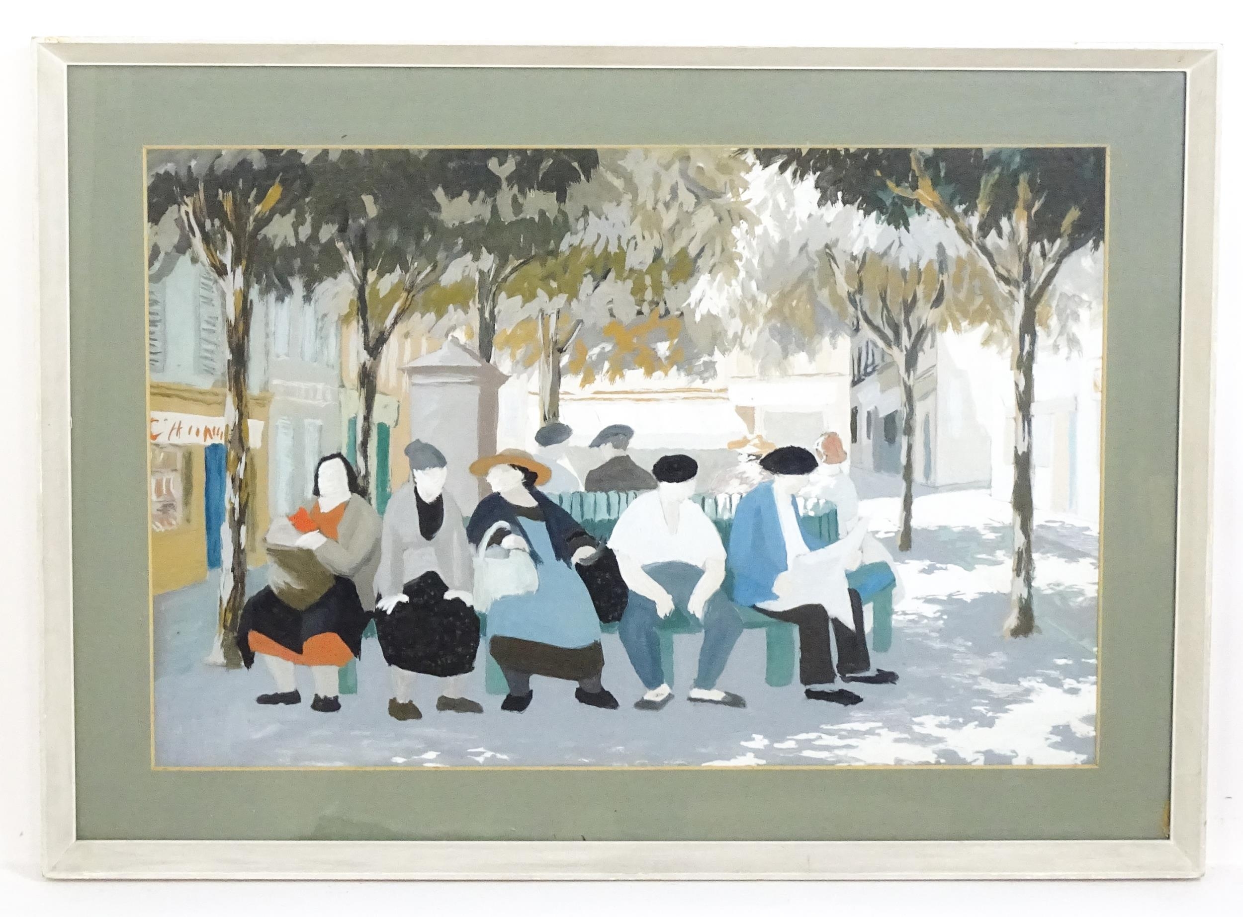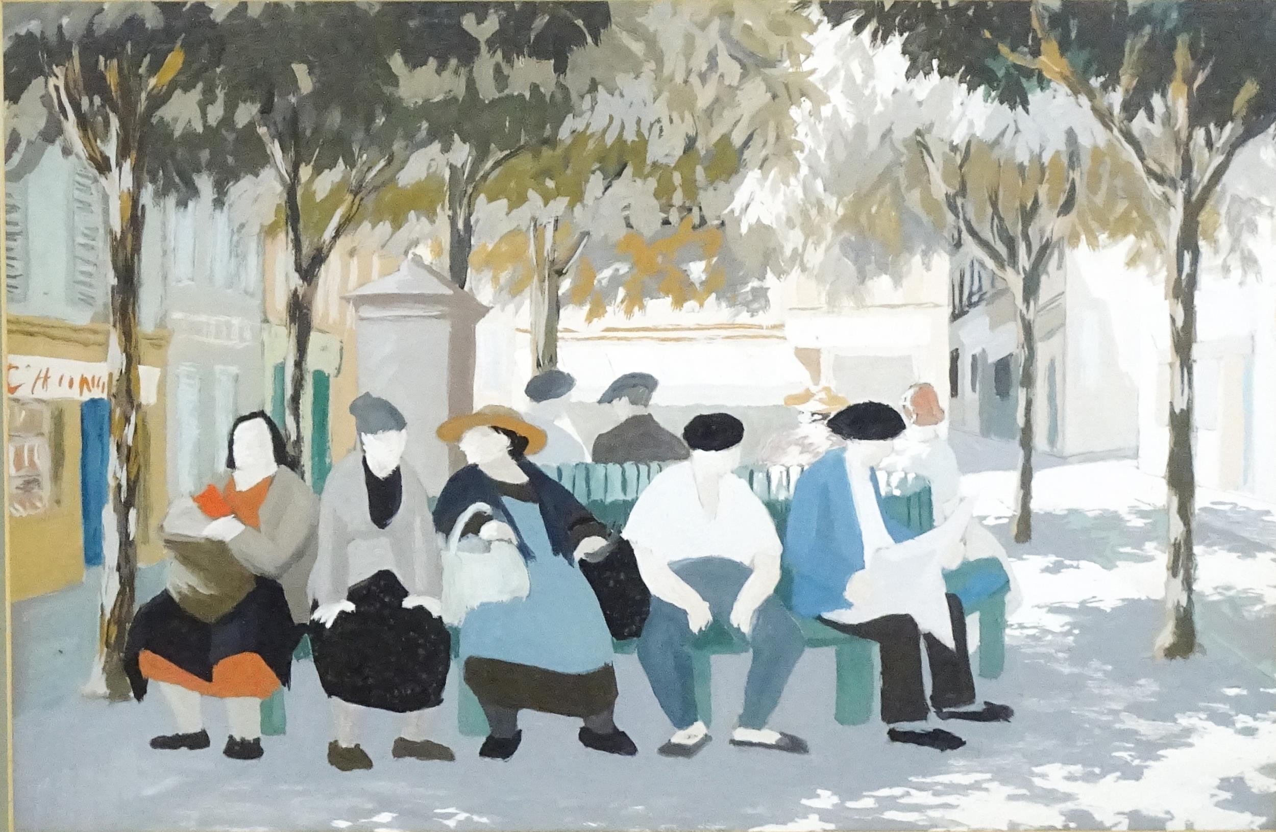 20th century, Watercolour and gouache, A Continental street scene with figures resting on a bench under trees. Approx. 18 1/2" x 28 1/4"0