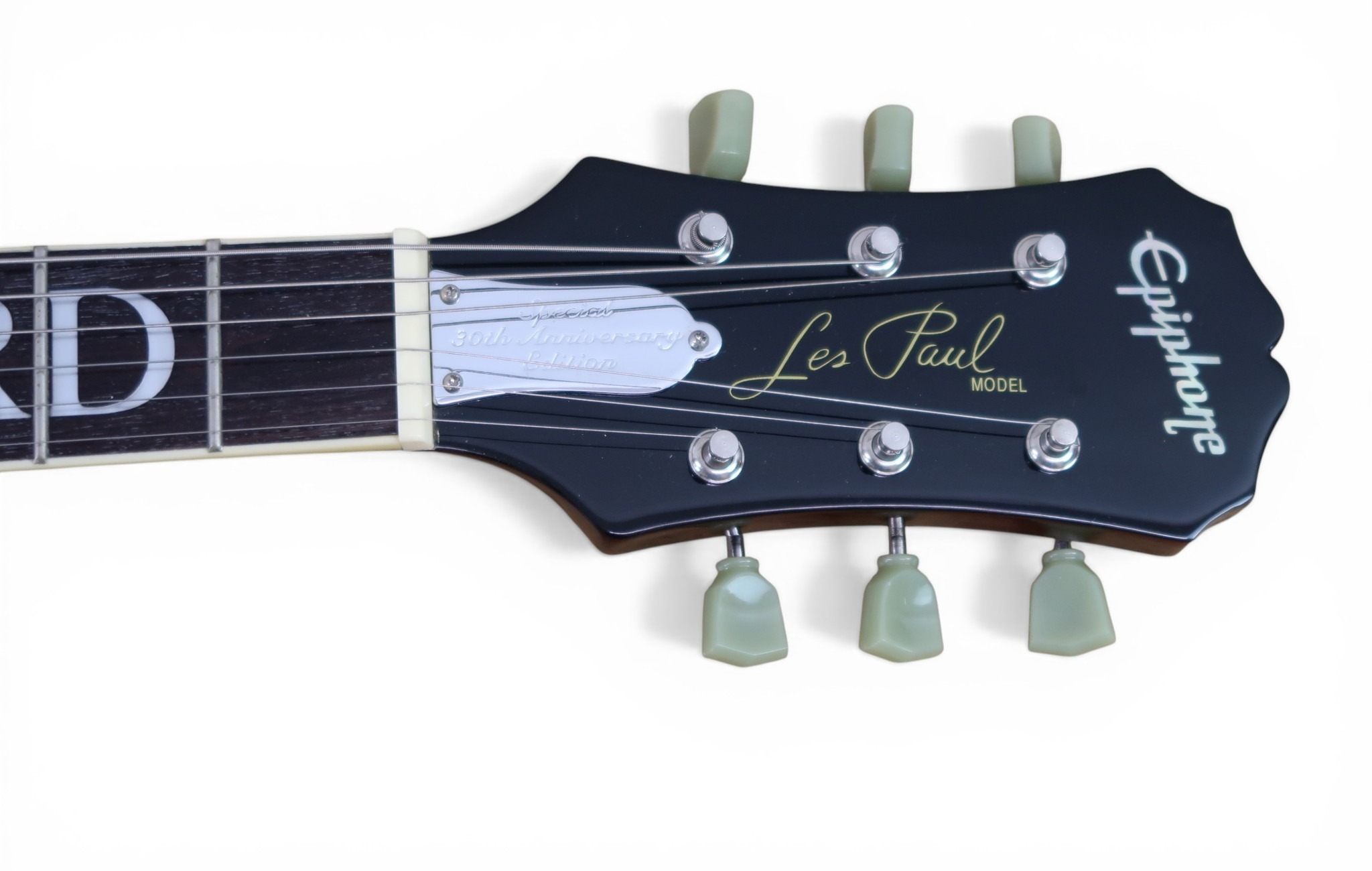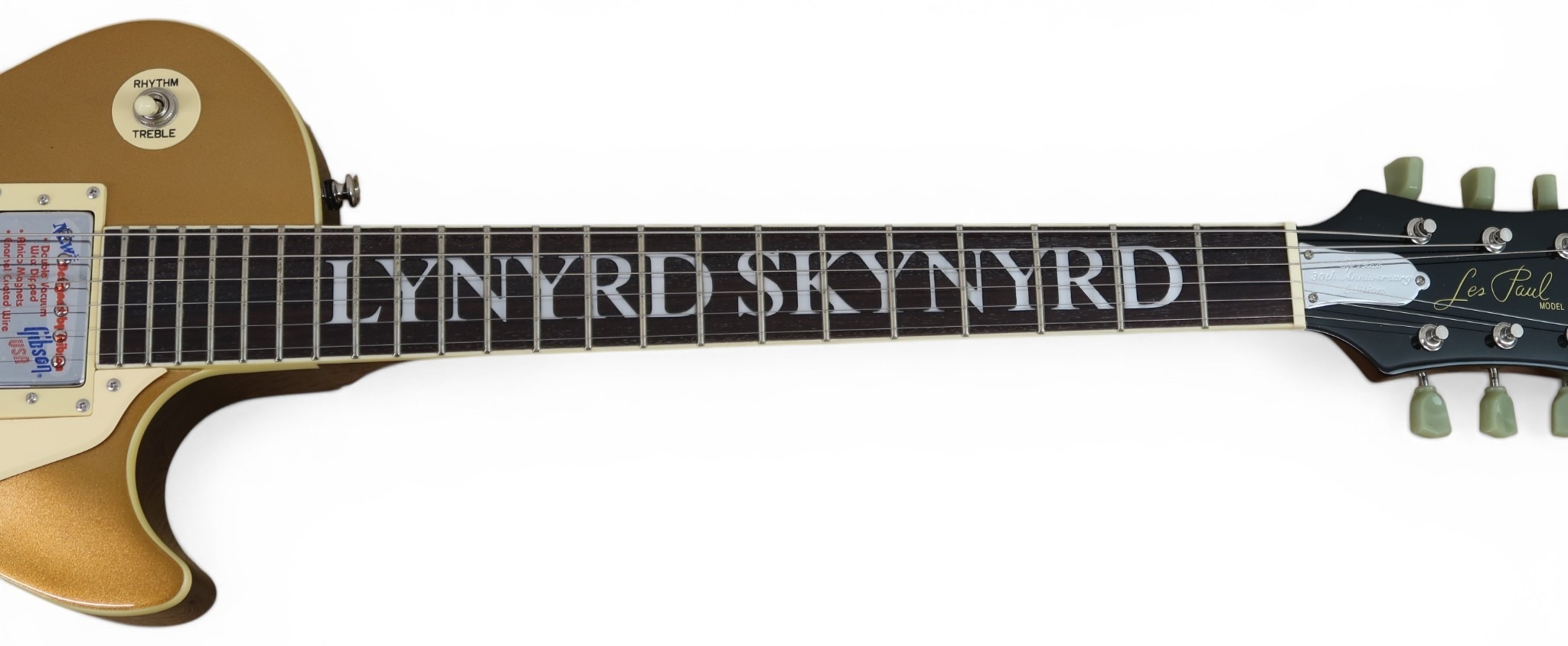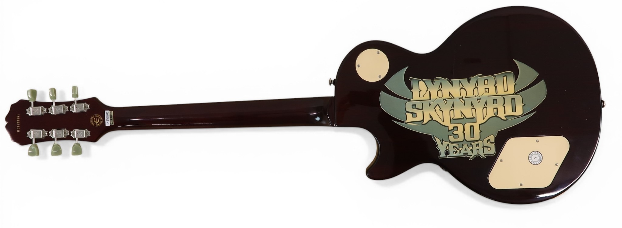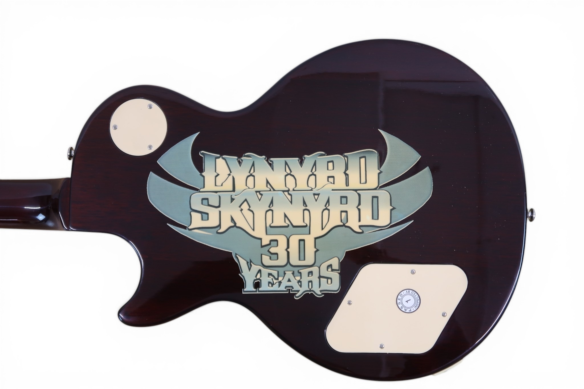 Mahogany Body with maple top, set rosewood fretboard with 'Lynyrd Skynyrd' inlay. '57 Classic Alnico-V humbuckers. Vintage style Green Key tuning pegs. Official 30th Anniversary Tour emblem on the back of the body.