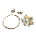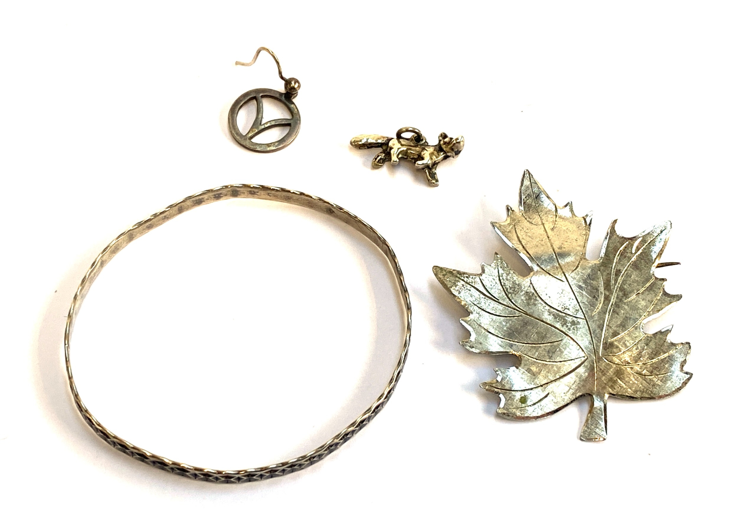 A child's silver bangle, 5.5cmD; silver maple leaf brooch and white metal dog charm etc, gross weight 12.9g