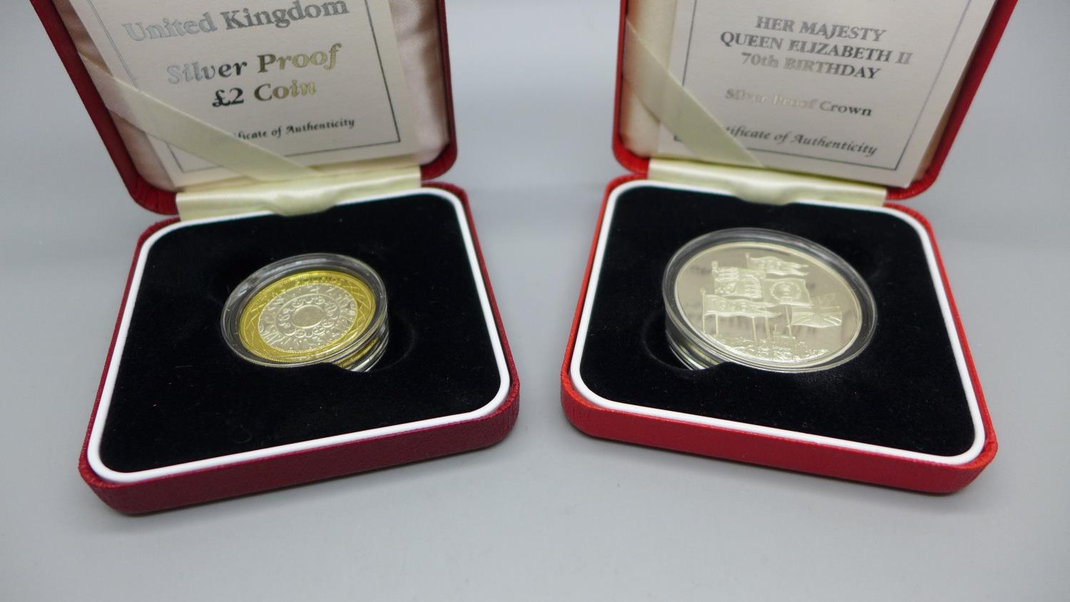 A 1996 silver proof crown, Her Majesty's 70th Birthday and a 1997 silver proof £2 coin