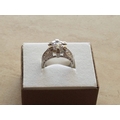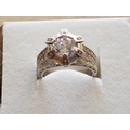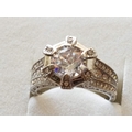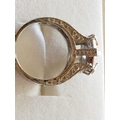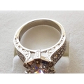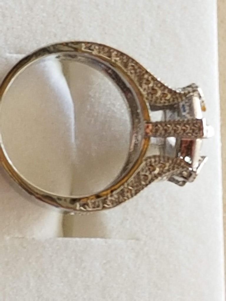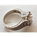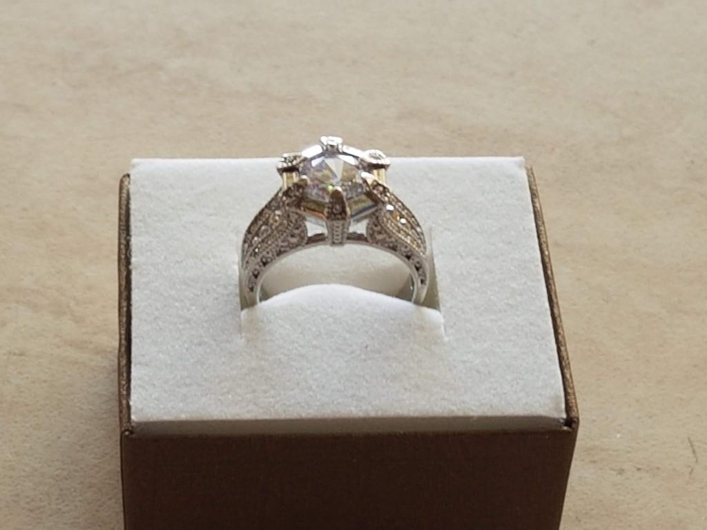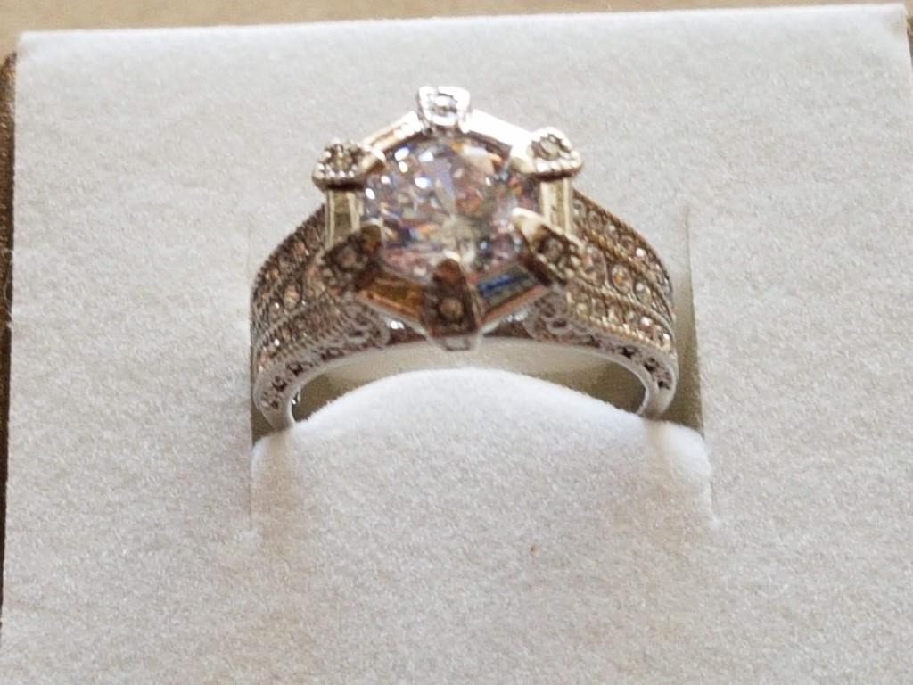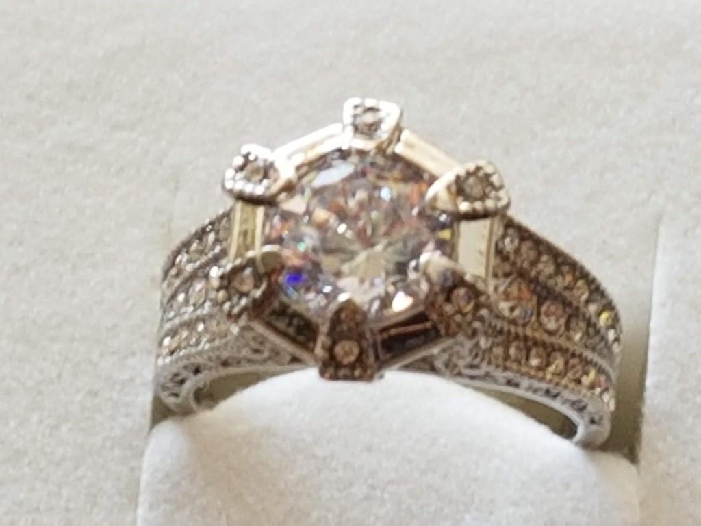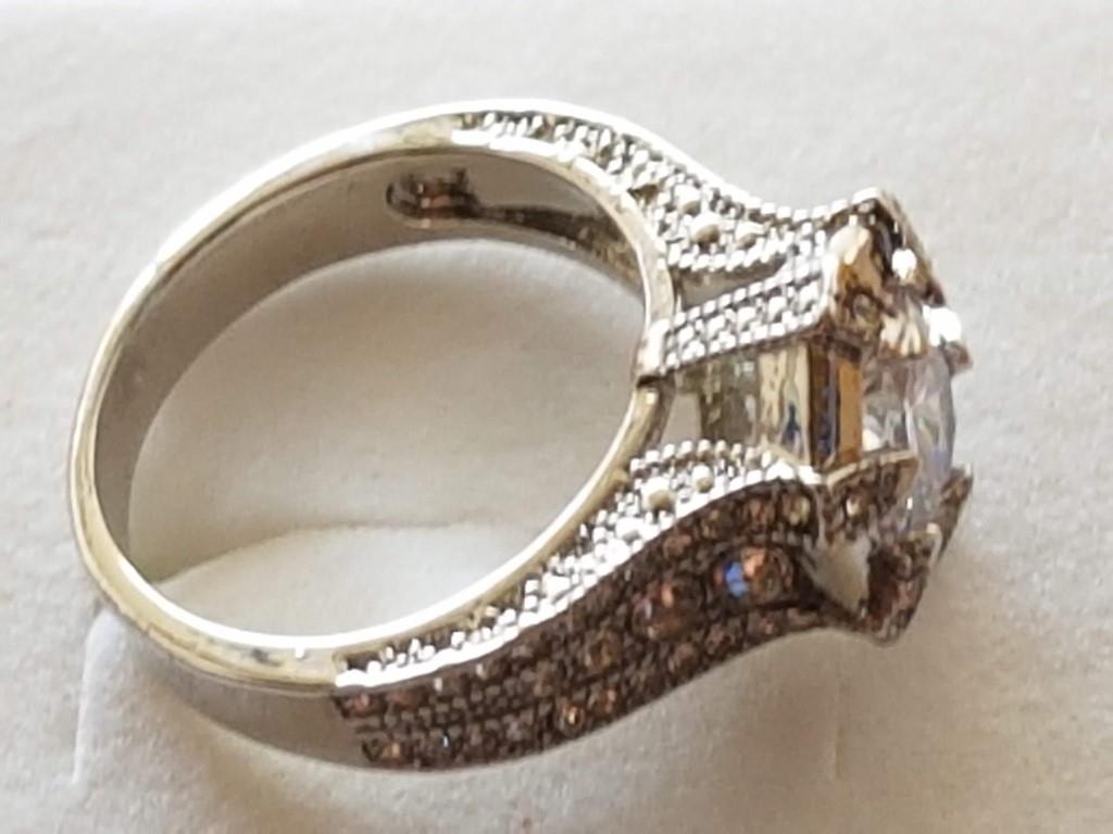 Large Silver Ring with Large White Topaz in Center and Quantity of Small, Size Q