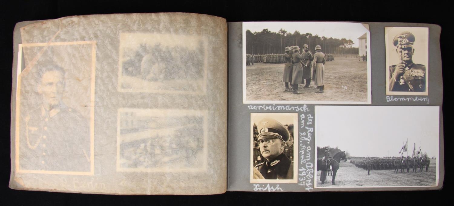 Militaria, Germany, Third Reich, 5 Komp Inf Rgt 48, Memories of Military Service photo album, Erinnerungen an meine Wehrdienstzeit, vom 1.10.1936 - 1.10.1938, military photographs various formats up to postcard size, all annotated, including marching men, men on manoeuvres, some photographs removed [*100]
