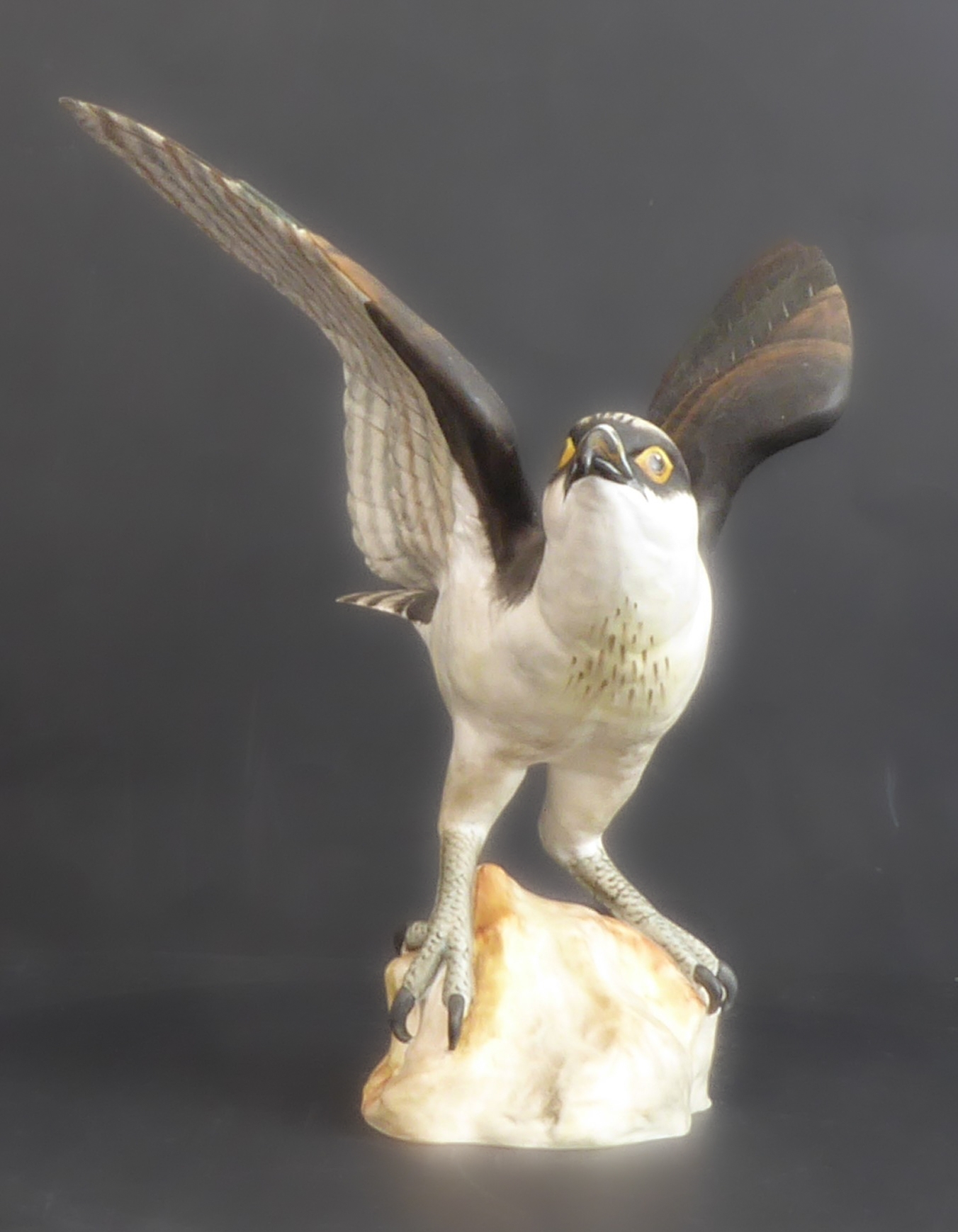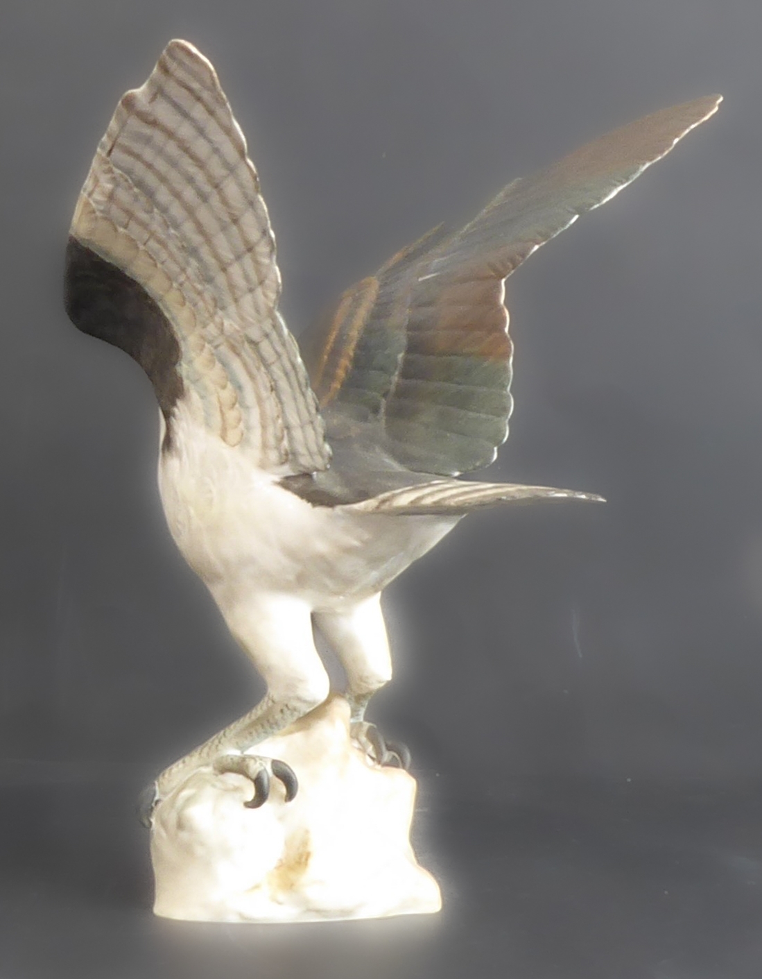 A hand-decorated Spode Fine Bone China model of an open-winged Osprey (Pandion Haliaetus), printed marks to underside and AW artist's monogram (29 cm high)