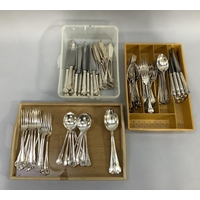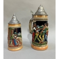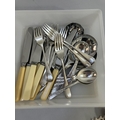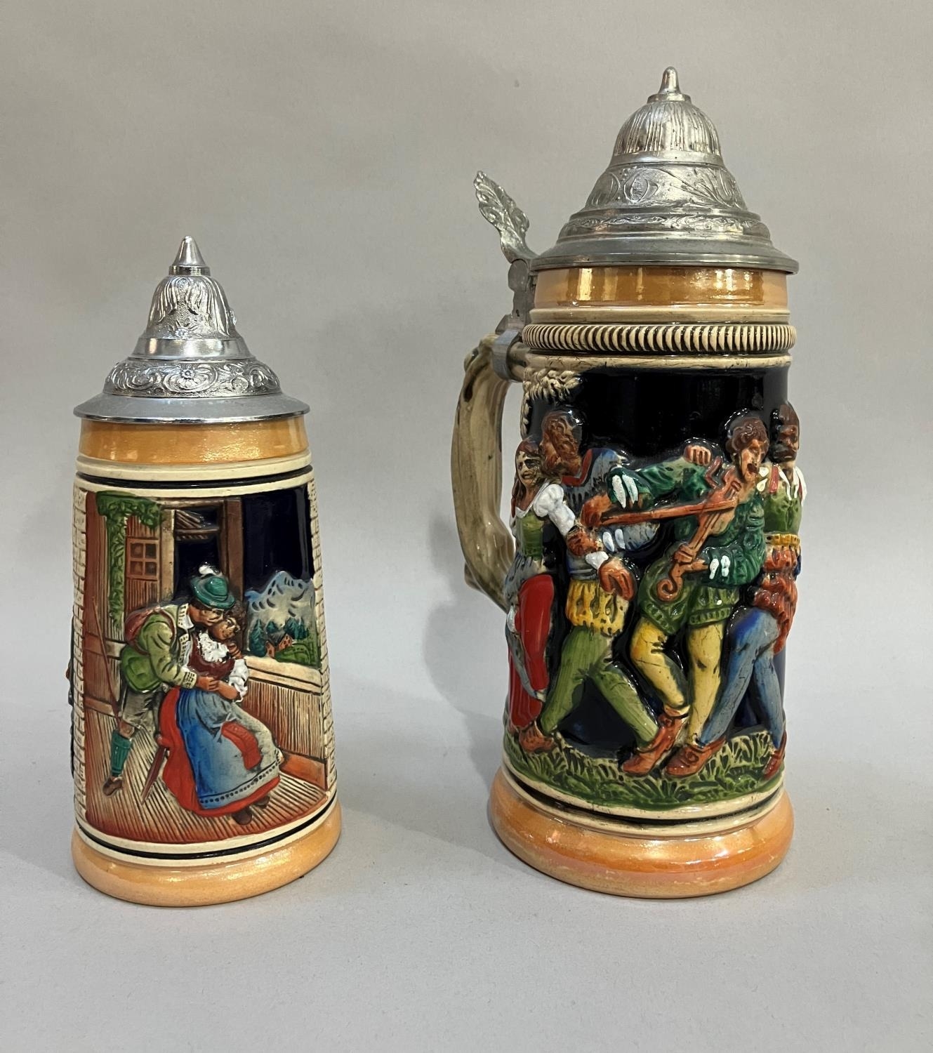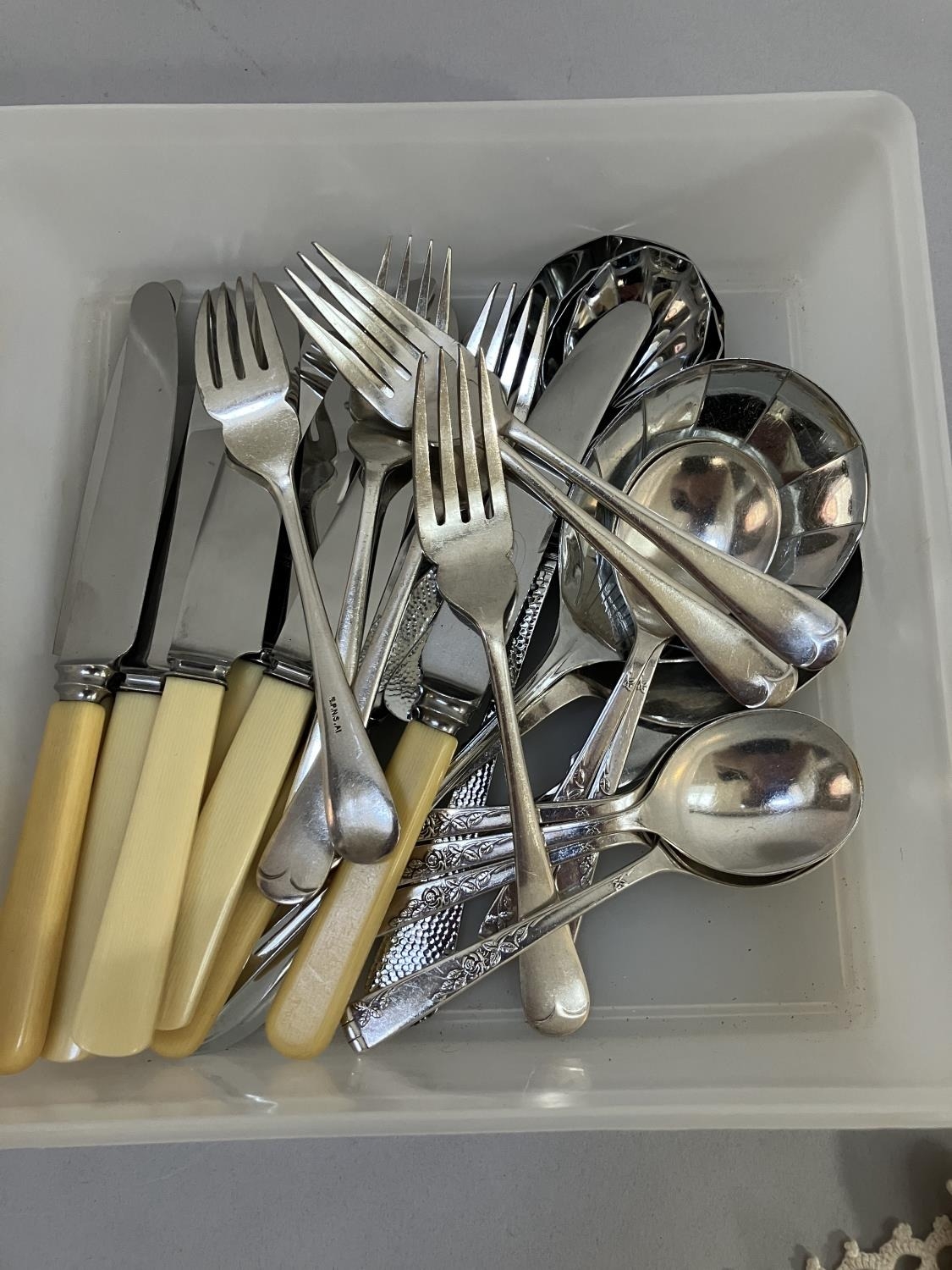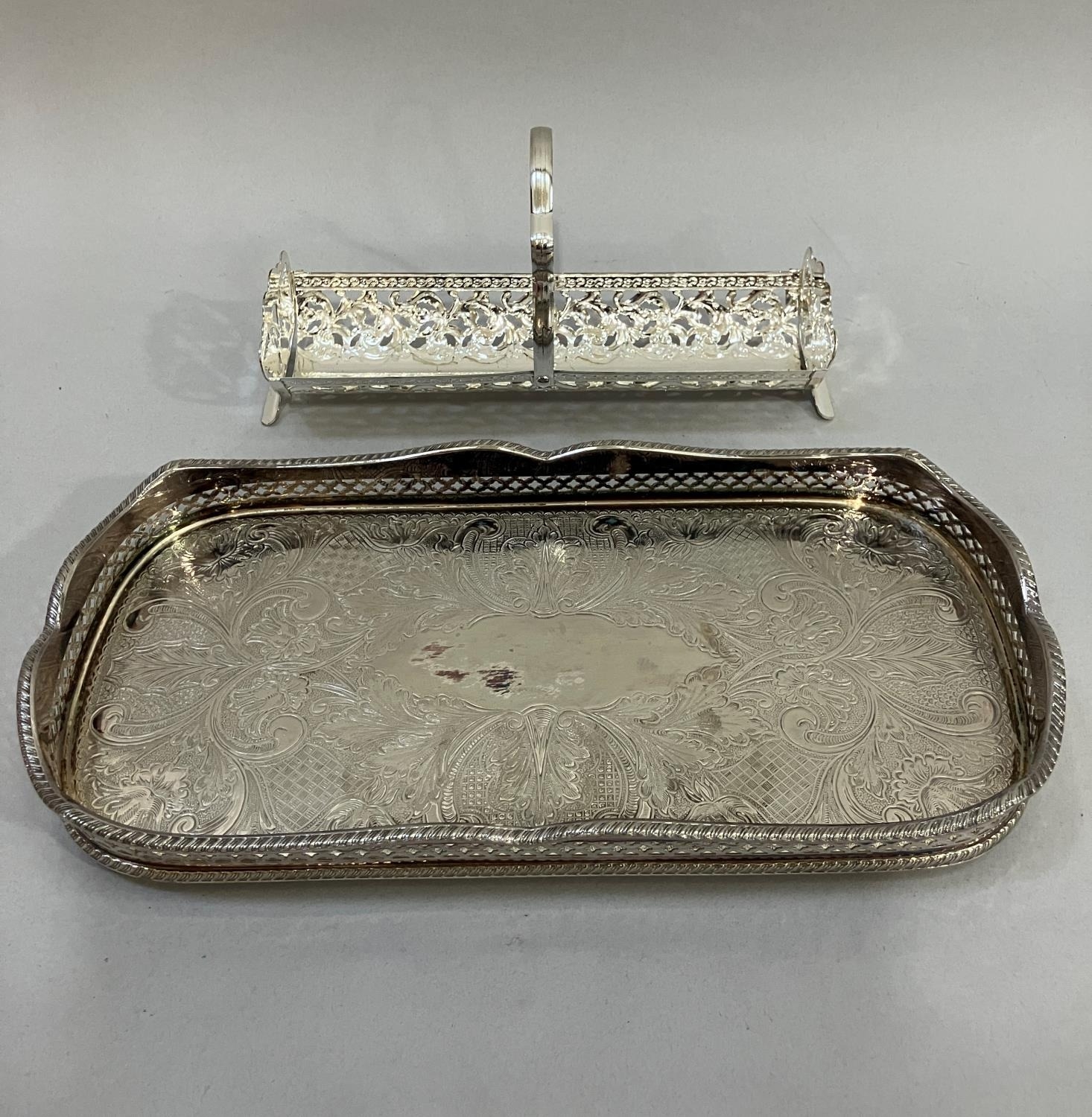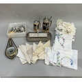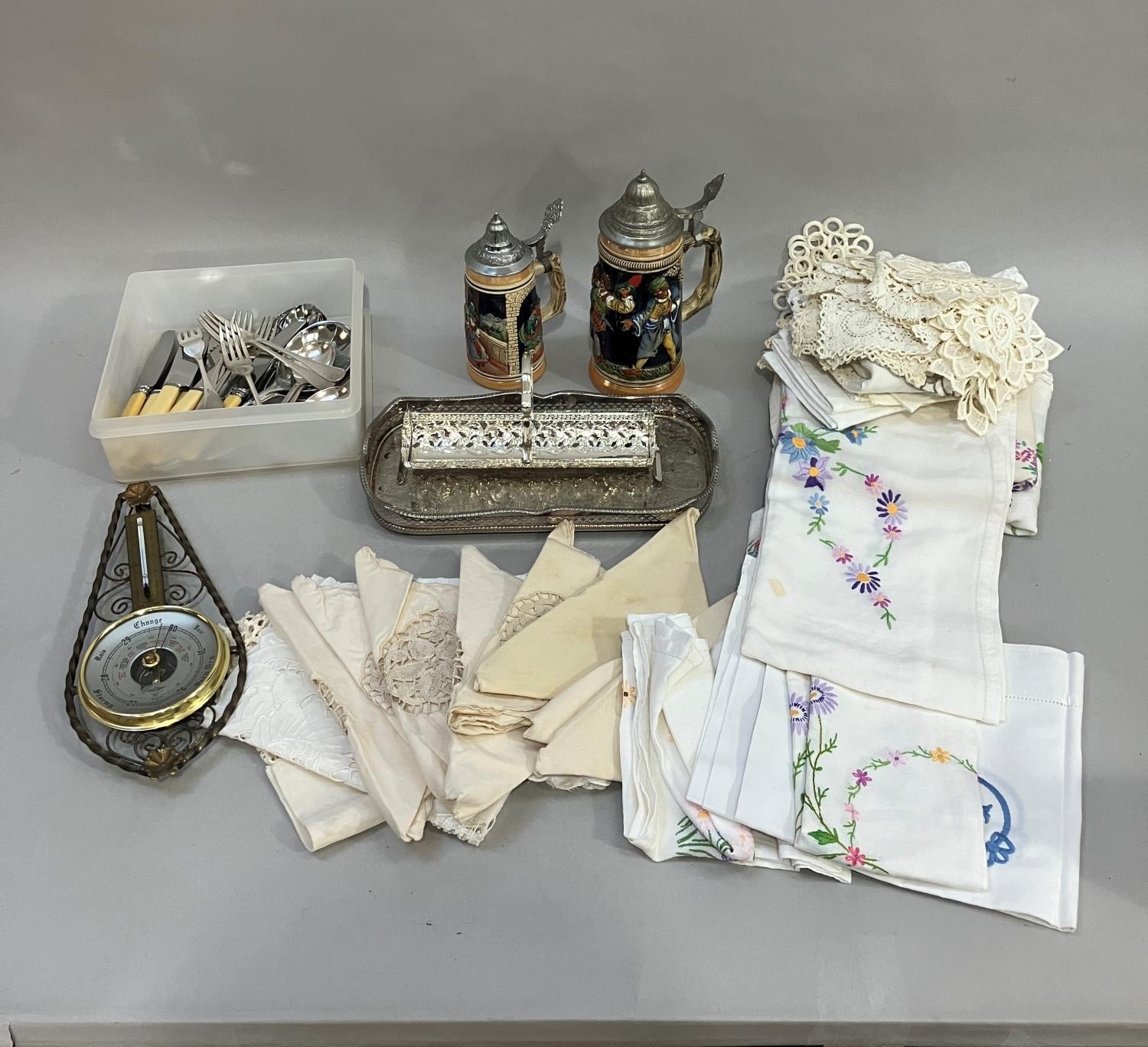 Silver plated tray, wafer basket, loose cutlery, two steins, together with a quantity of table linens and a barometer thermometer