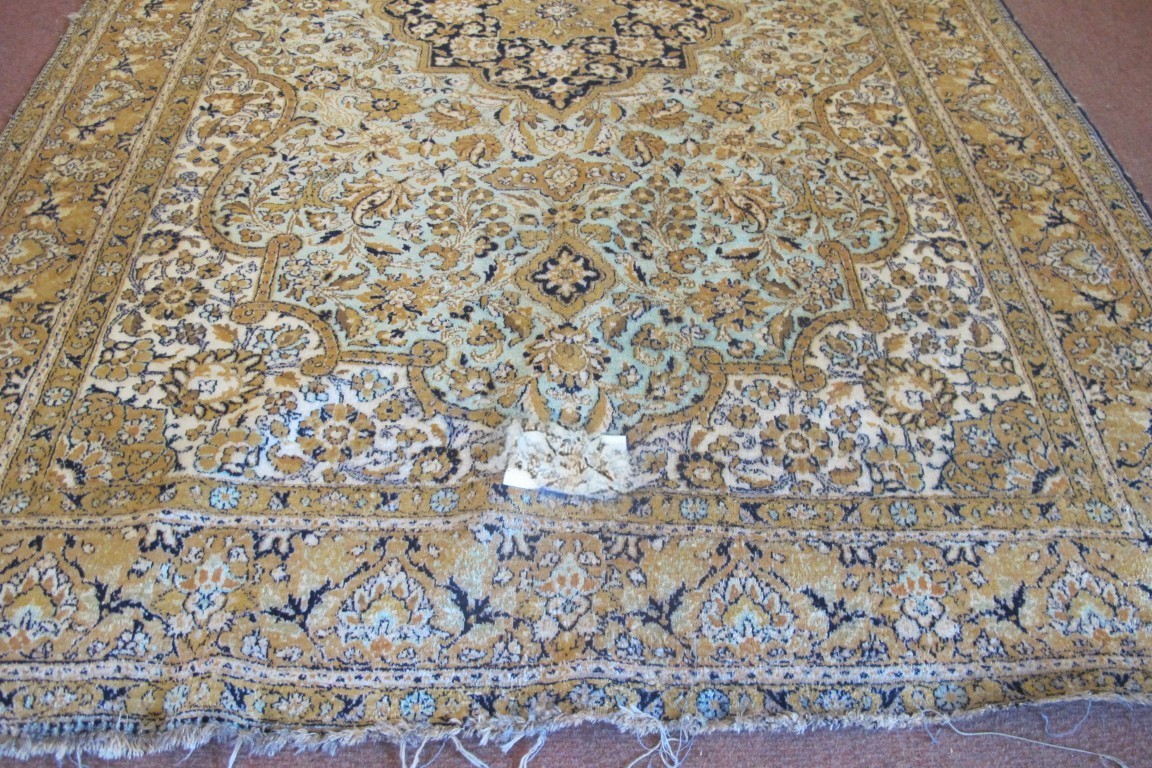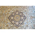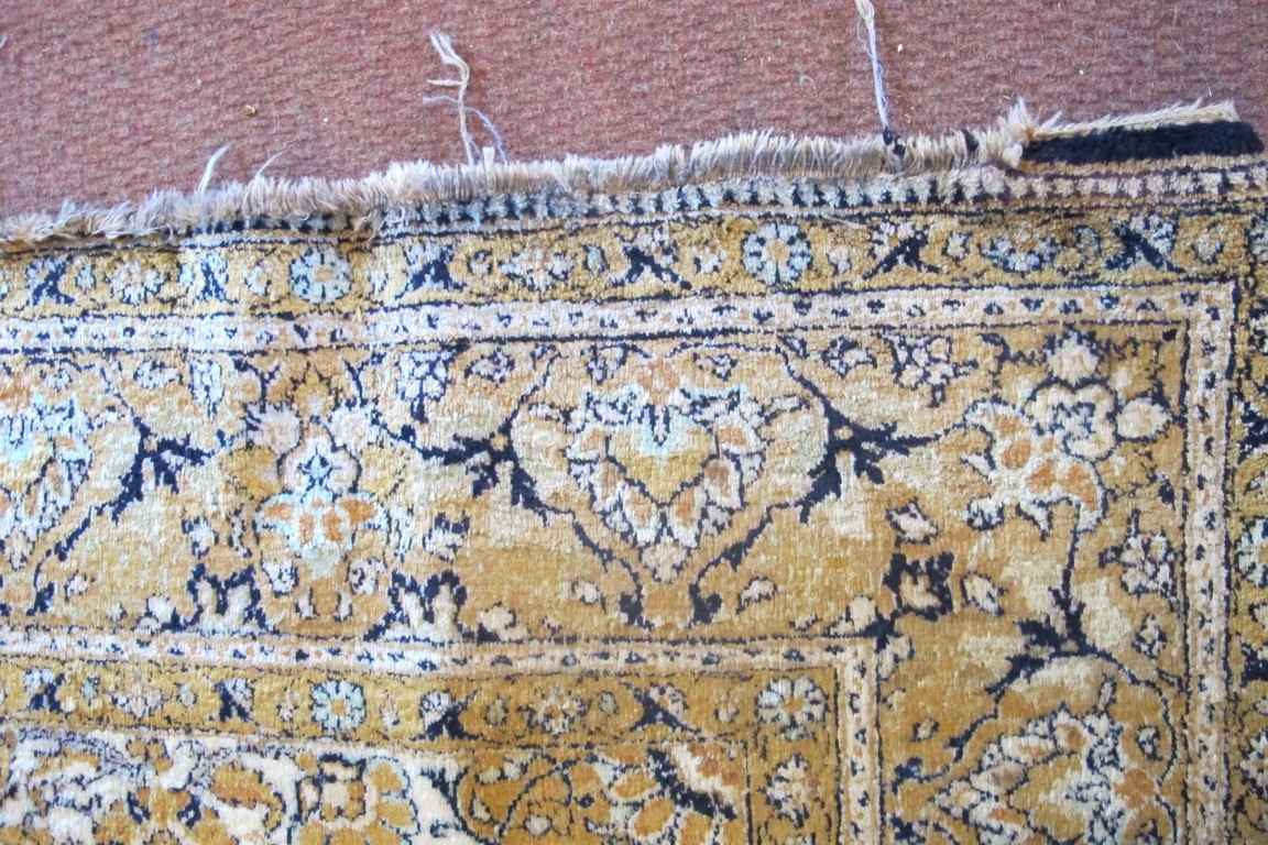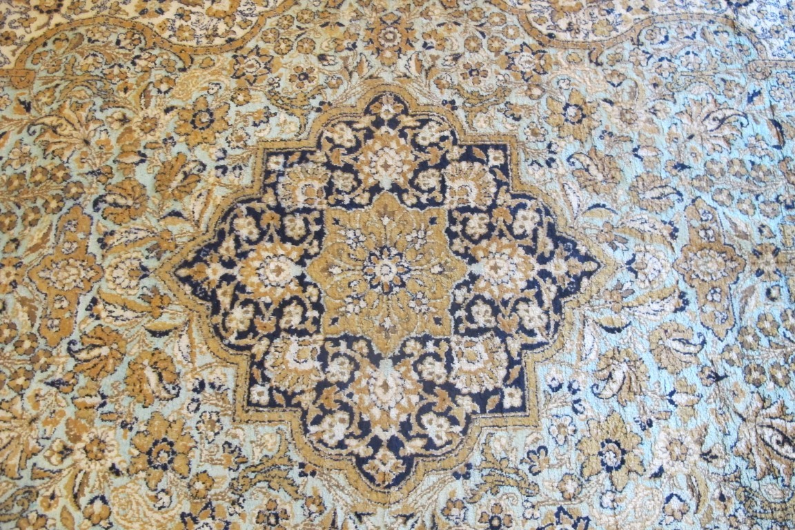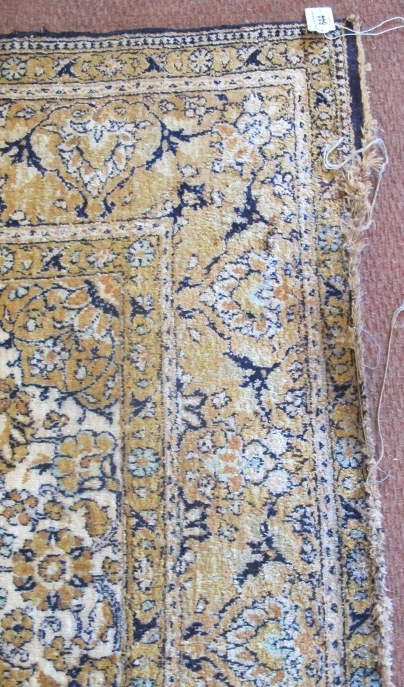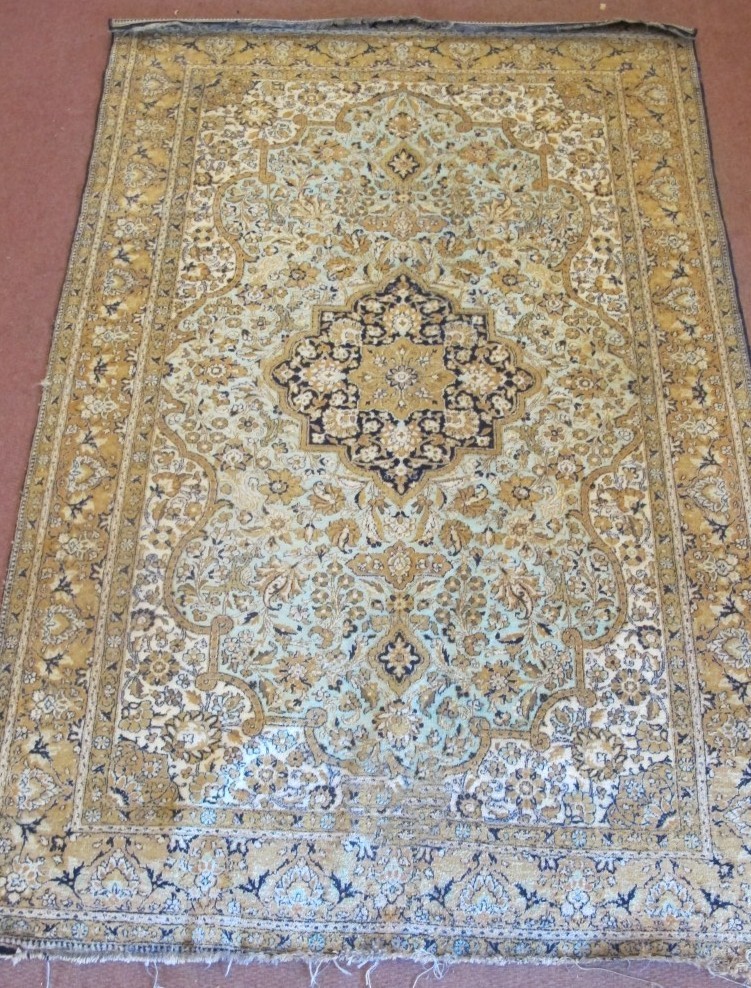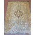 A nice silk Persian rug. Soft colours of cream, pale blue and yellow. 208 c 136cms (approx).