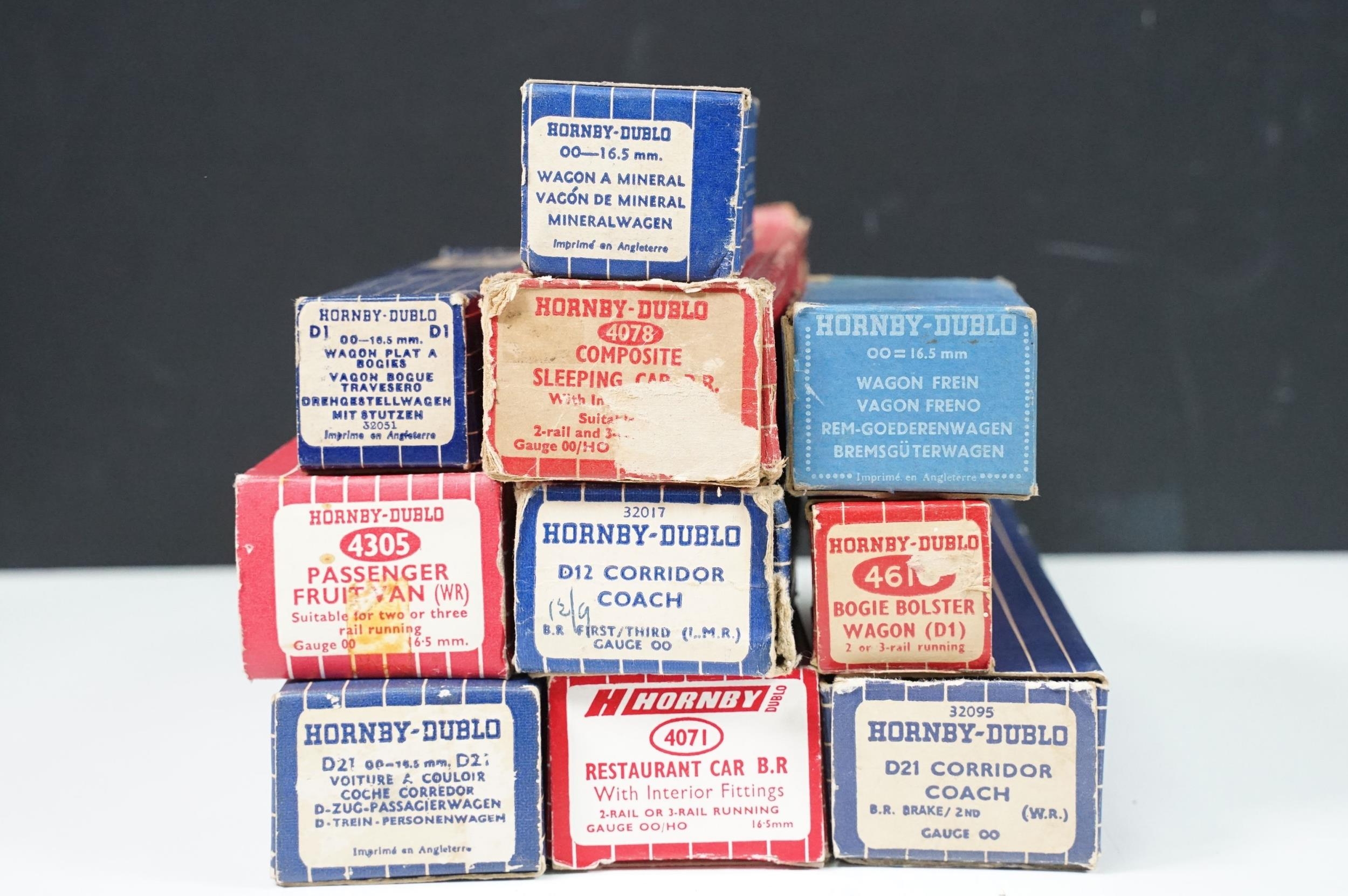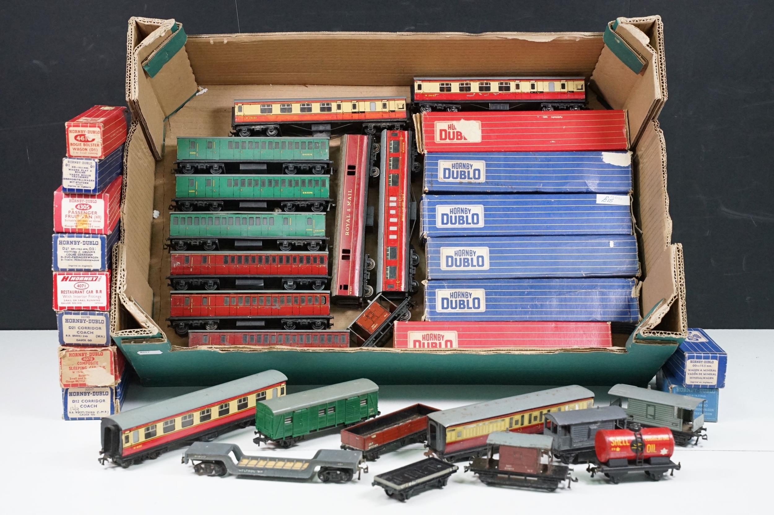 Around 35 boxed & unboxed Hornby Dublo items of rolling stock to include coaches, wagons and tankers featuring boxed 4071 Restaurant Car BR, 2 x boxed D22 Corridor Coach etc