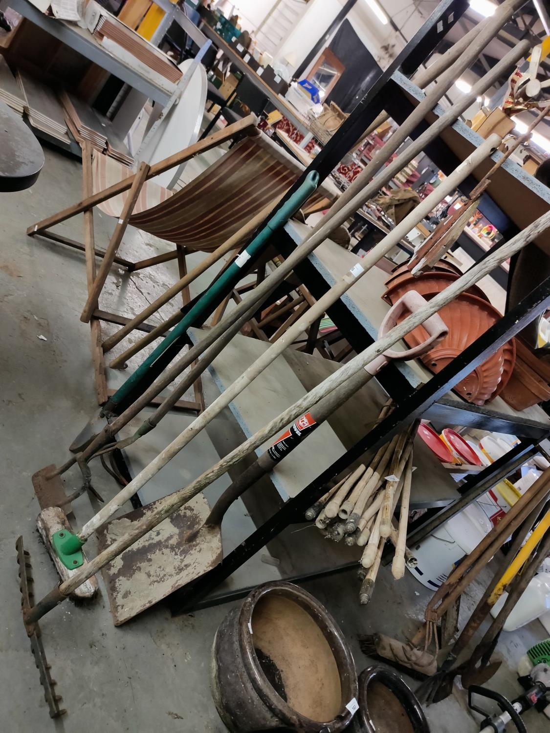 COLLECTION OF GARDEN ITEMS HOE RAKE SHOVEL ETC