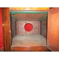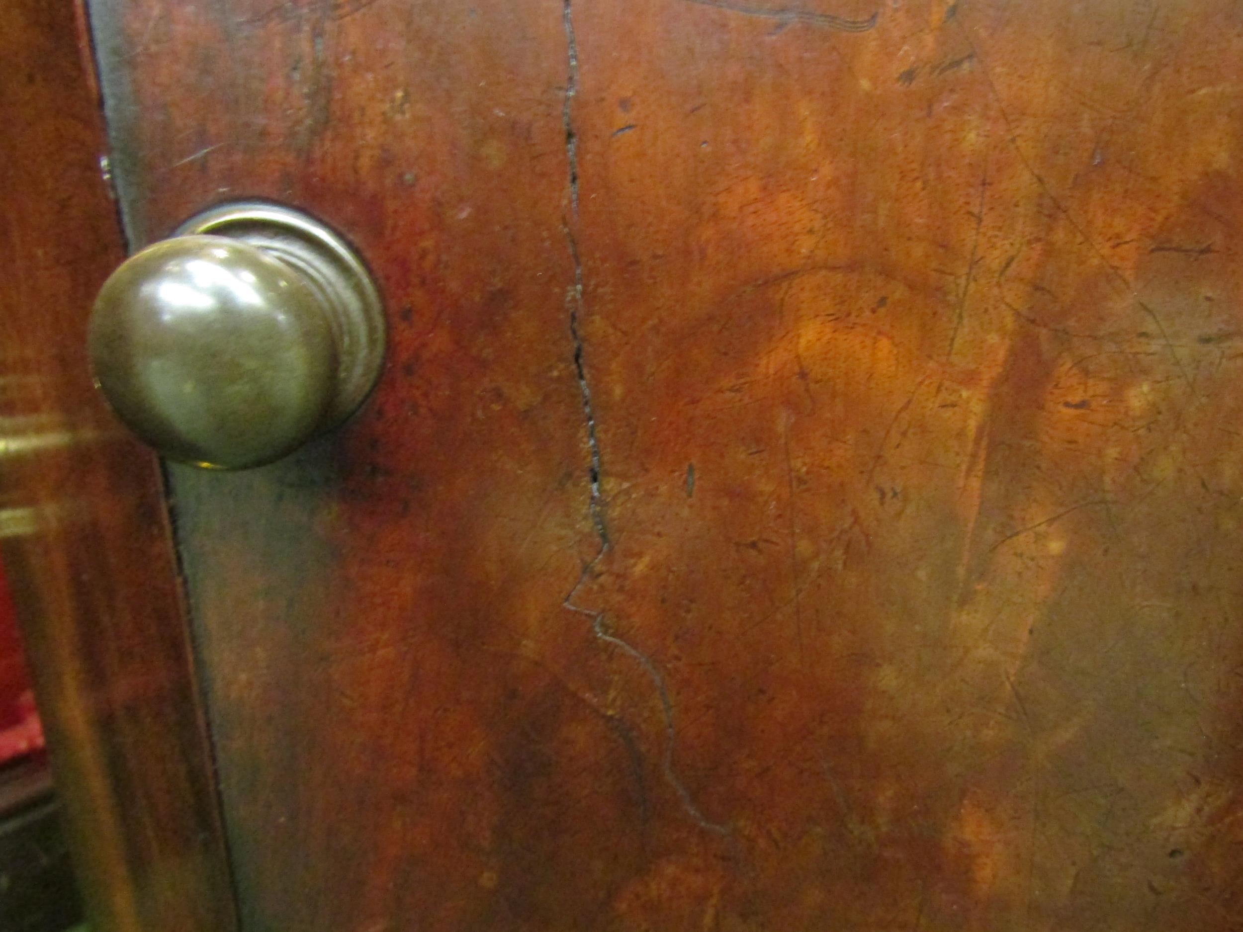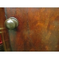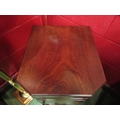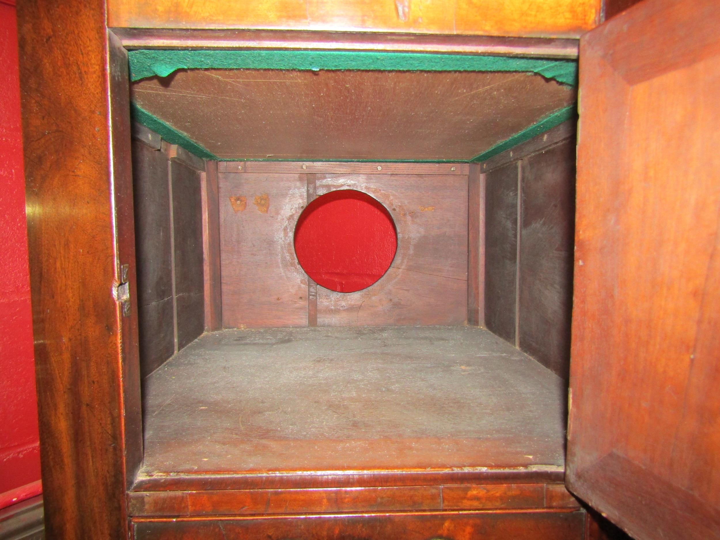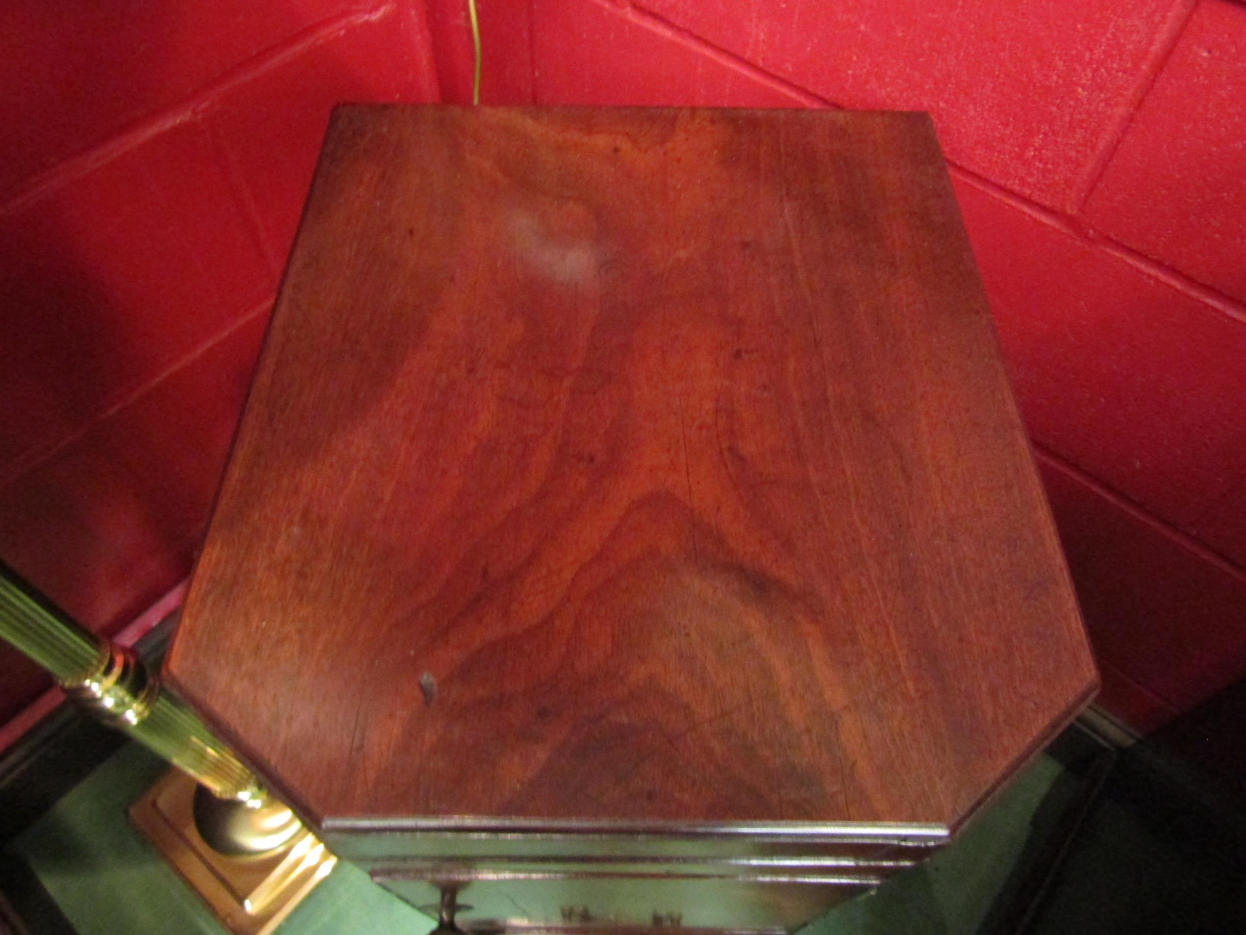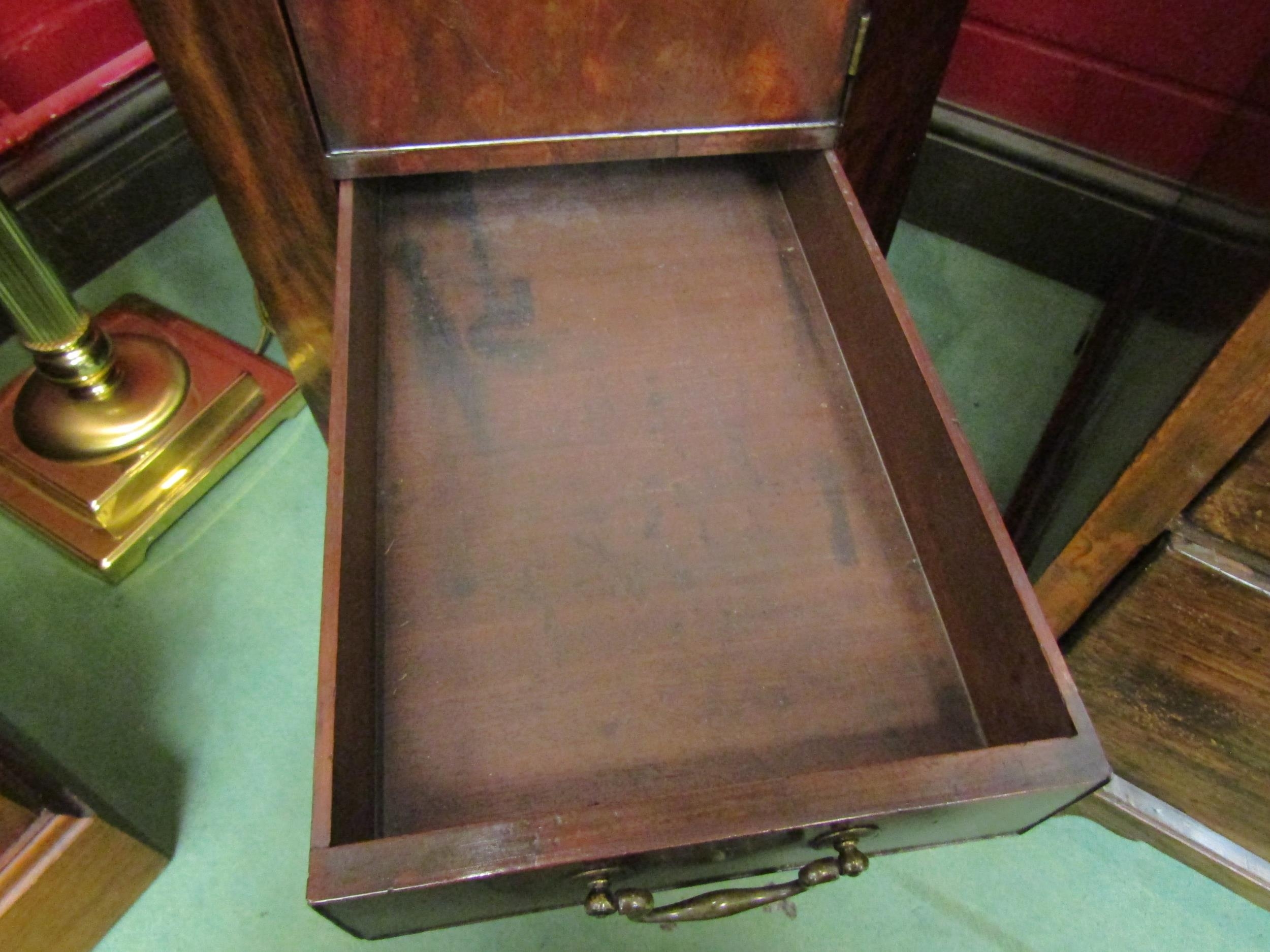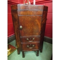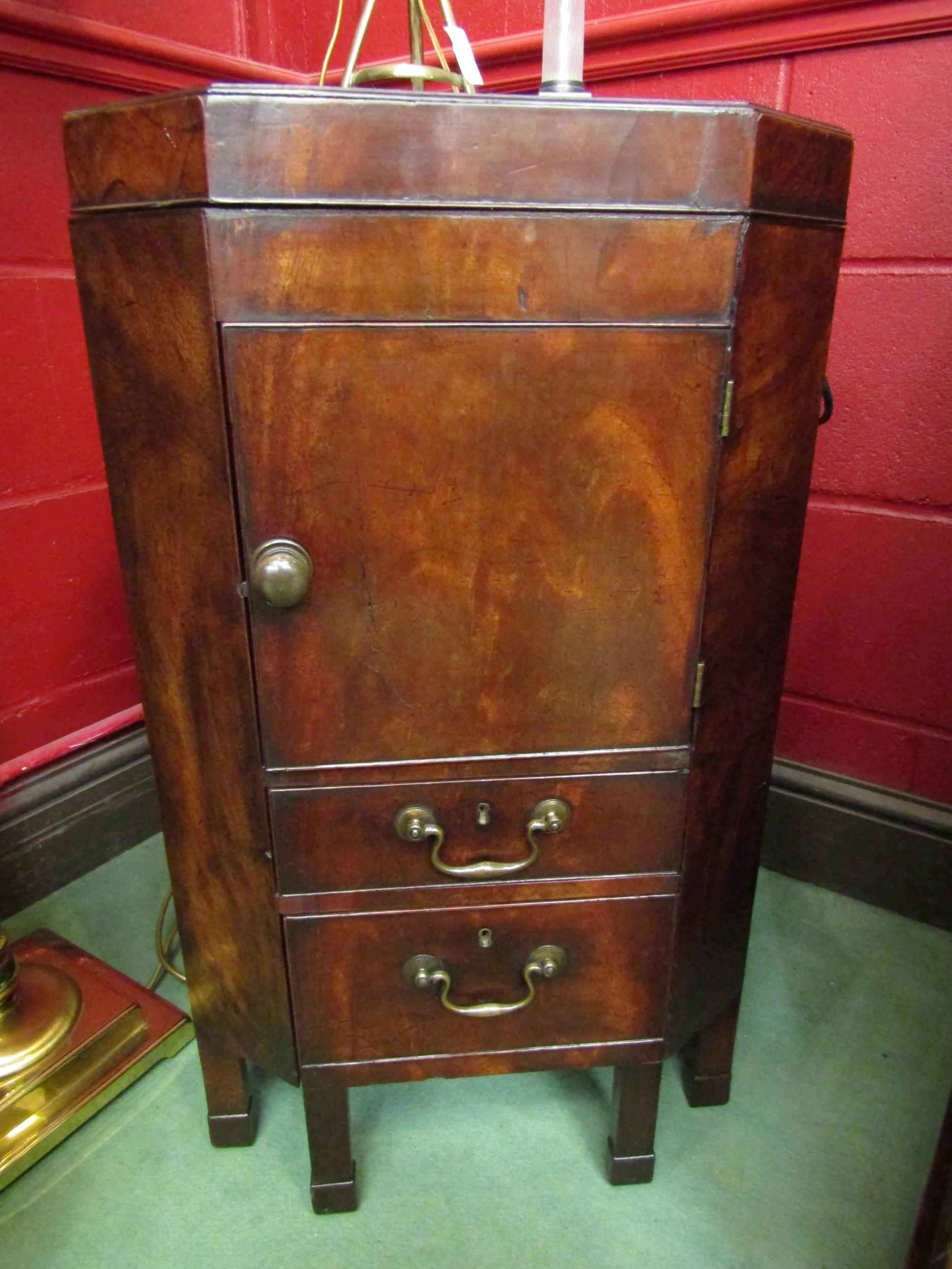 A George III mahogany canted corner washstand, the rising lid with baize interior over a single door pot cupboard and single drawer with metal bidet drawer (R) £35