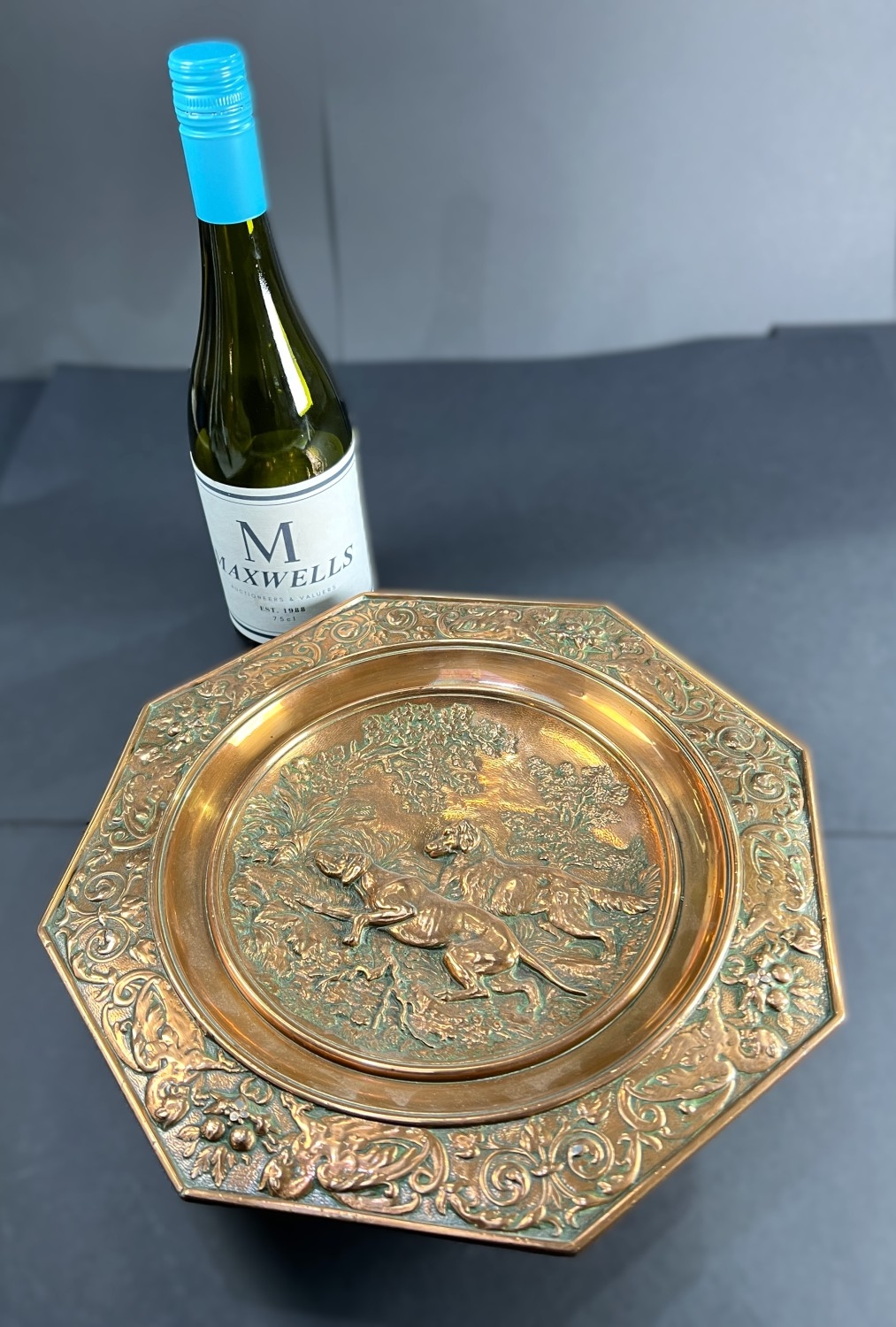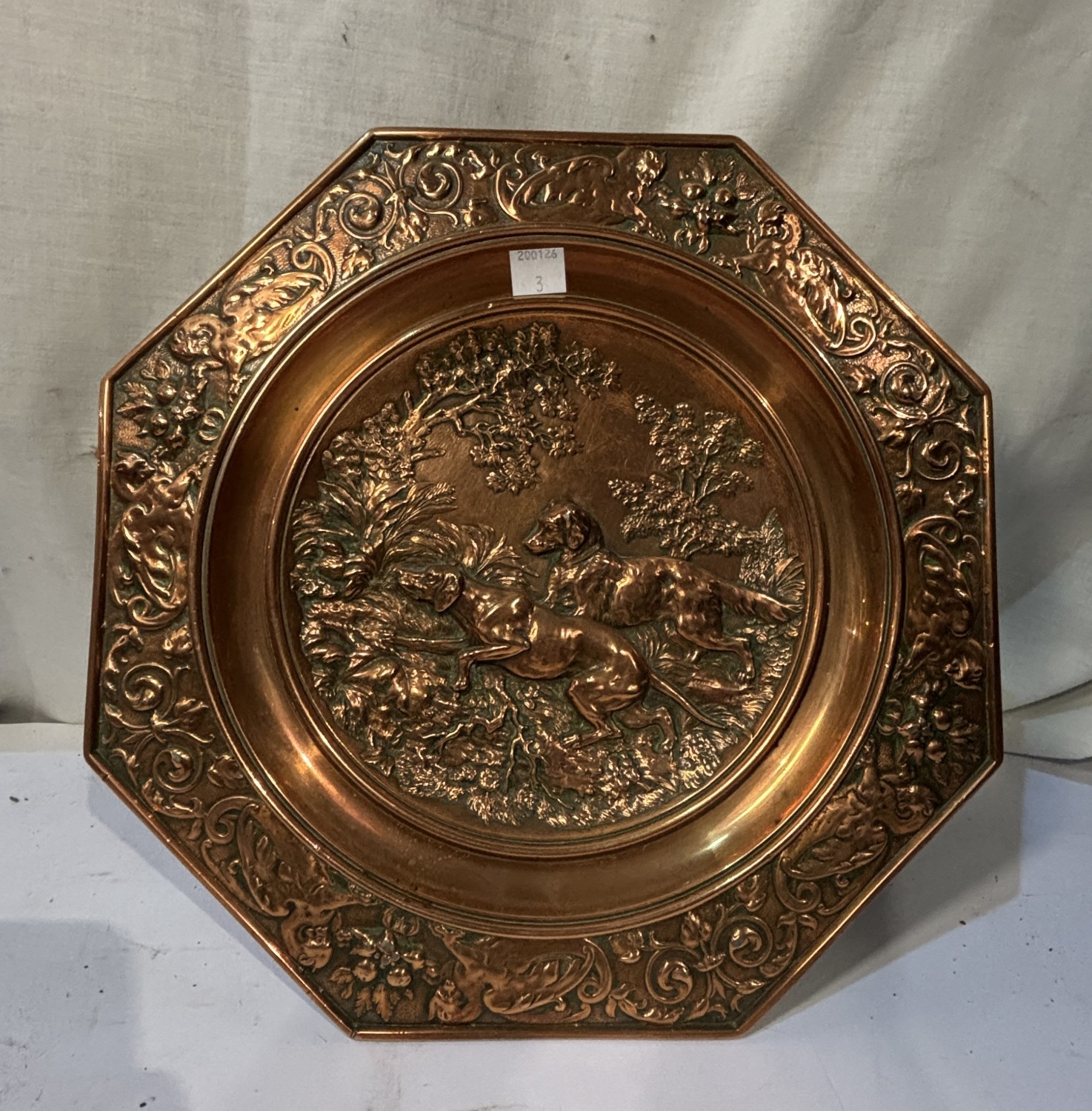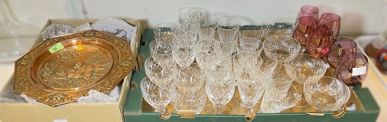 A 19th century shallow copper dish embossed hunting scene of two dogs octagonal border with dragons and brass foot to base; two bed warmers etc; Four 1920's hollow stem coupe glasses and a selection of cut glass drinking glasses.