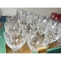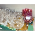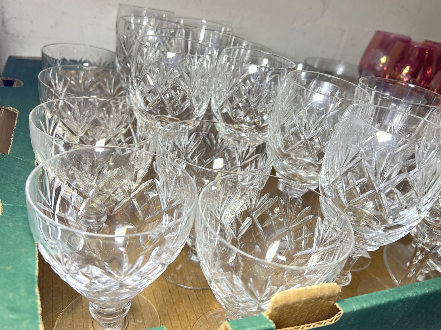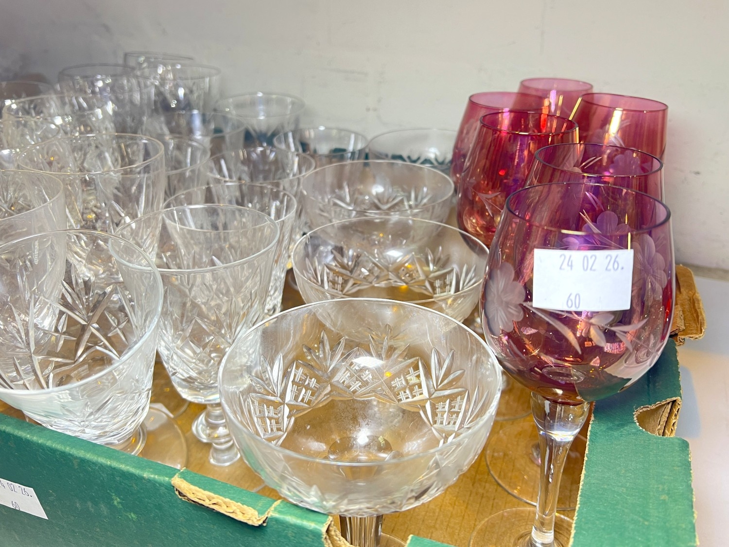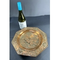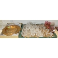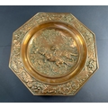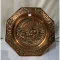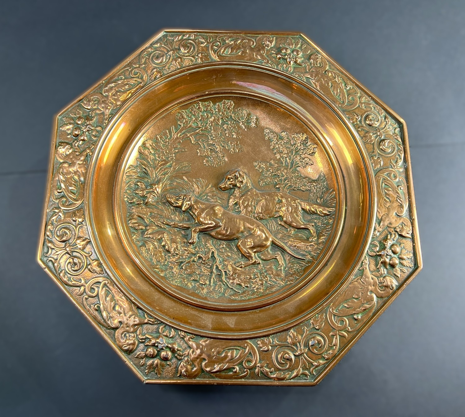 A 19th century shallow copper dish embossed hunting scene of two dogs octagonal border with dragons and brass foot to base; two bed warmers etc; Four 1920's hollow stem coupe glasses and a selection of cut glass drinking glasses.