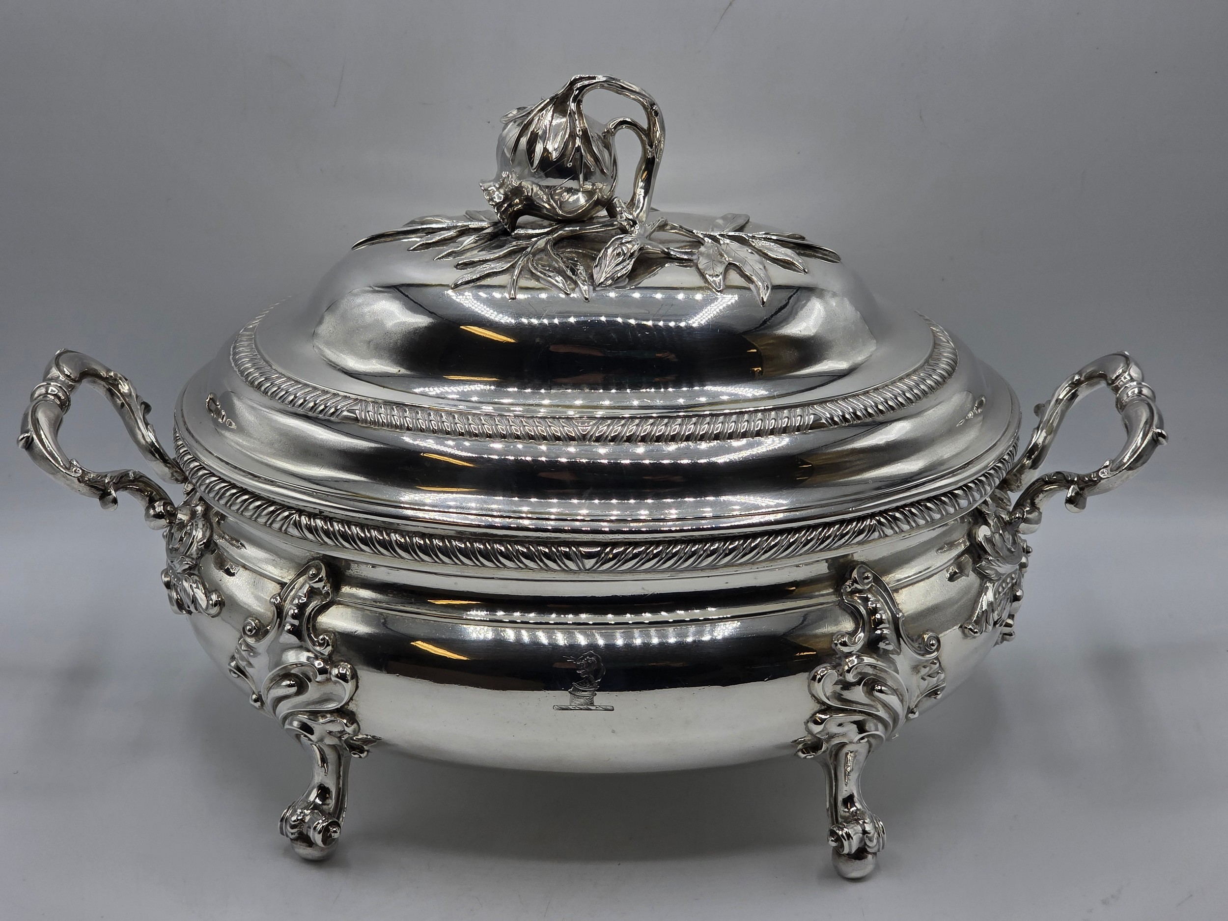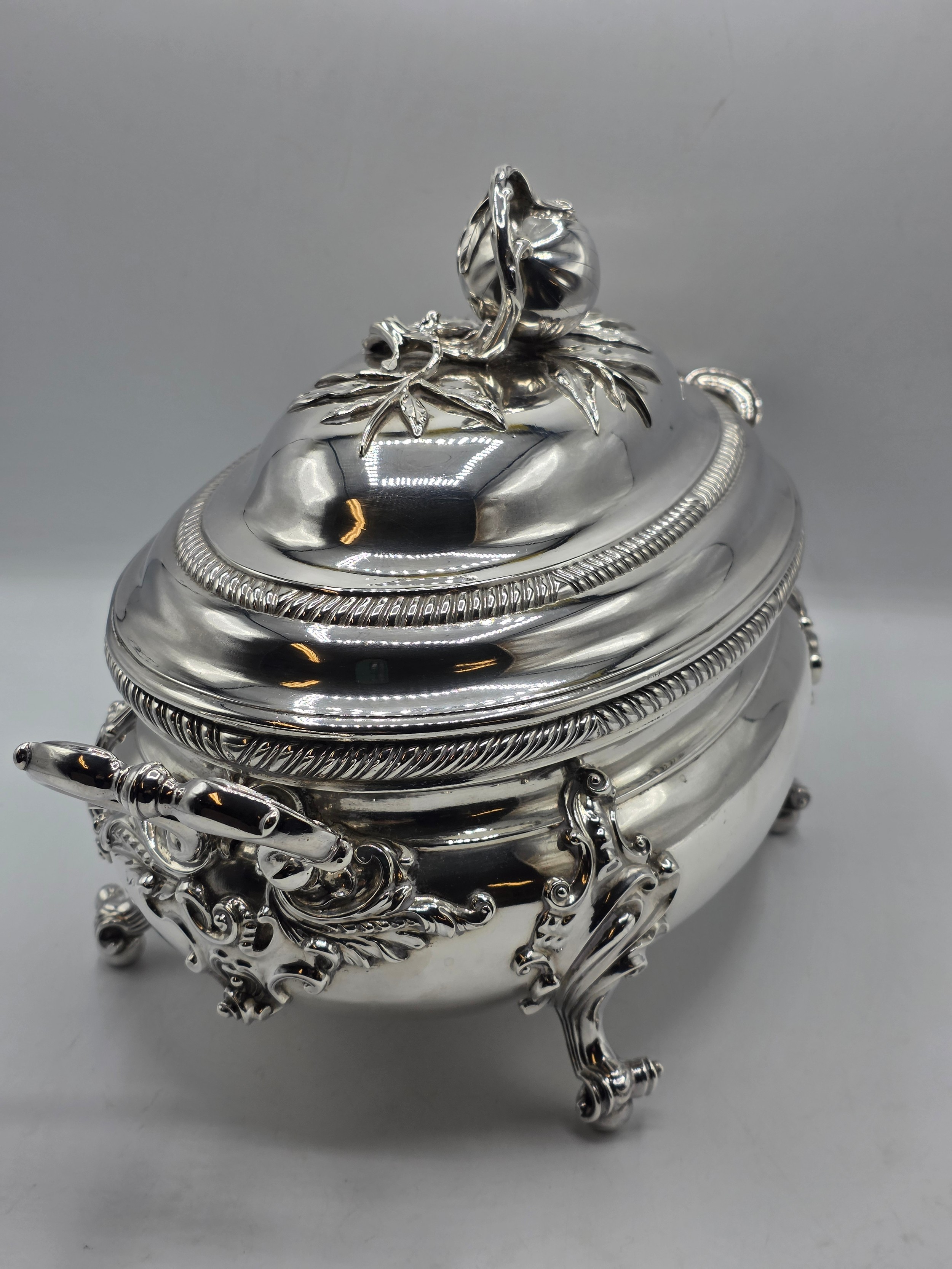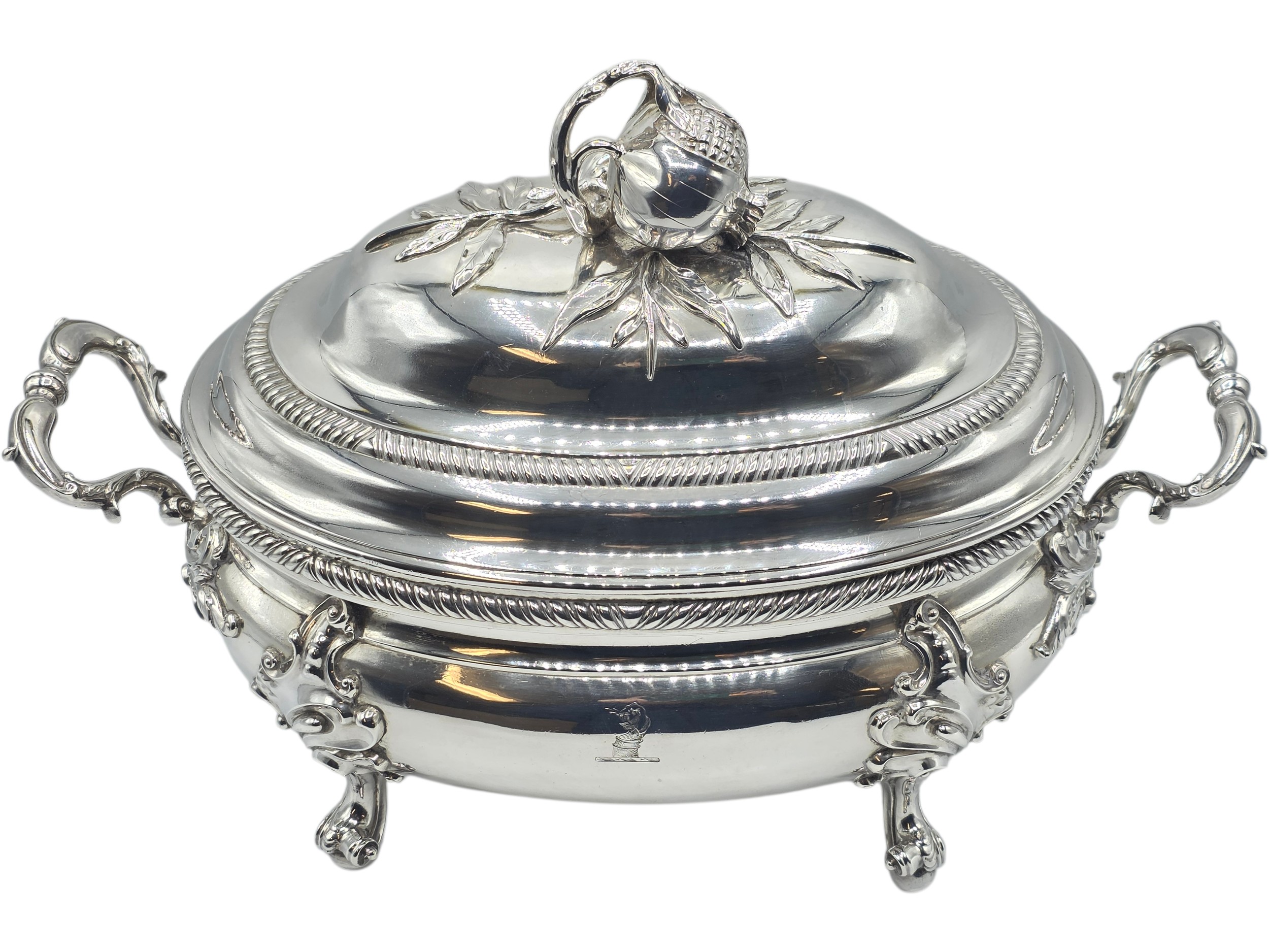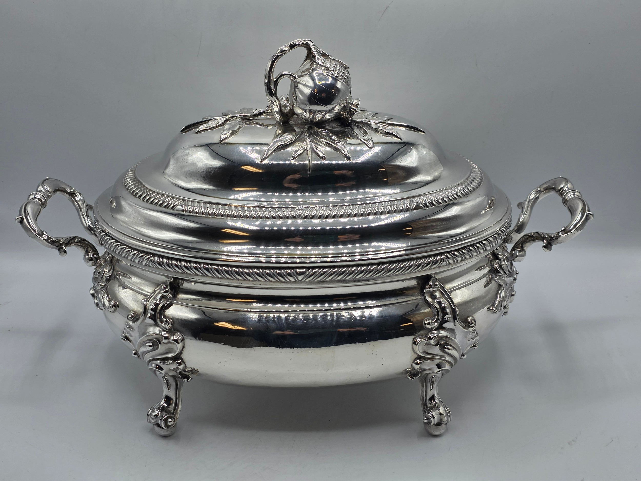 An Irish Silver lidded oval tureen with cast poppy finial, loop handles on four scroll feet, 38 cm including handles x 19 cm W x 26 cm H. Robert Calderwood Dublin.(inscribed to underside J.Hysing 3rd April 1943) 2760g
