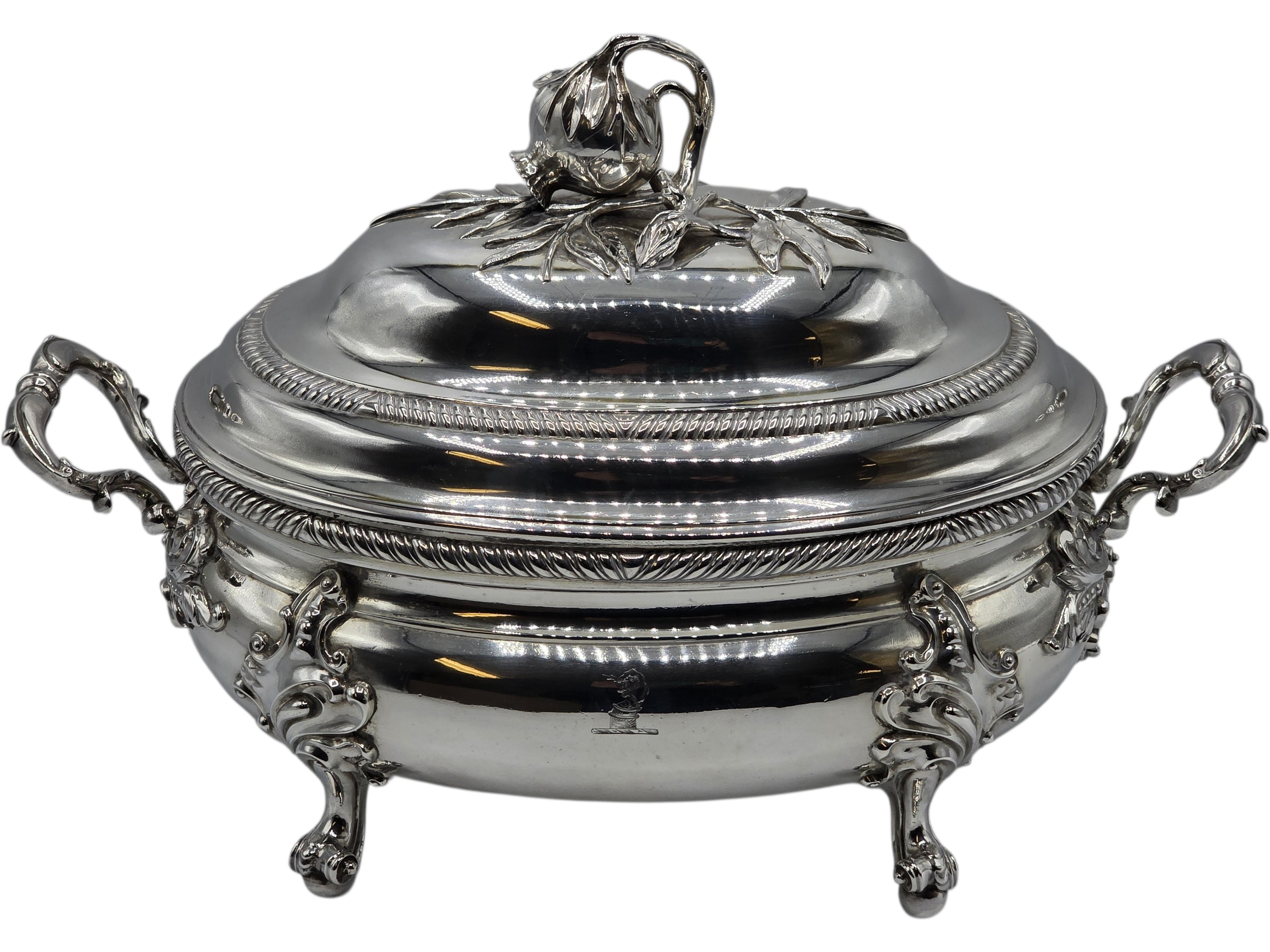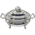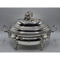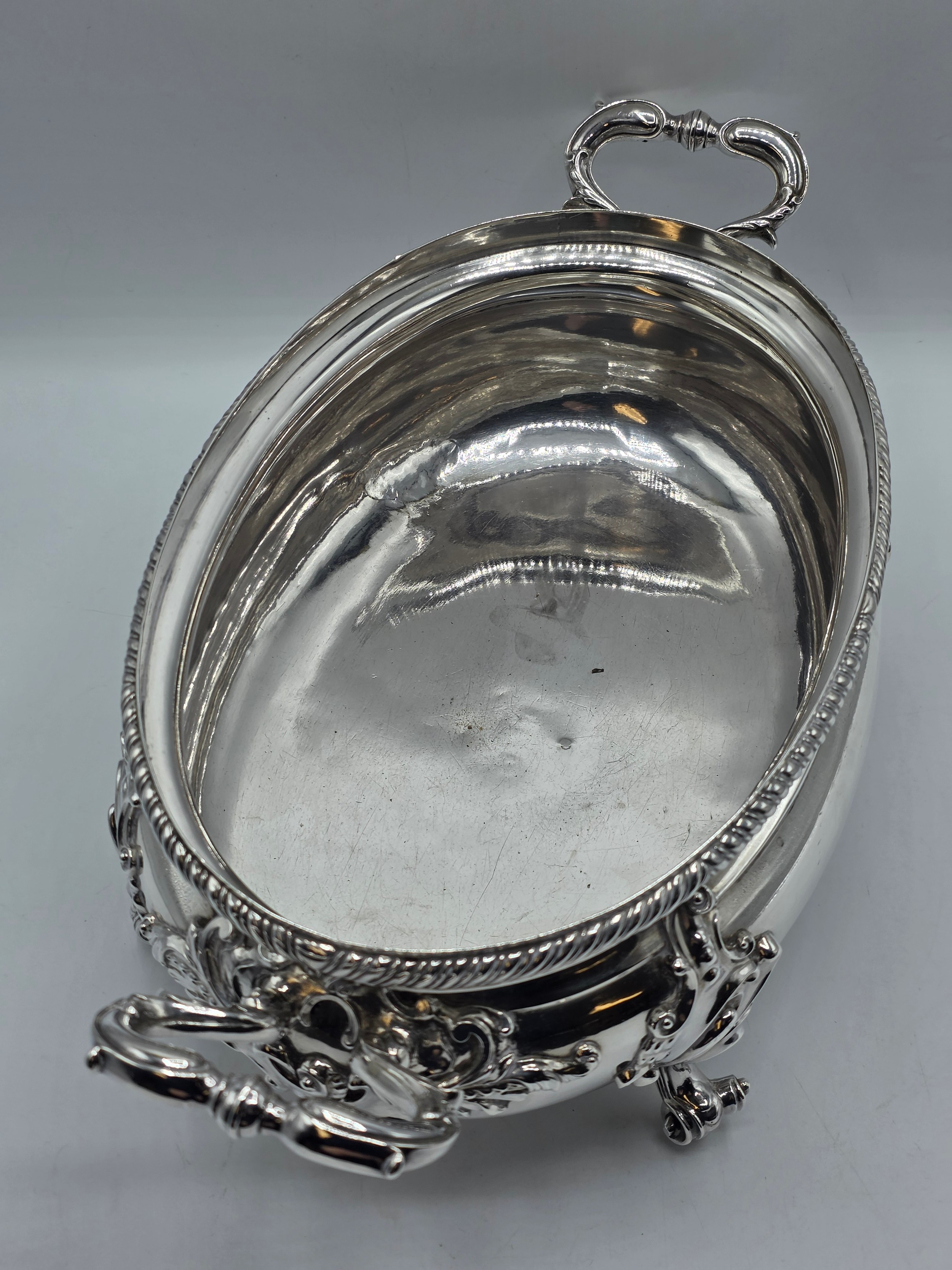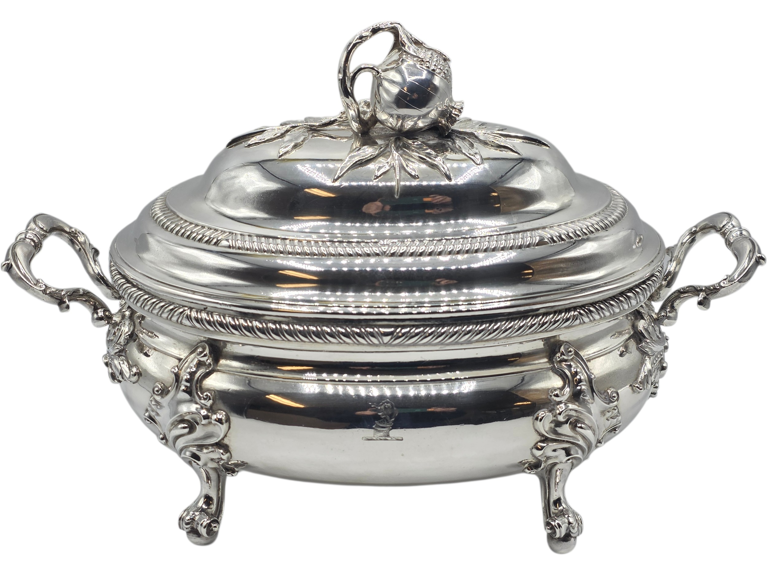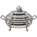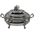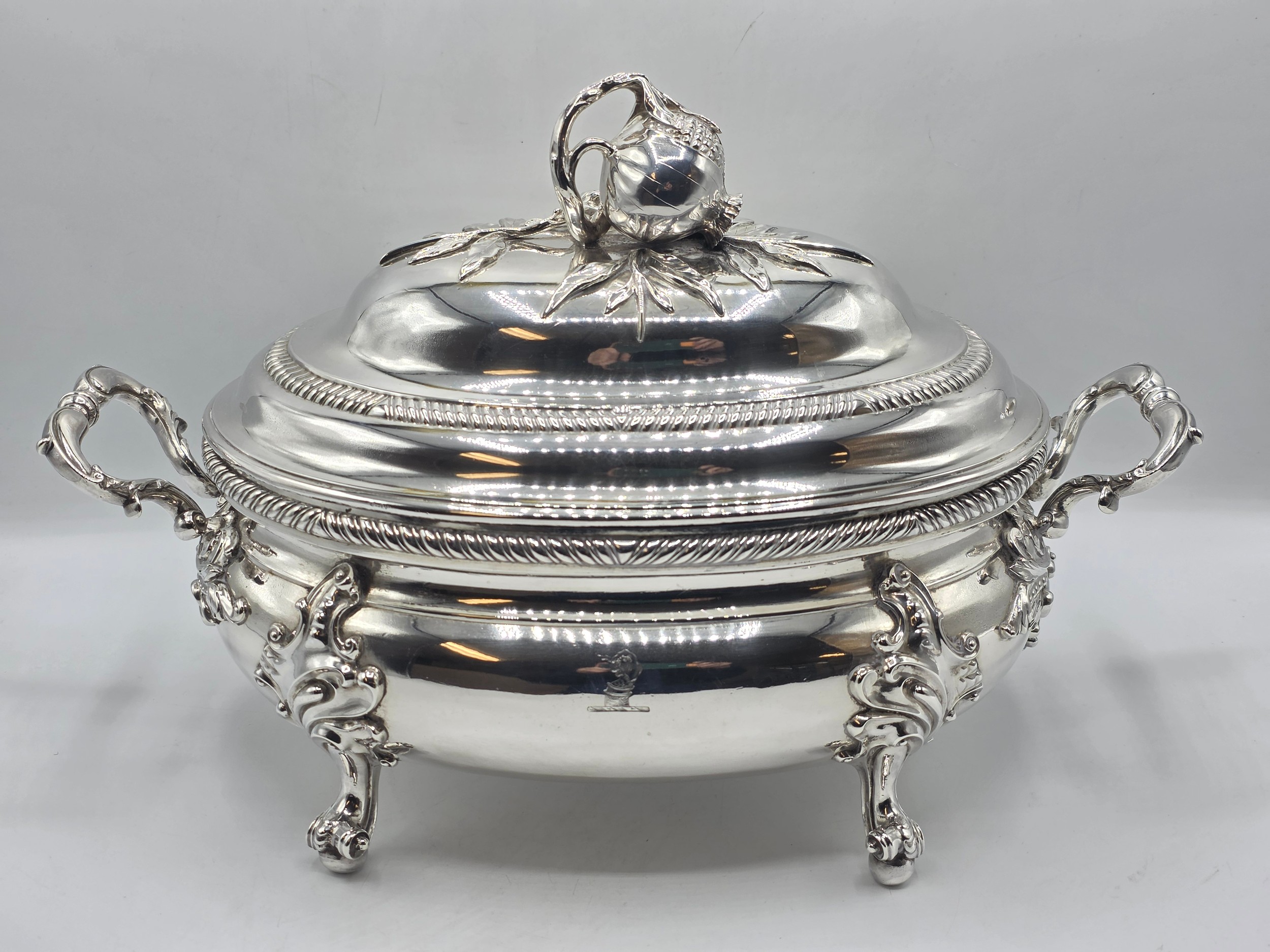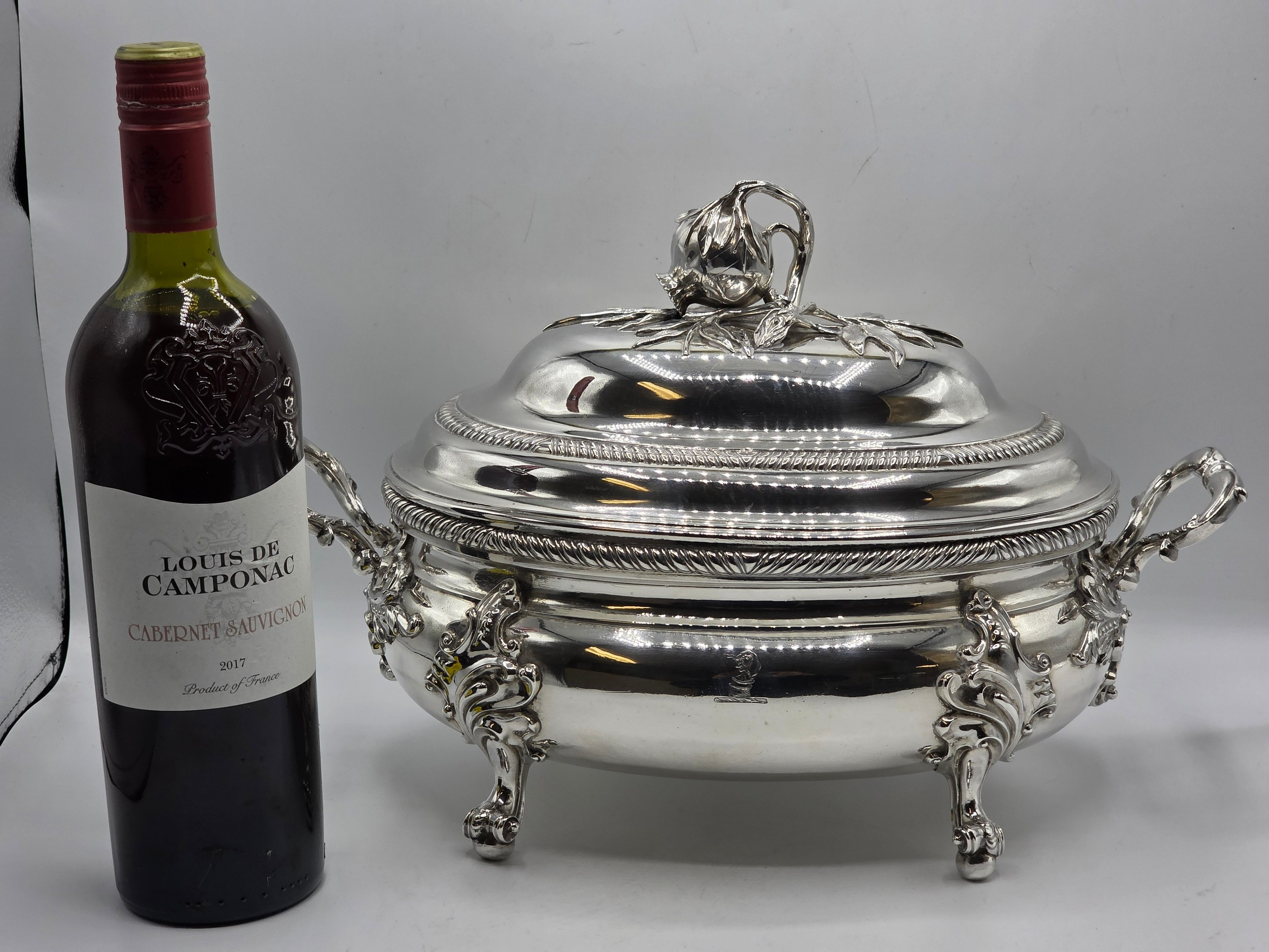An Irish Silver lidded oval tureen with cast poppy finial, loop handles on four scroll feet, 38 cm including handles x 19 cm W x 26 cm H. Robert Calderwood Dublin.(inscribed to underside J.Hysing 3rd April 1943) 2760g