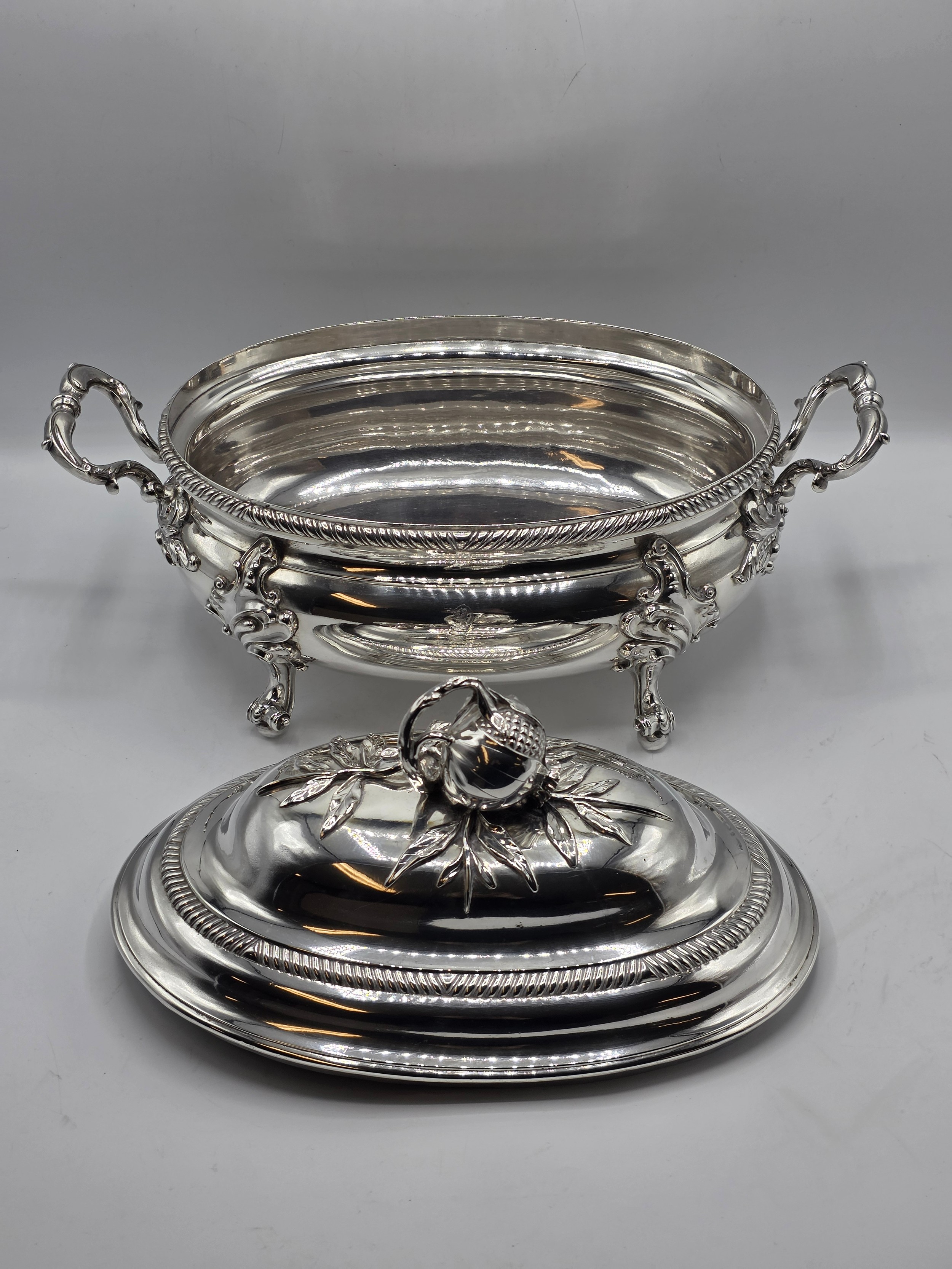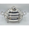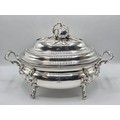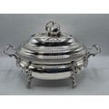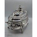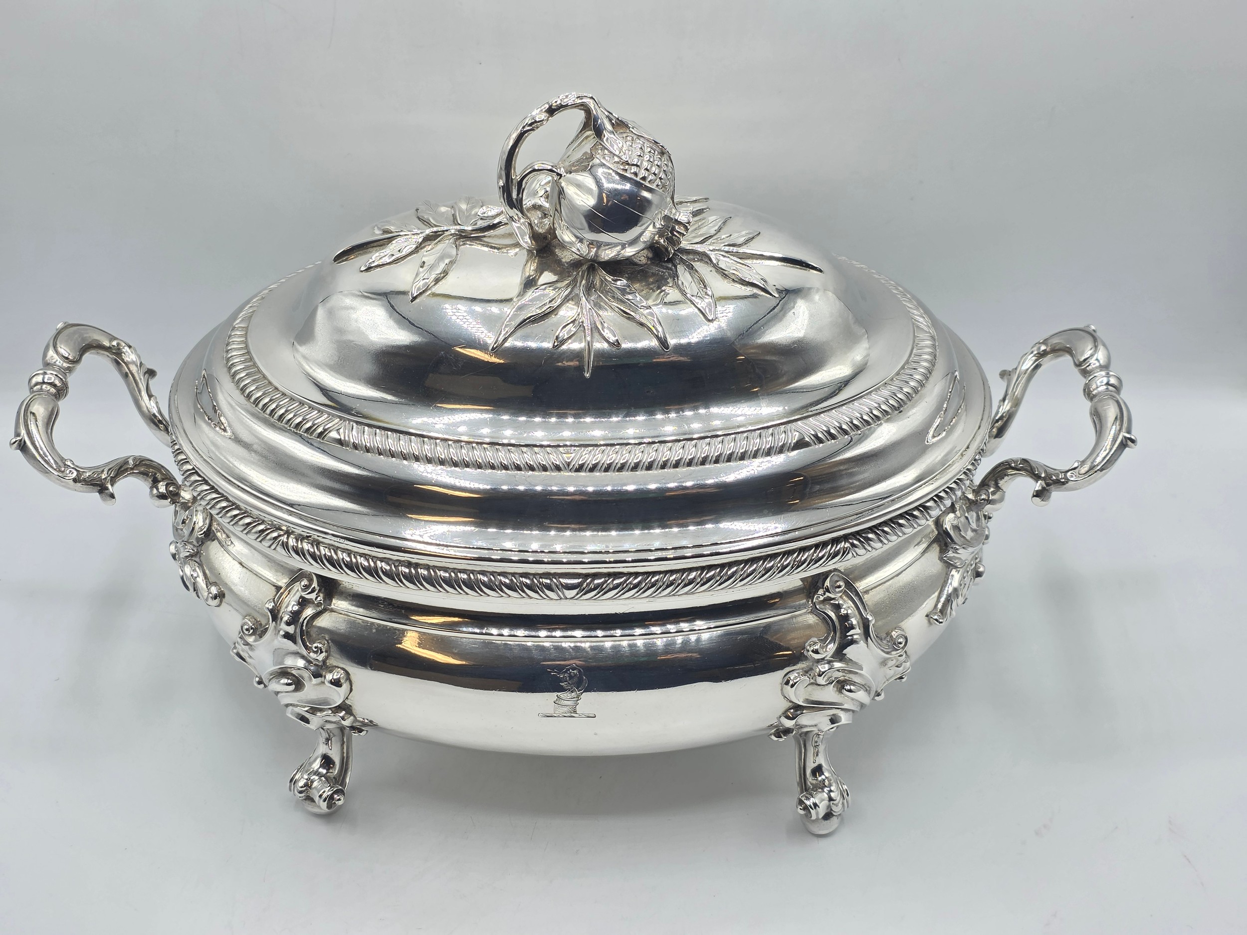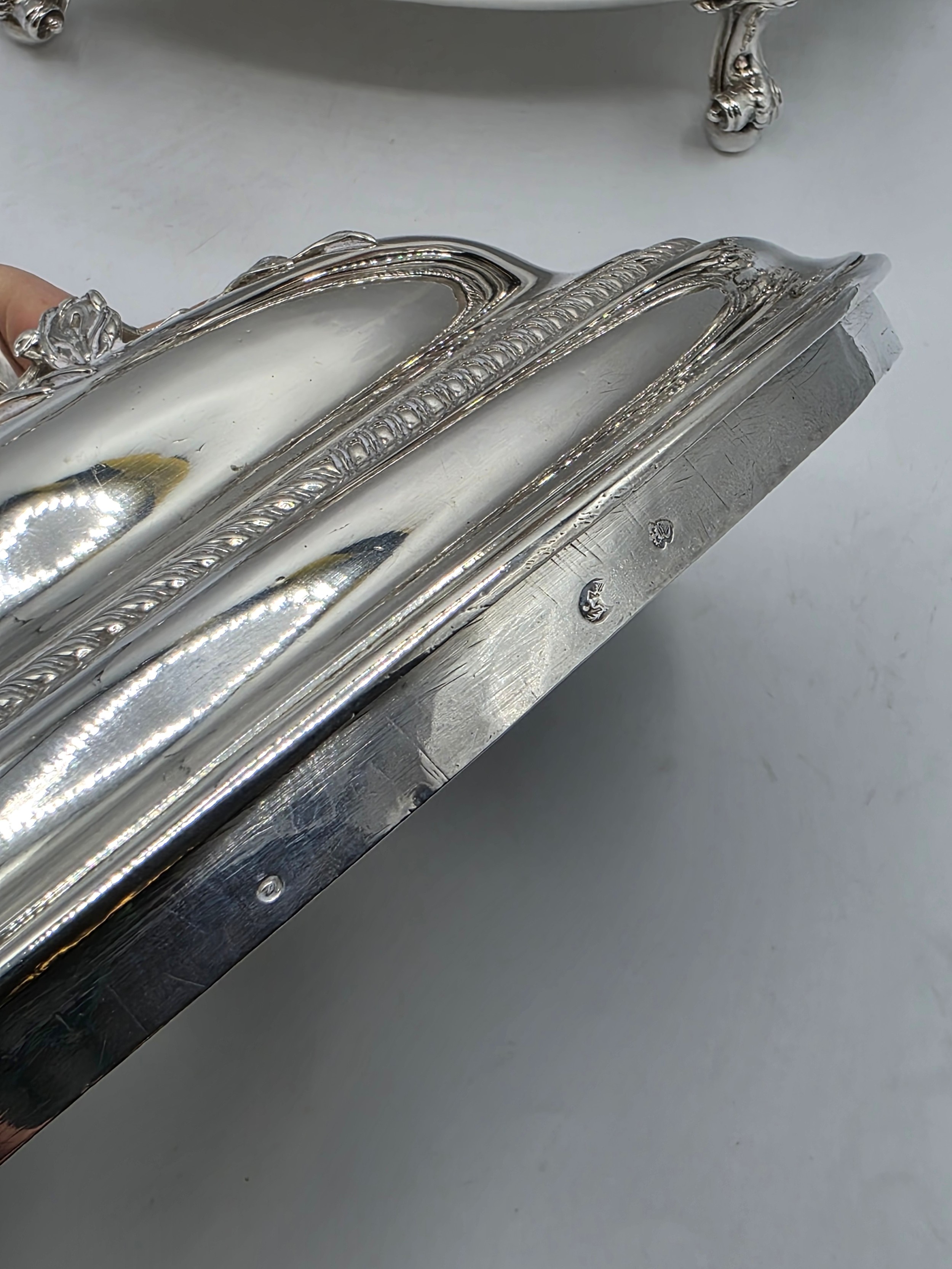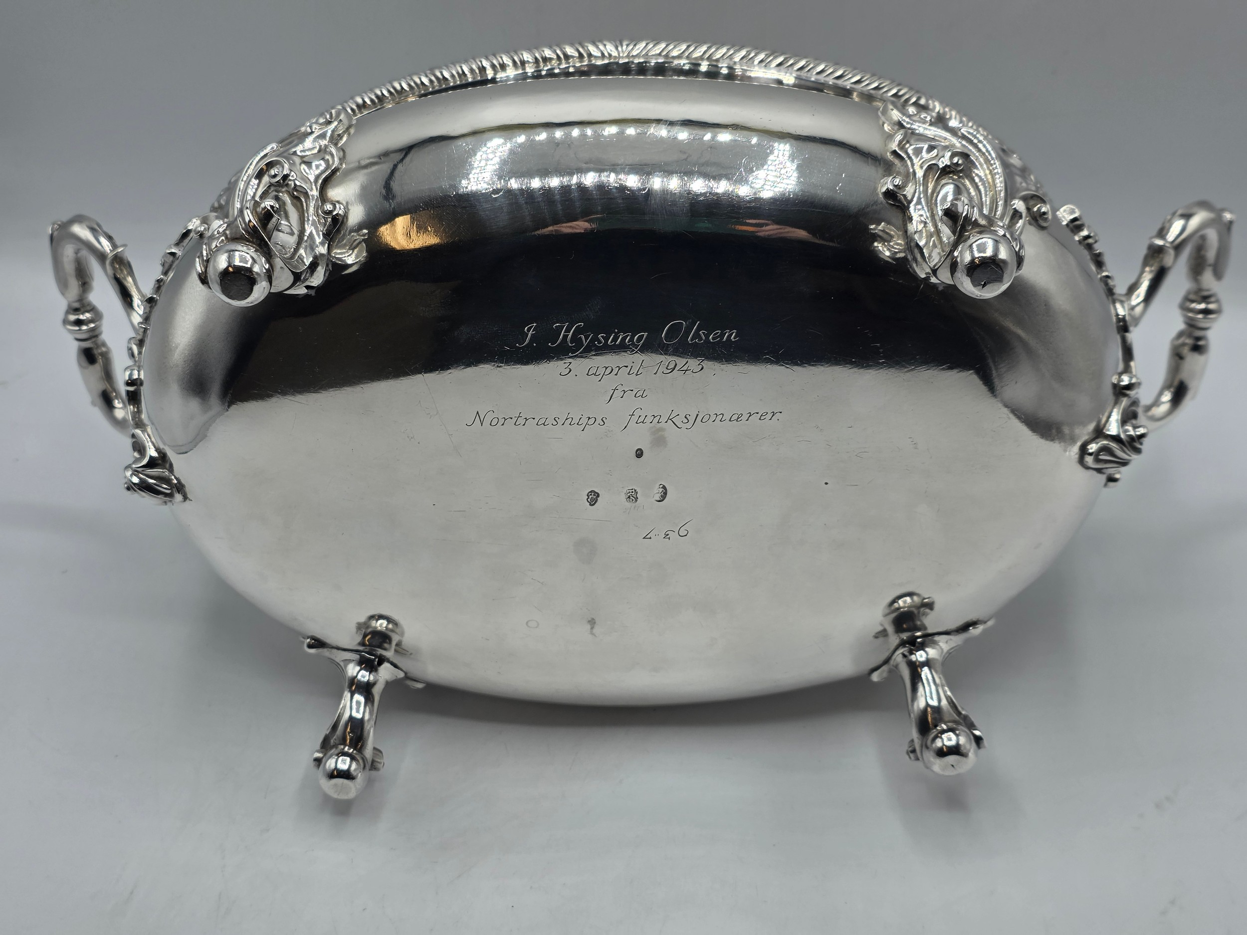 An Irish Silver lidded oval tureen with cast poppy finial, loop handles on four scroll feet, 38 cm including handles x 19 cm W x 26 cm H. Robert Calderwood Dublin.(inscribed to underside J.Hysing 3rd April 1943) 2760g