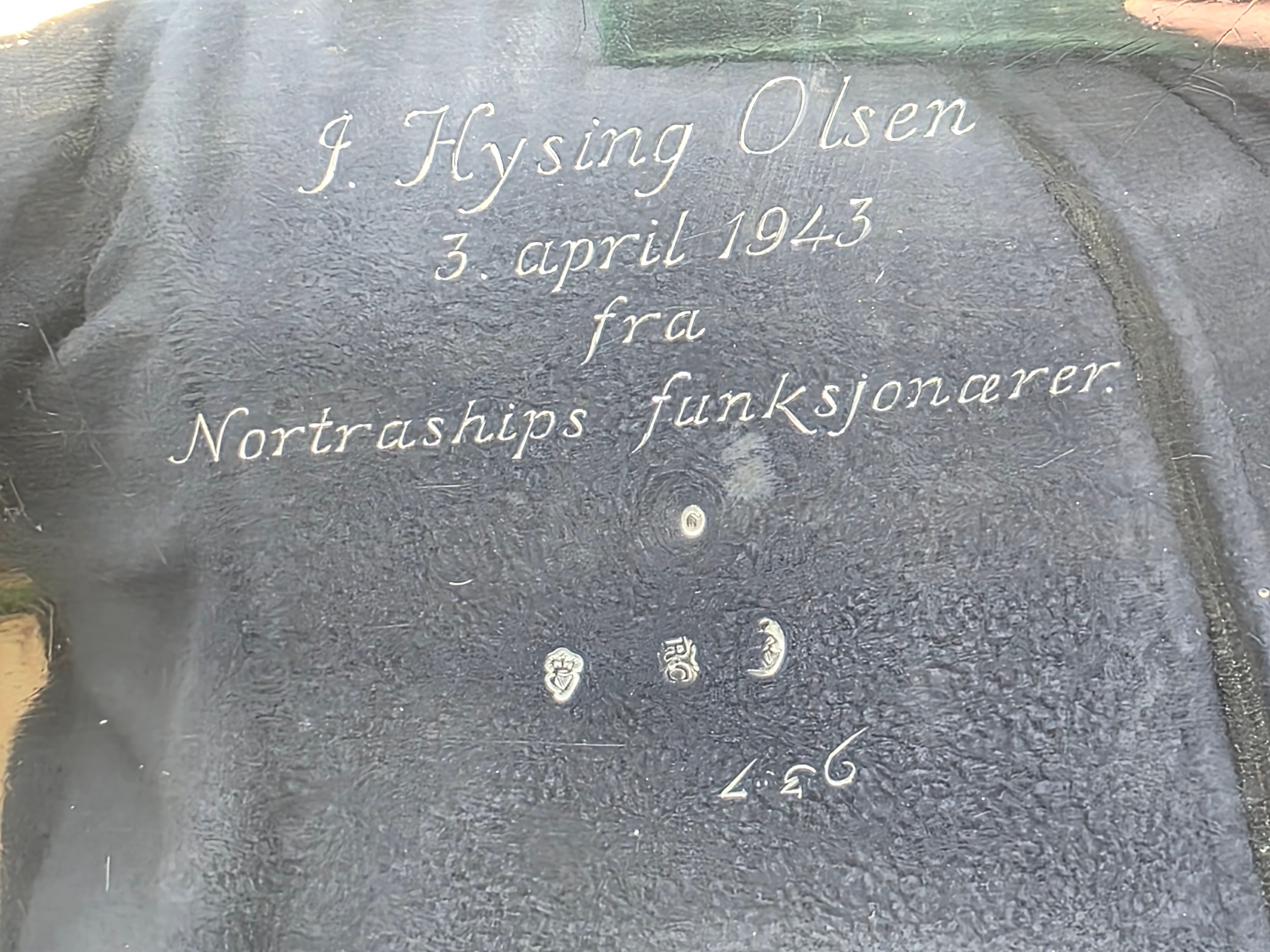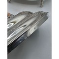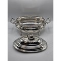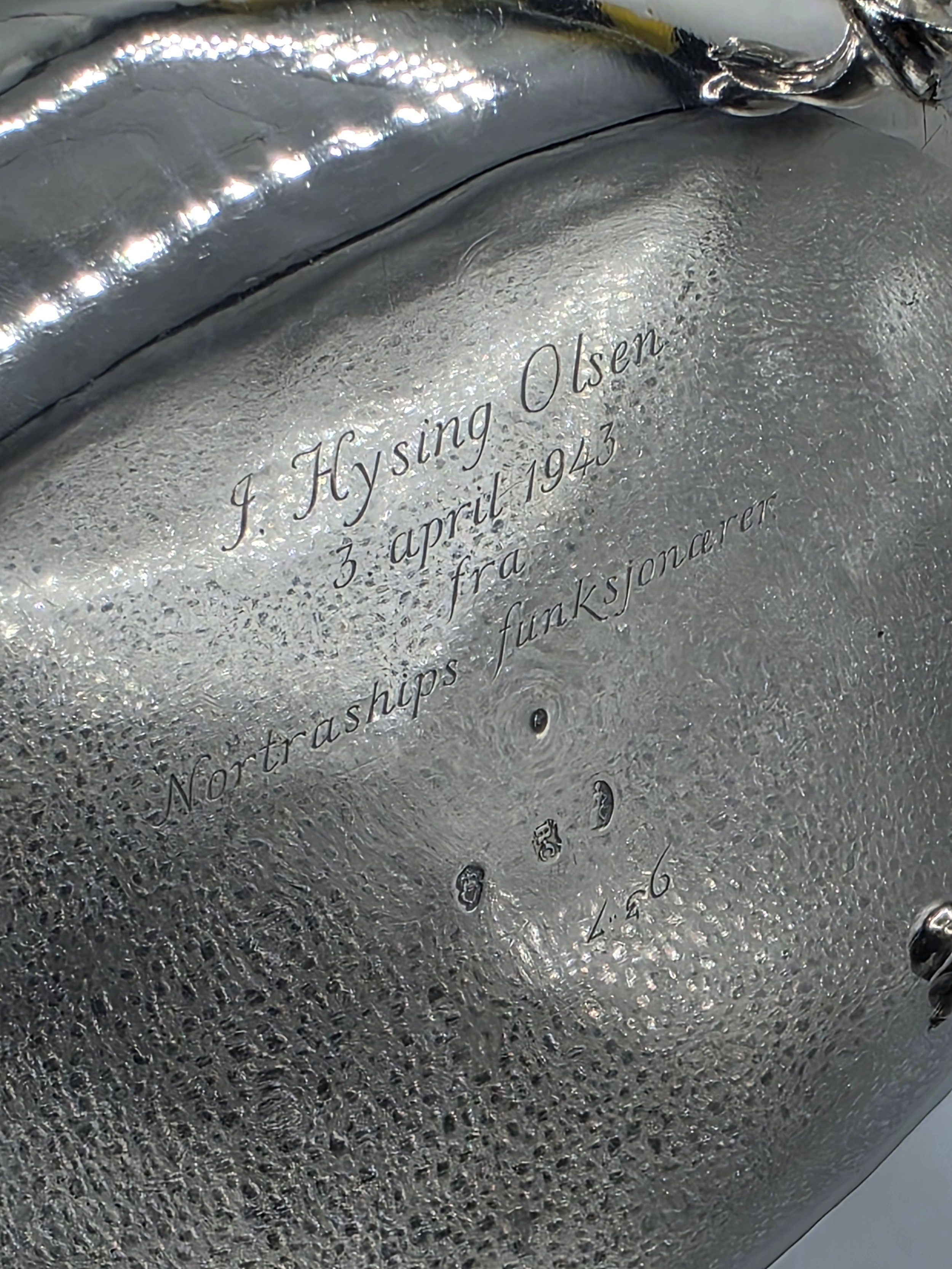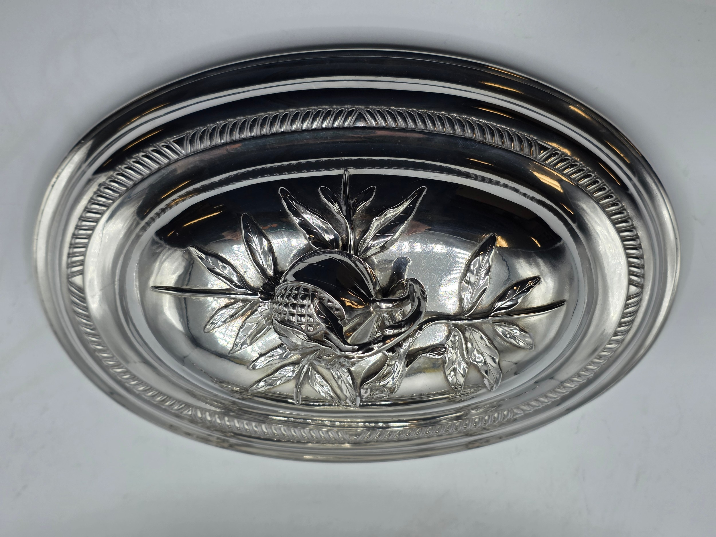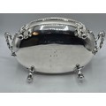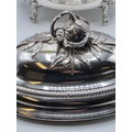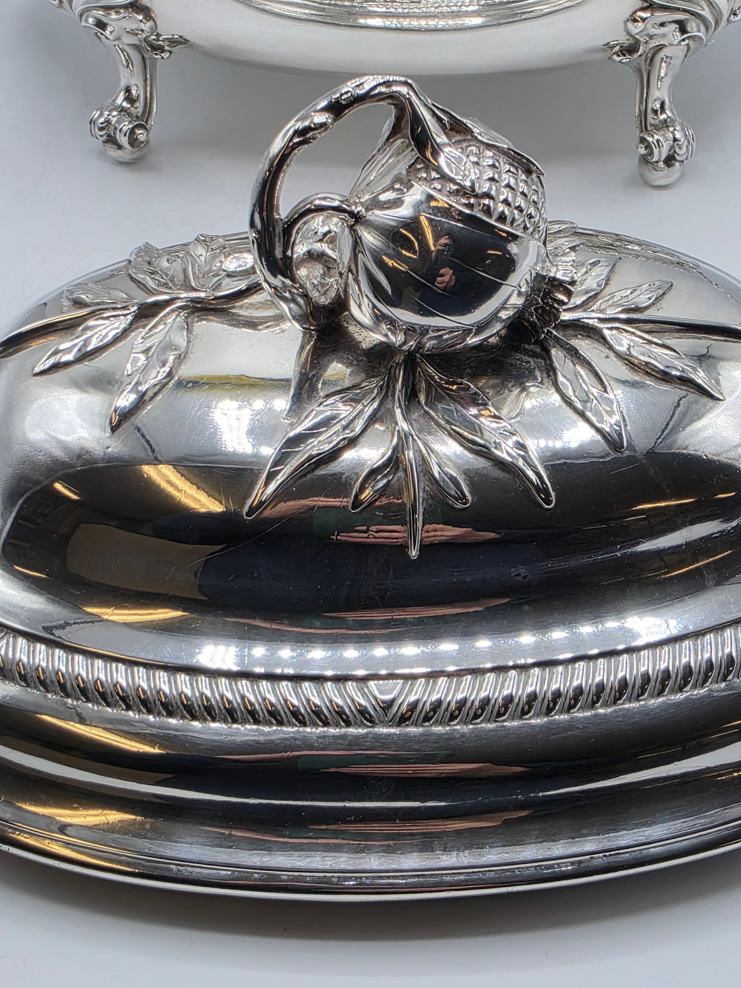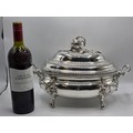 An Irish Silver lidded oval tureen with cast poppy finial, loop handles on four scroll feet, 38 cm including handles x 19 cm W x 26 cm H. Robert Calderwood Dublin.(inscribed to underside J.Hysing 3rd April 1943) 2760g