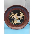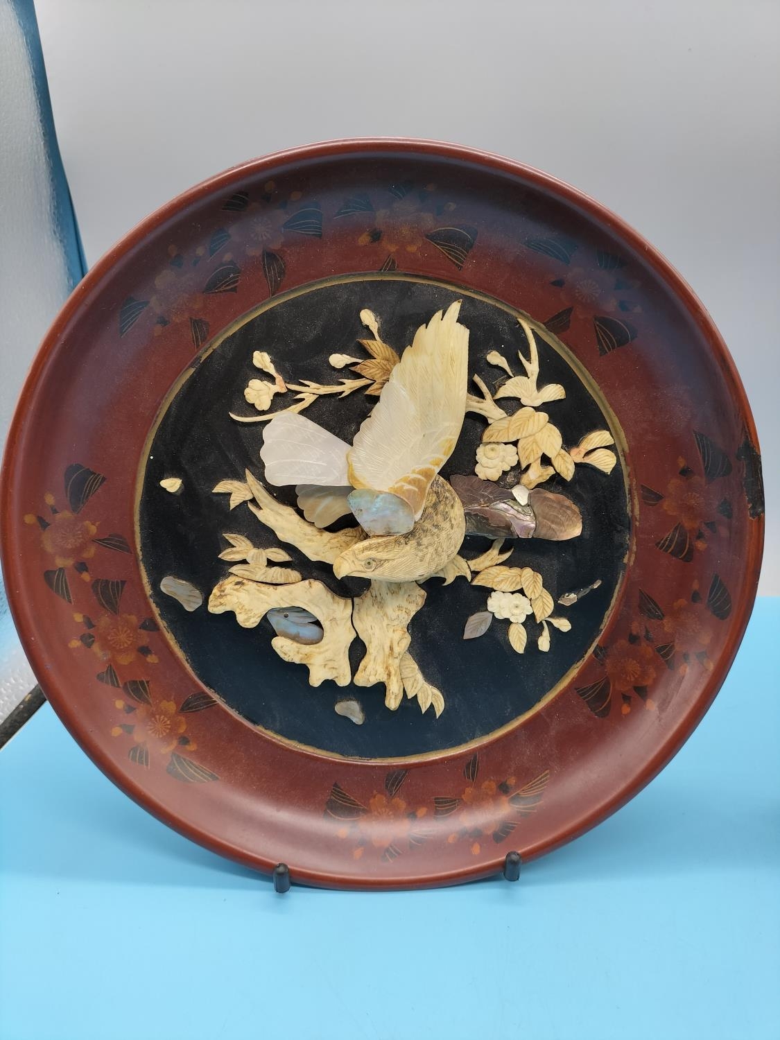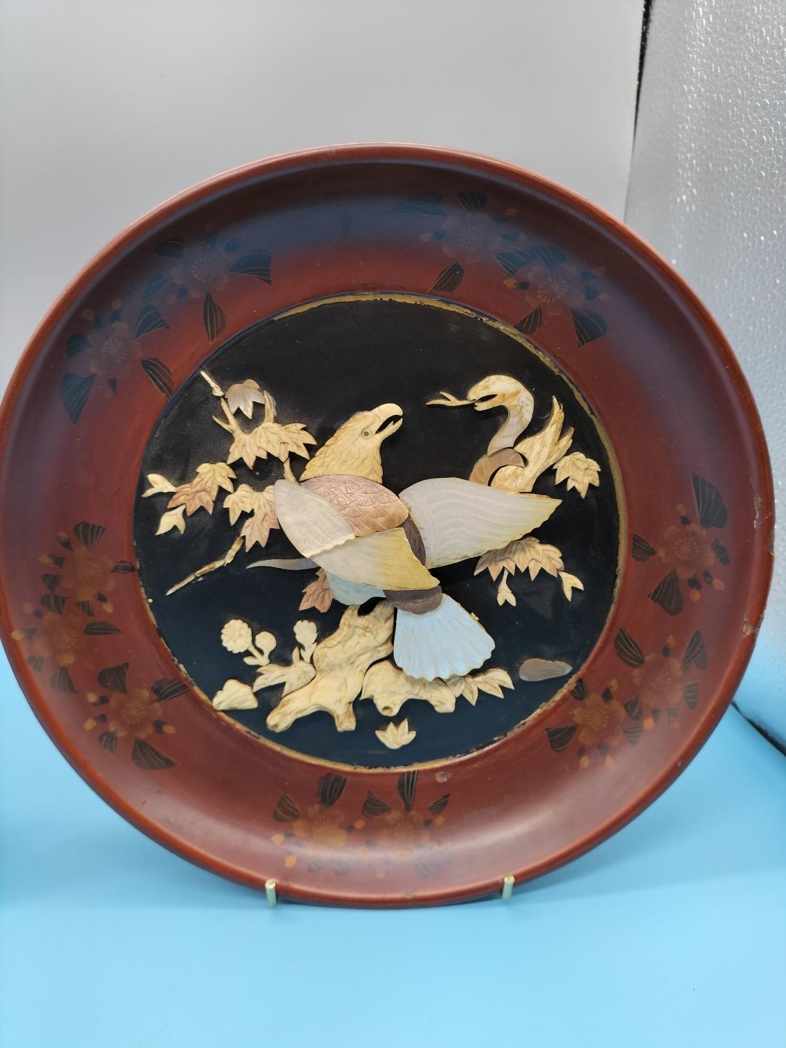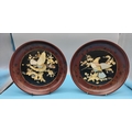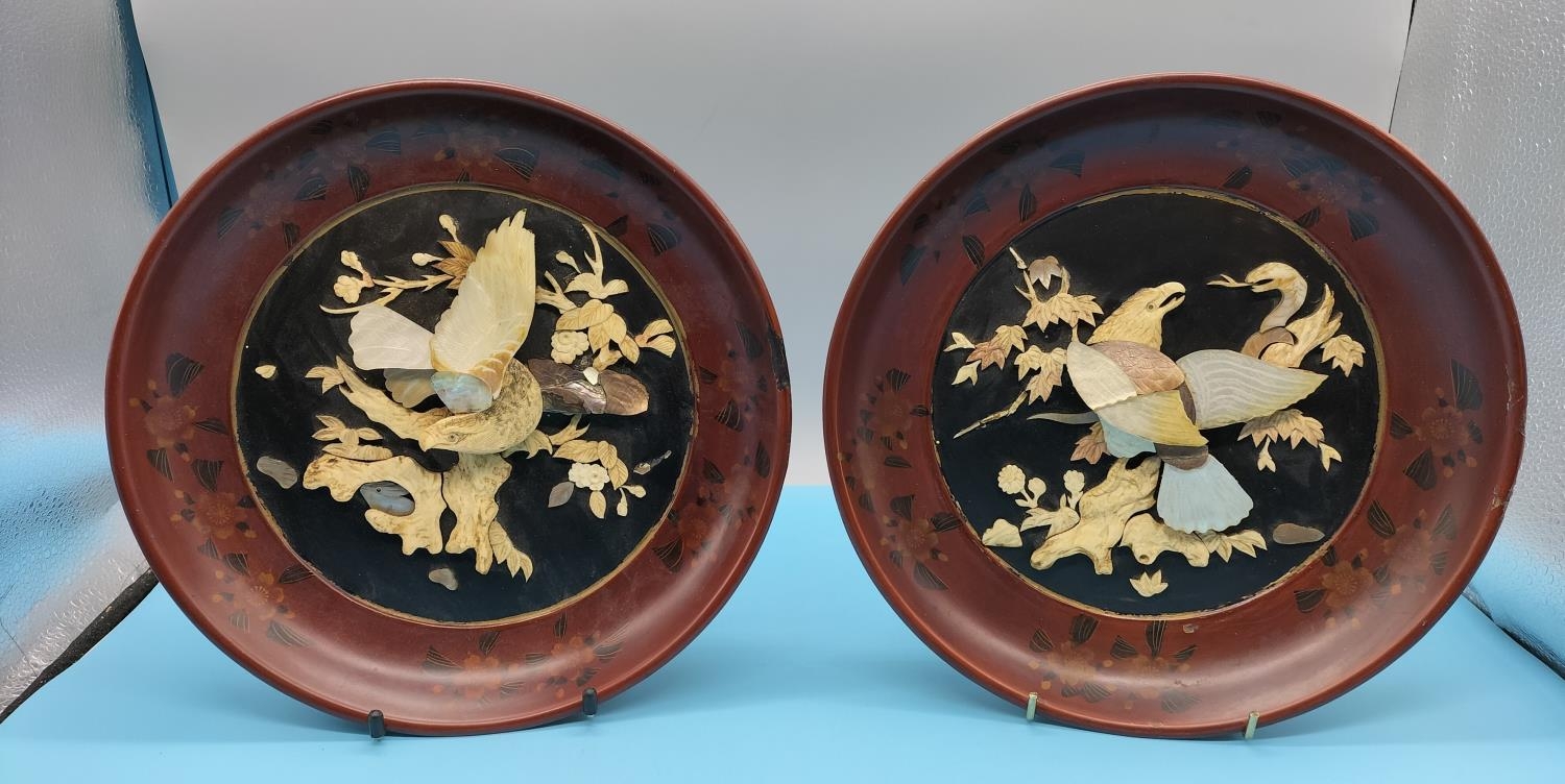 2 x Meiji Period c1880-90 Circular Shibayama Red and Black Lacquer Plaques with Bone and Mother of Pearl Decoration depicting Eagle Fighting a Snake. Slight A/F to 1 Plaque. 25cm Diameter.