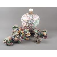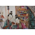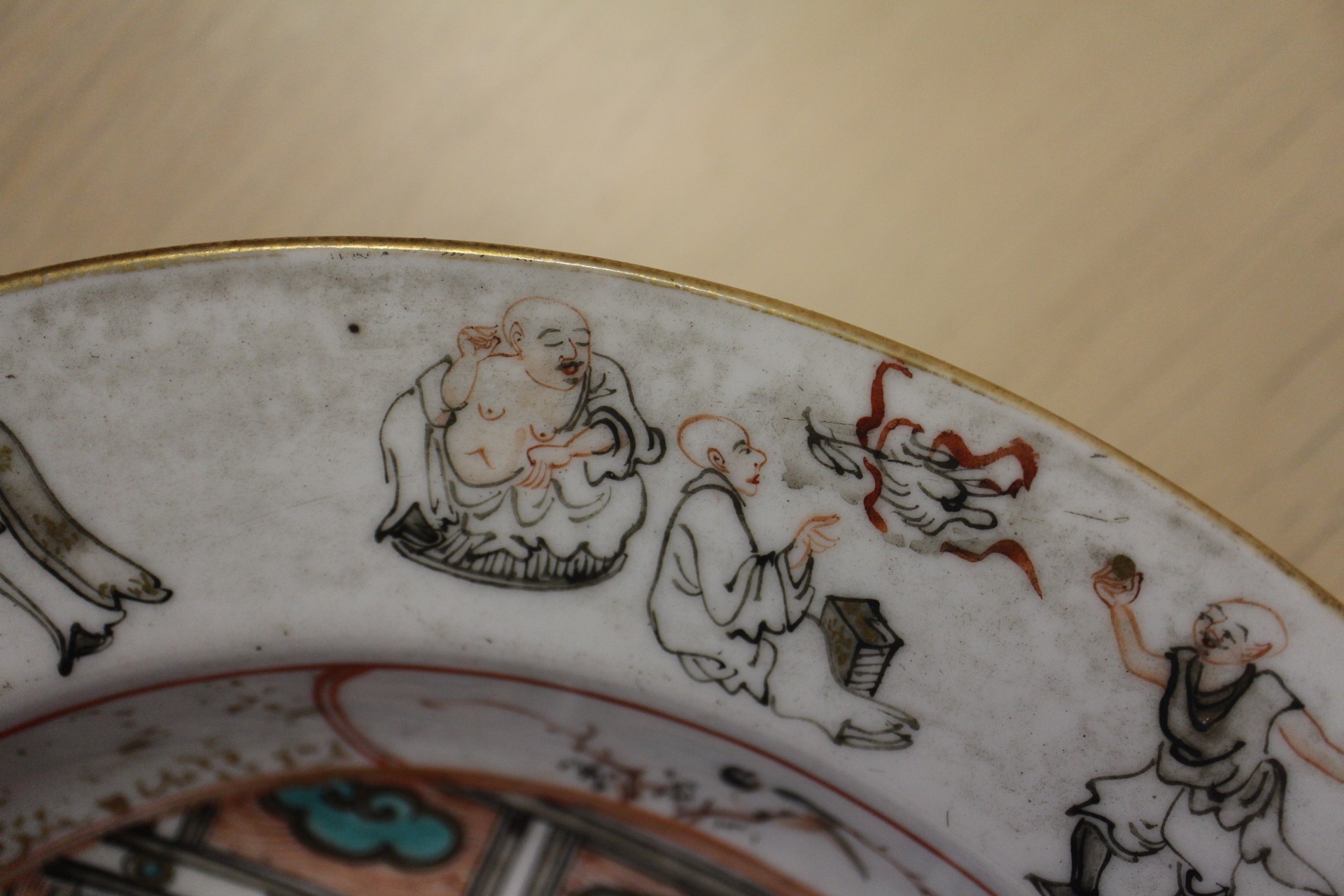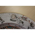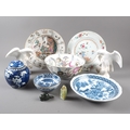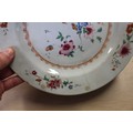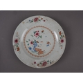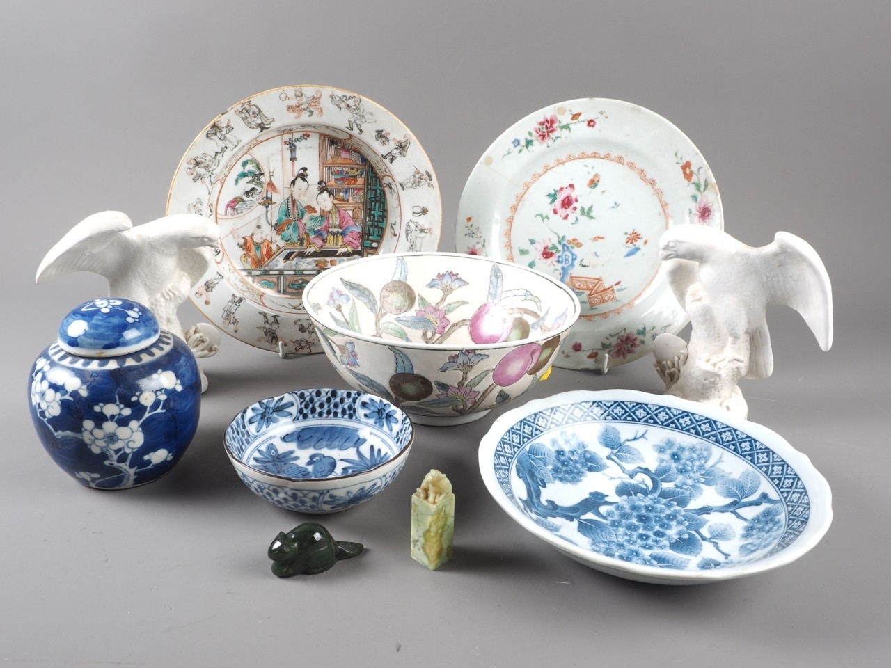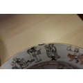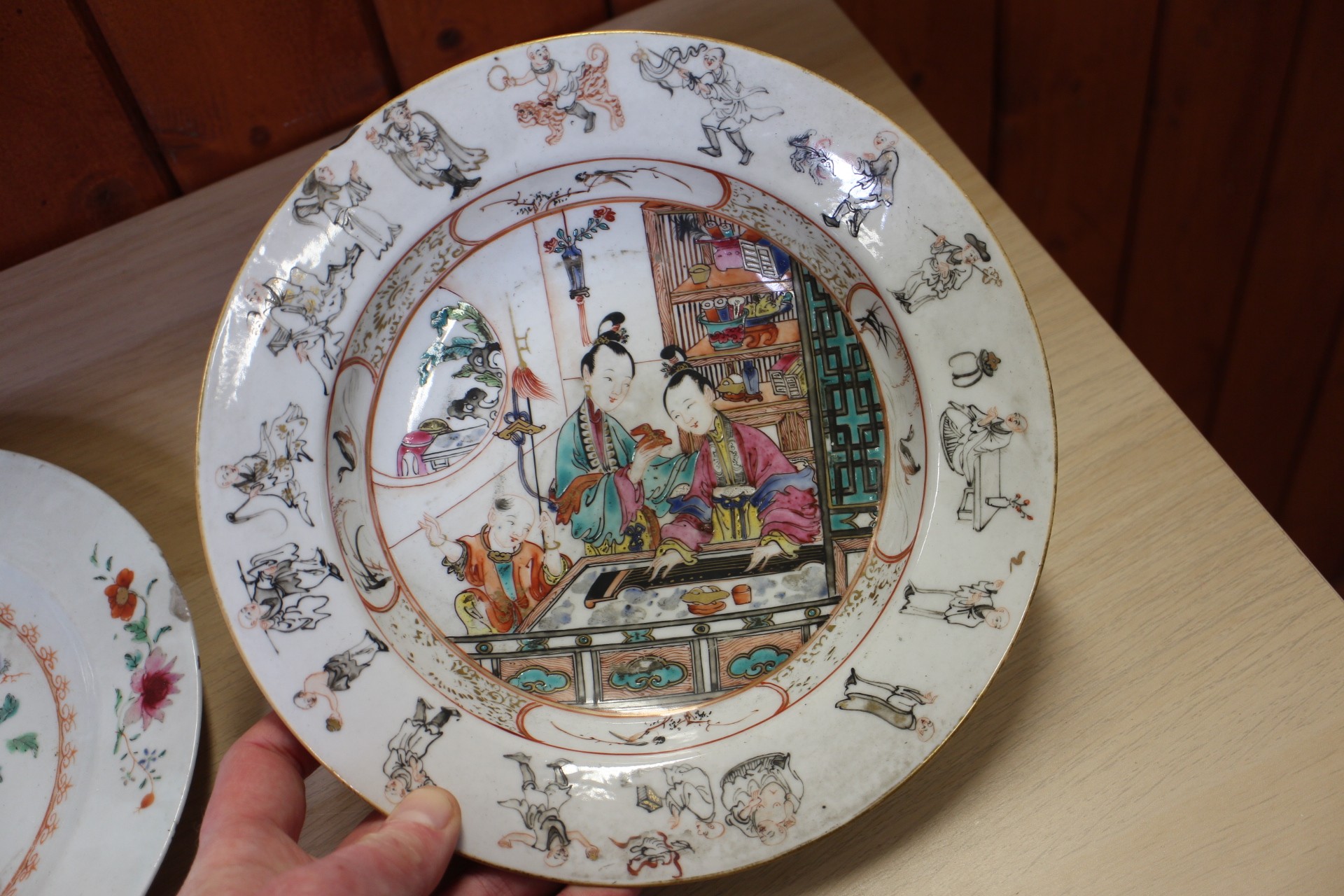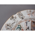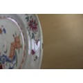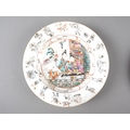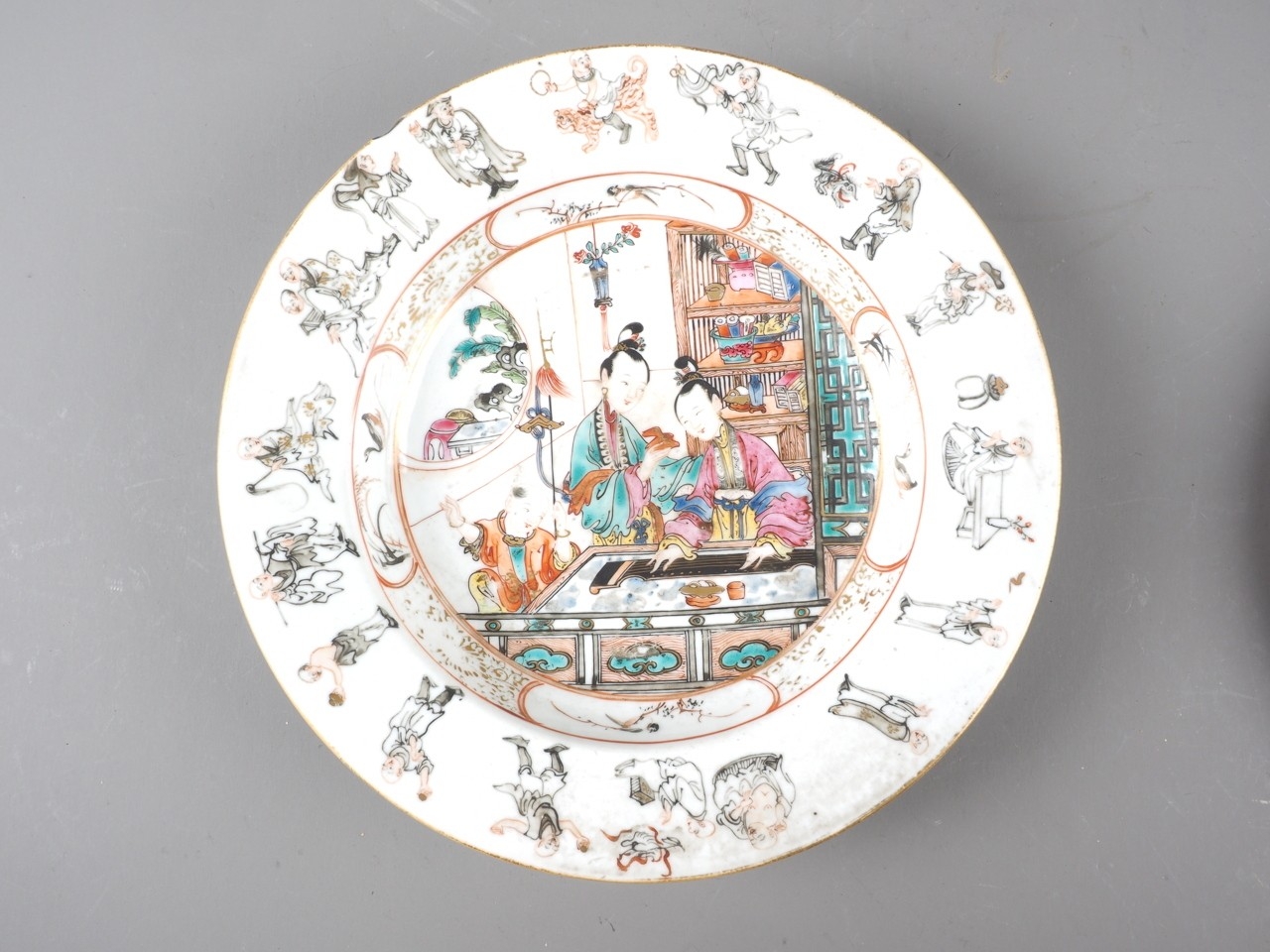 A Chinese Famille Rose dish with central interior scene, figures and precious object decoration surrounded by various other figures, 8 3/4” dia (chipped) a smaller plate with floral decoration, and other Oriental china, various