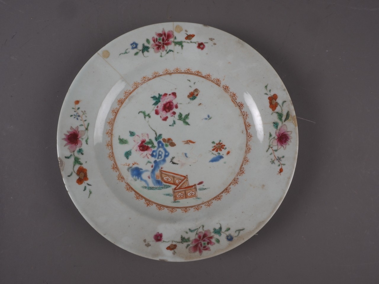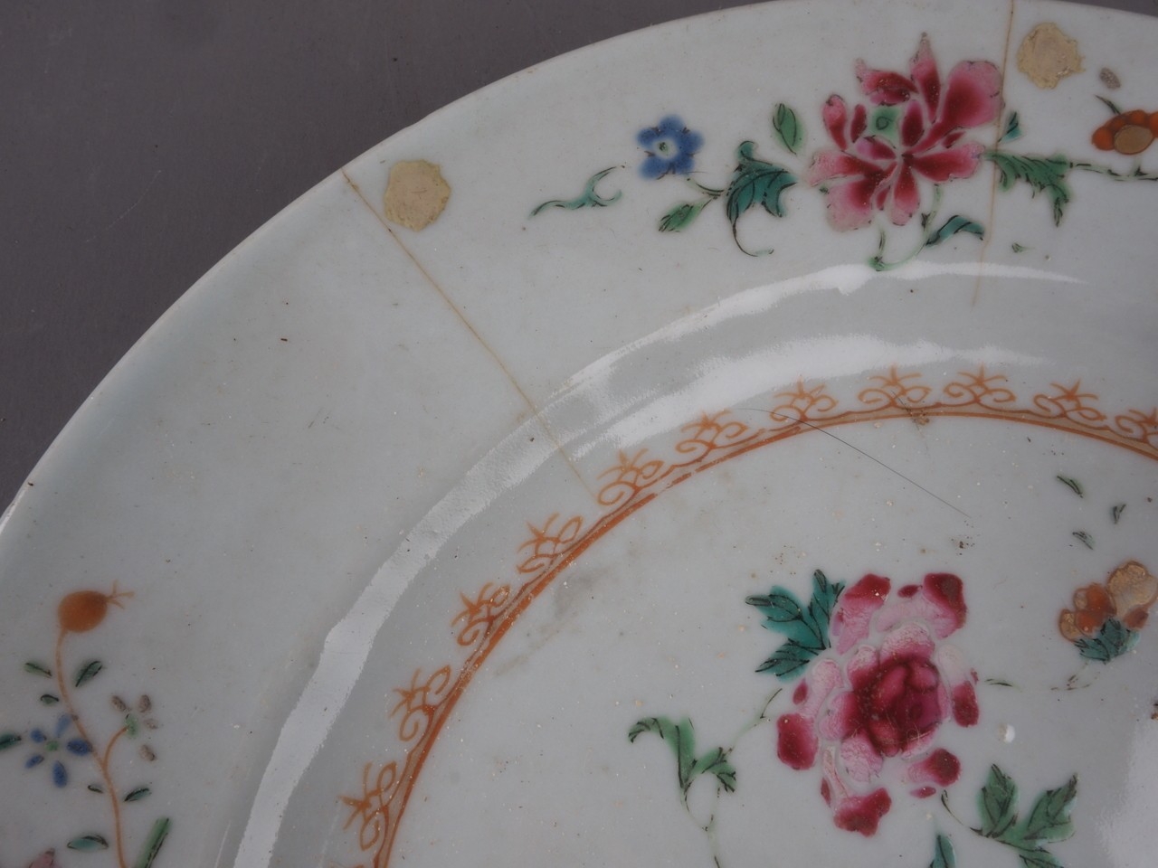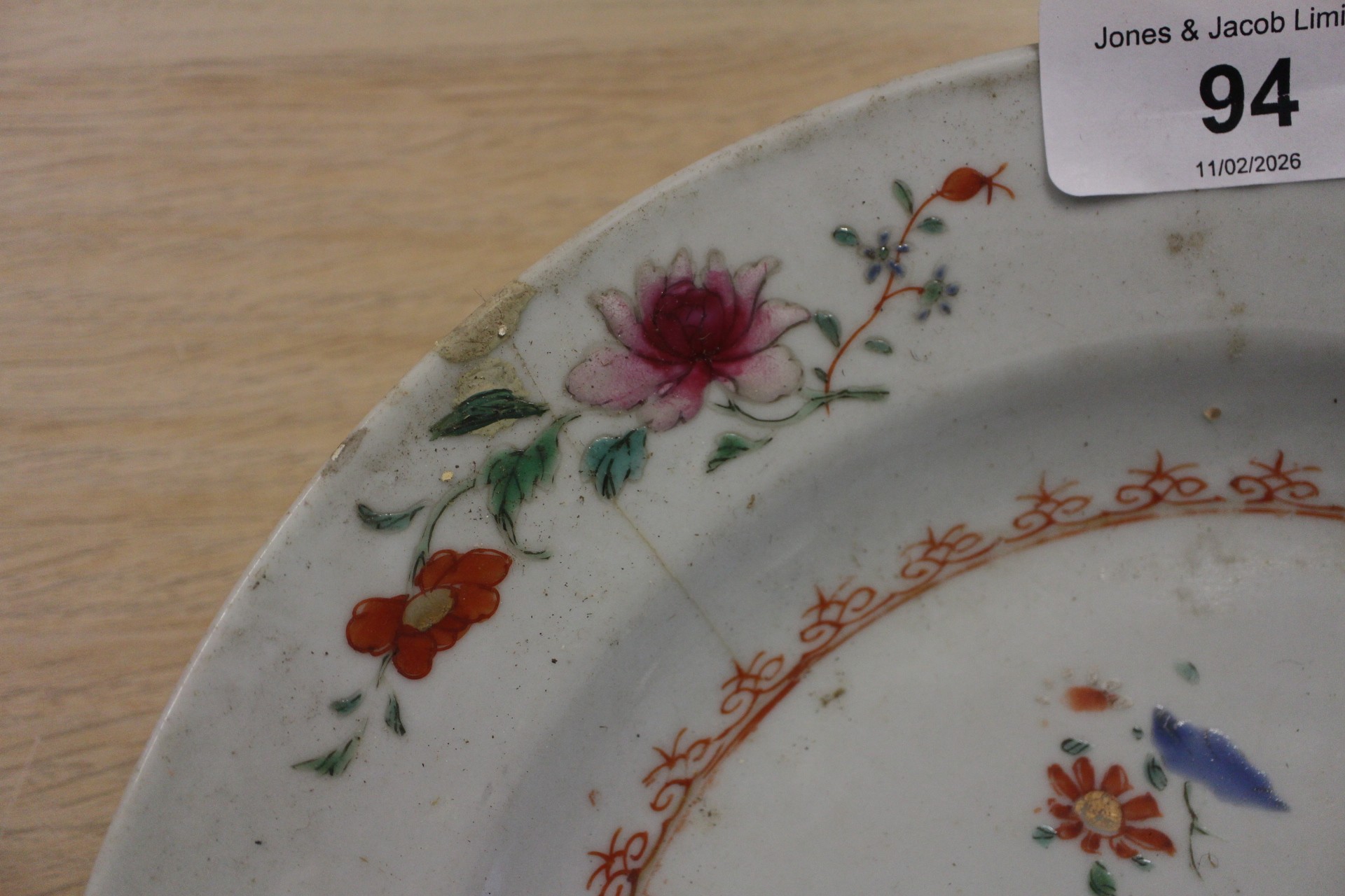 The other dish with floral decoration is chipped, cracked and has some losses to the decoration.