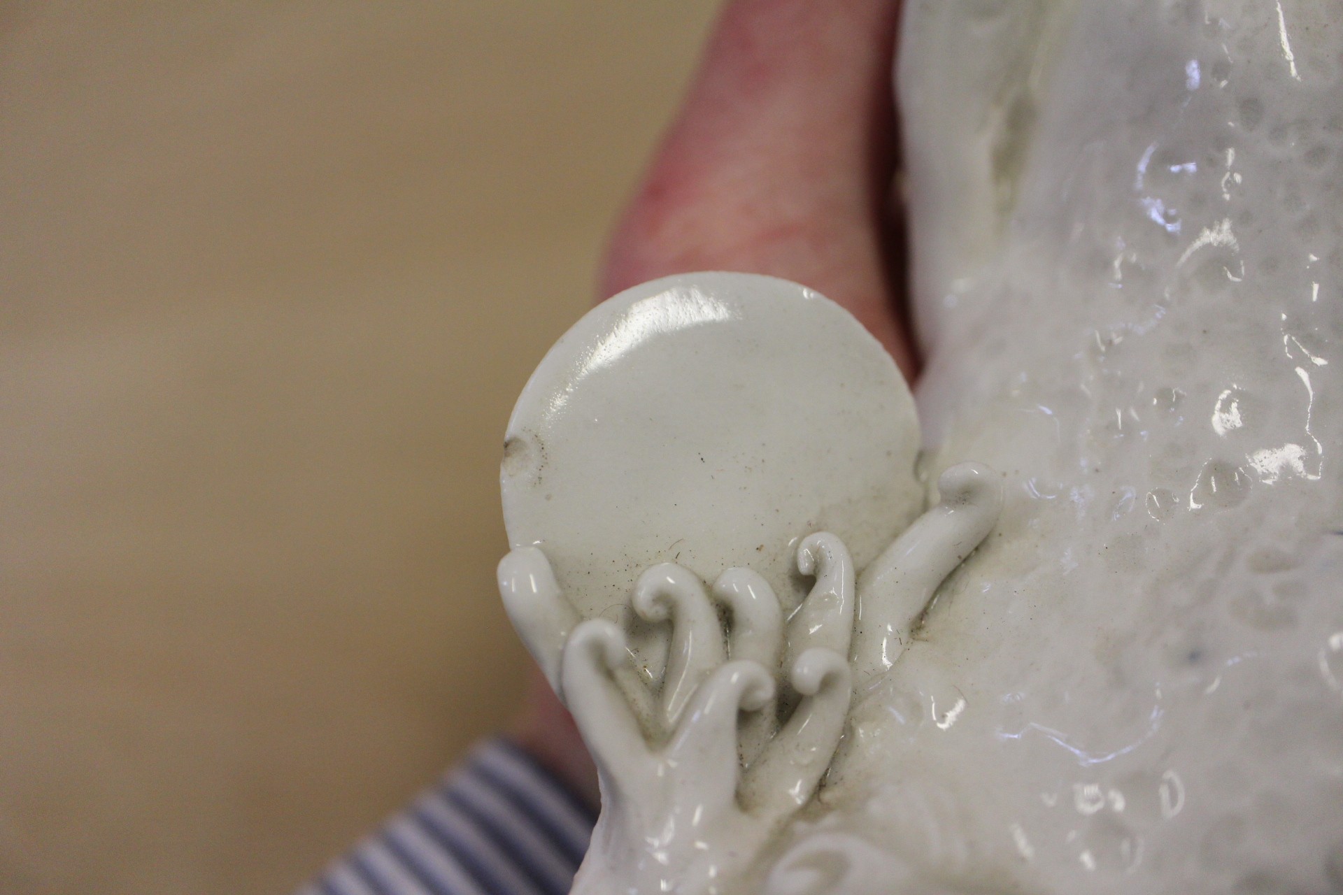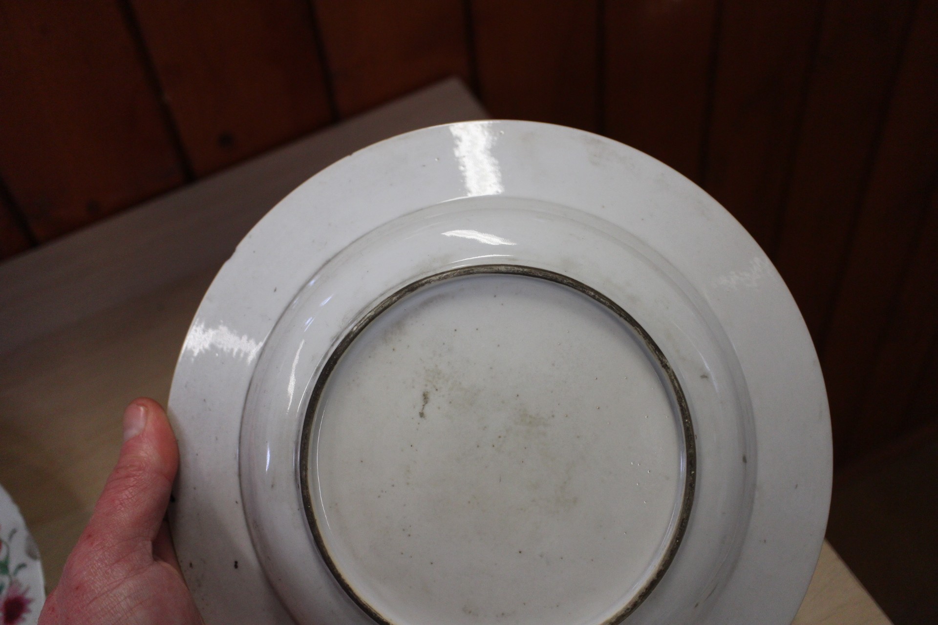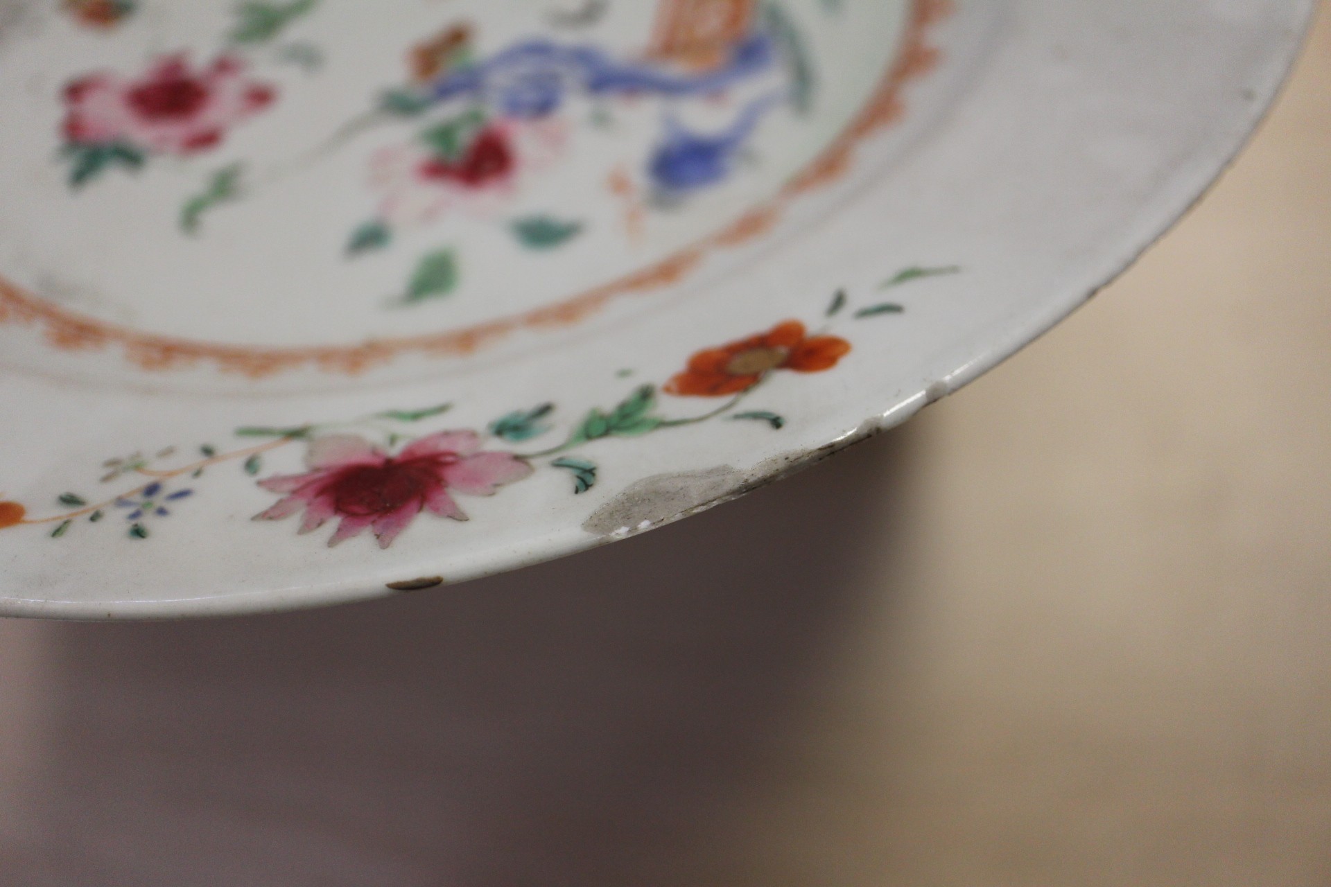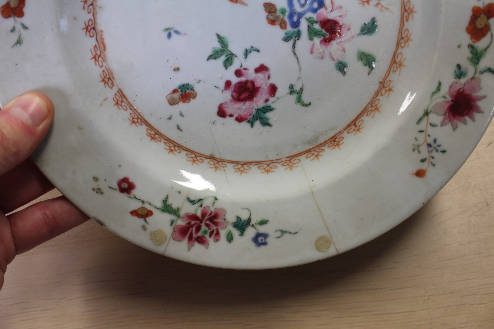 The other dish with floral decoration is chipped, cracked and has some losses to the decoration.