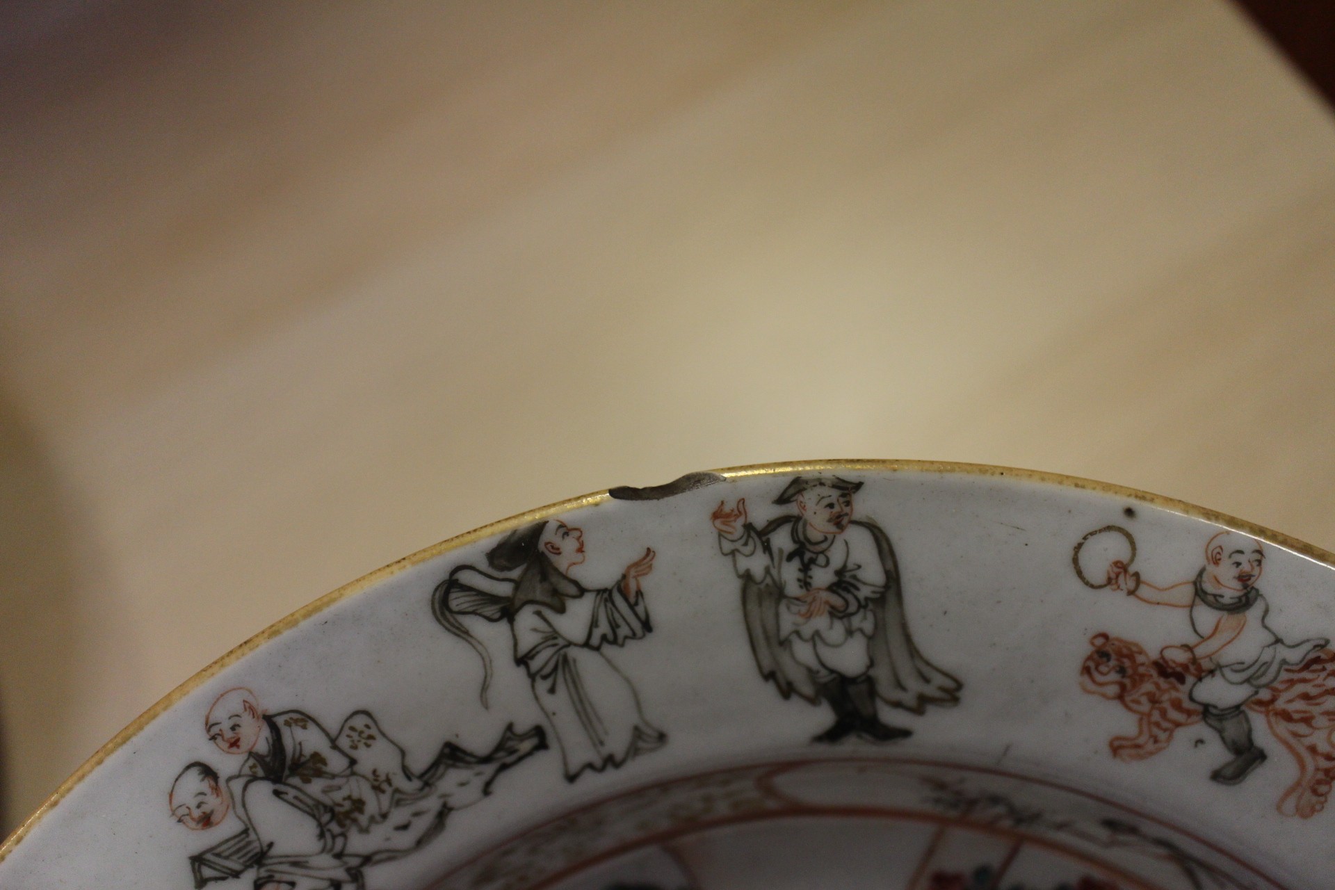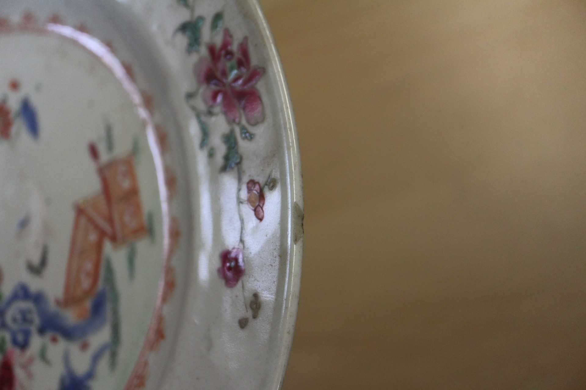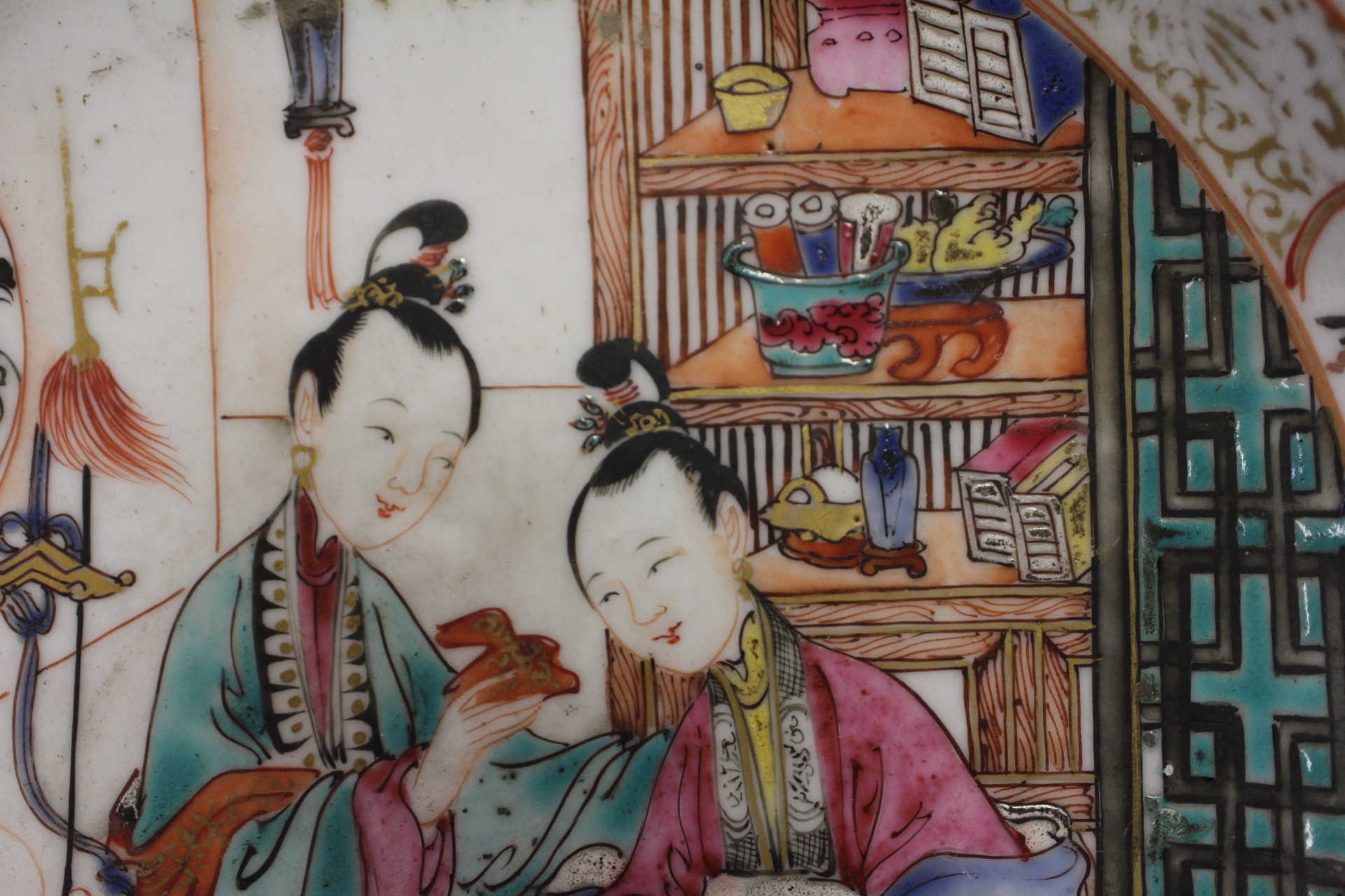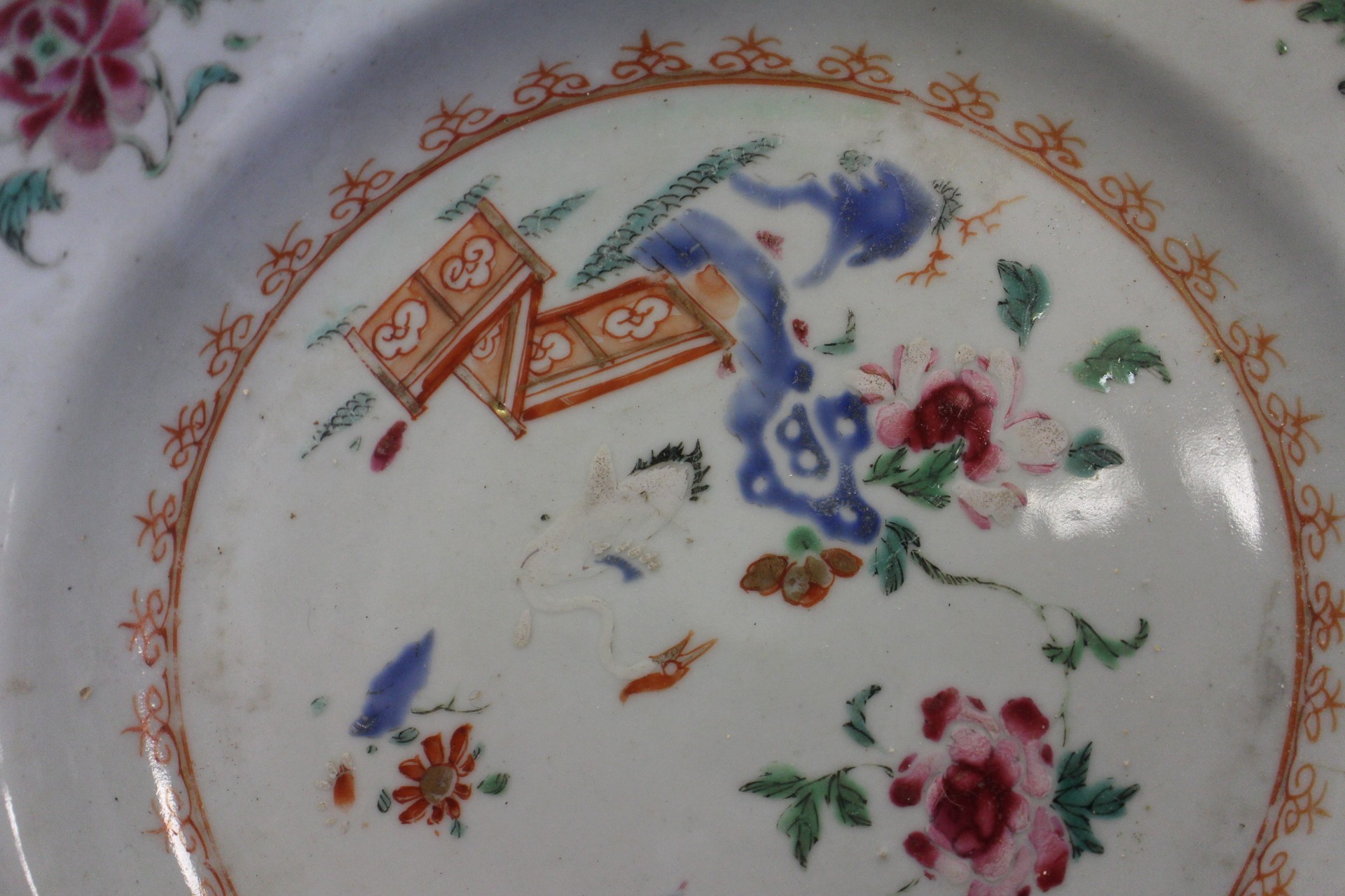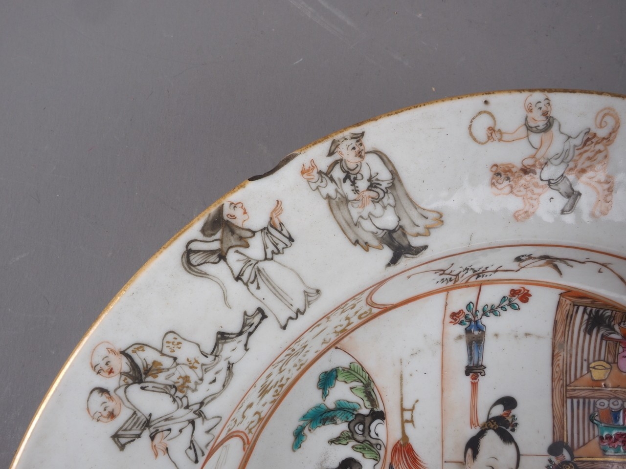 The dish with interior scene has a chip to the rim and some slight decoration losses.