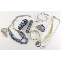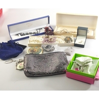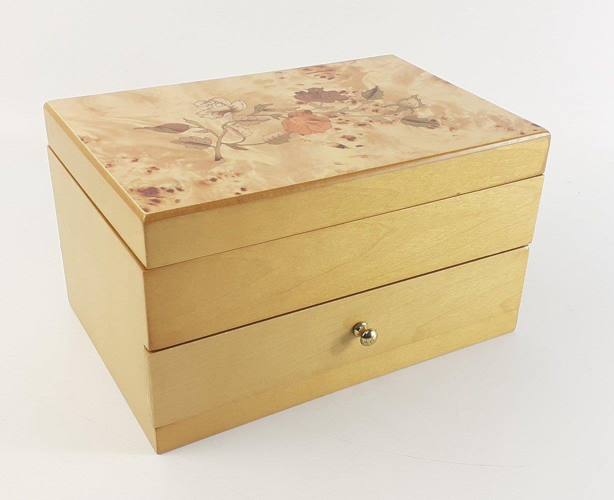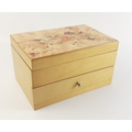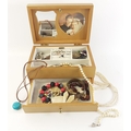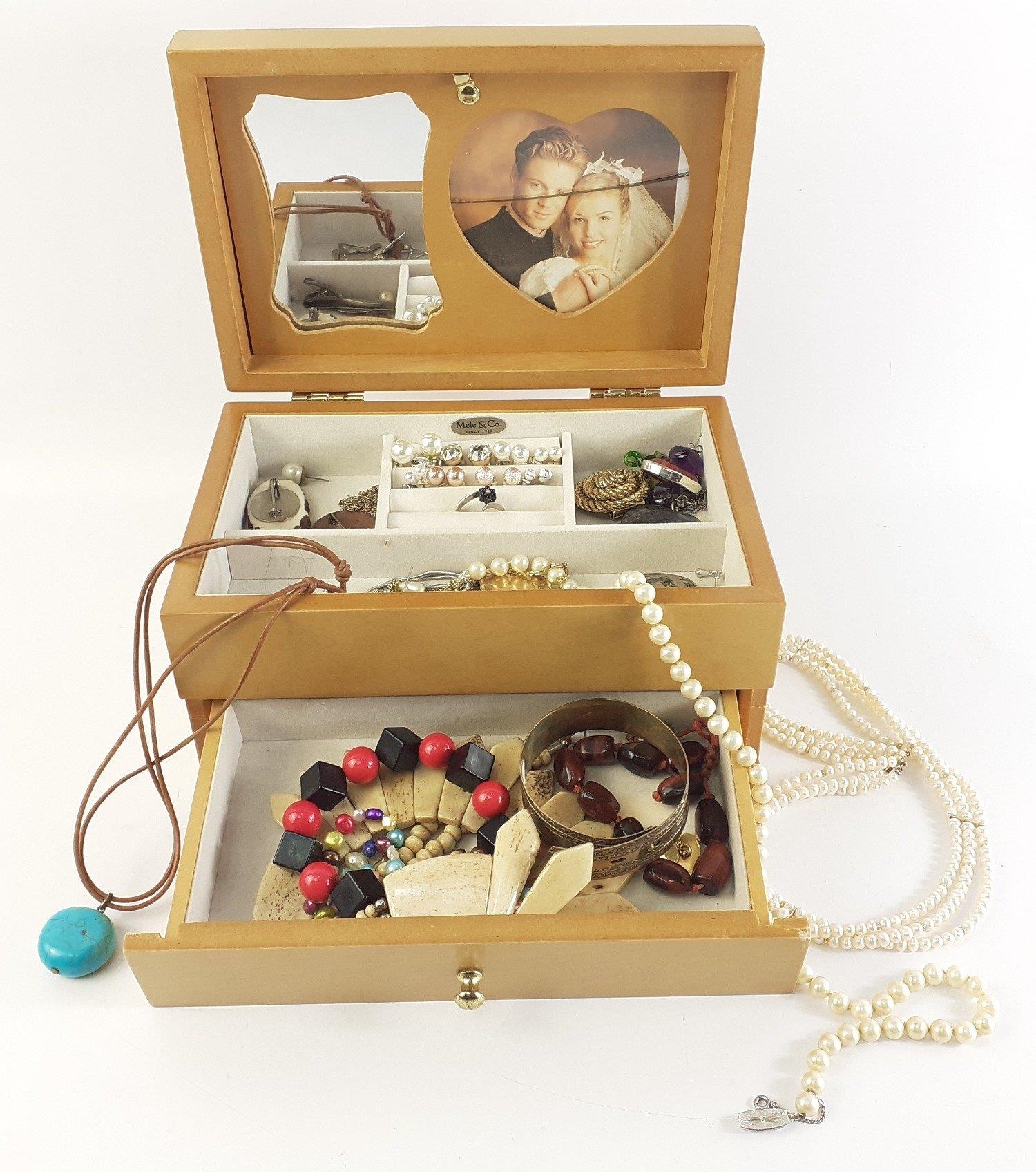 An attractive light wood jewellery box with lower drawer and mirror in lid. Comes with contents of earrings, necklaces, bangles etc