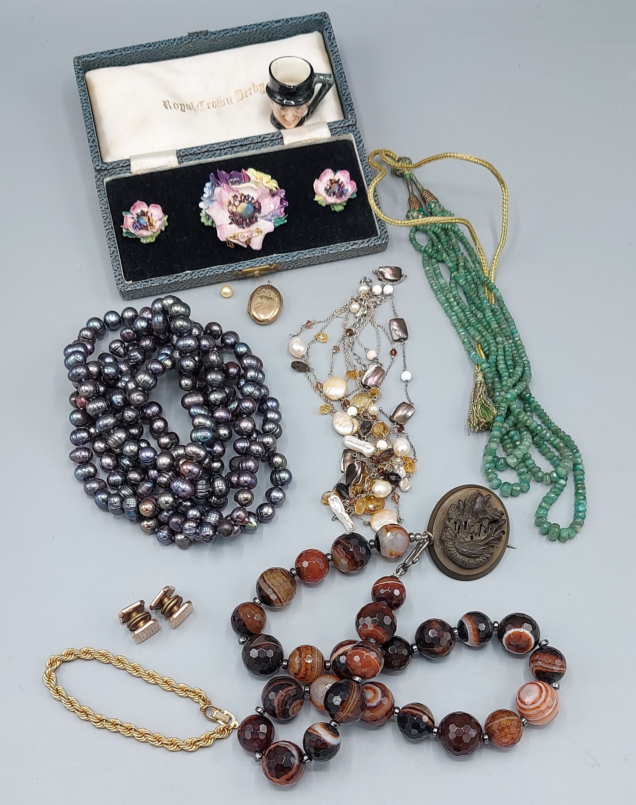 A gold plated bracelet by Christian Dior together with a collection of jewellery to include bead necklaces brooches and related