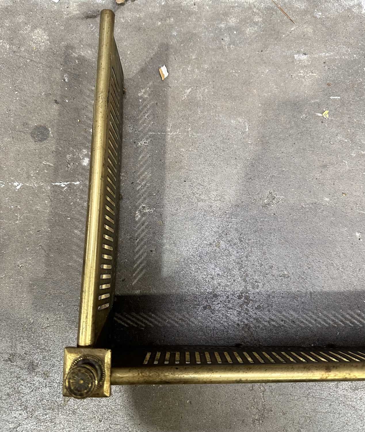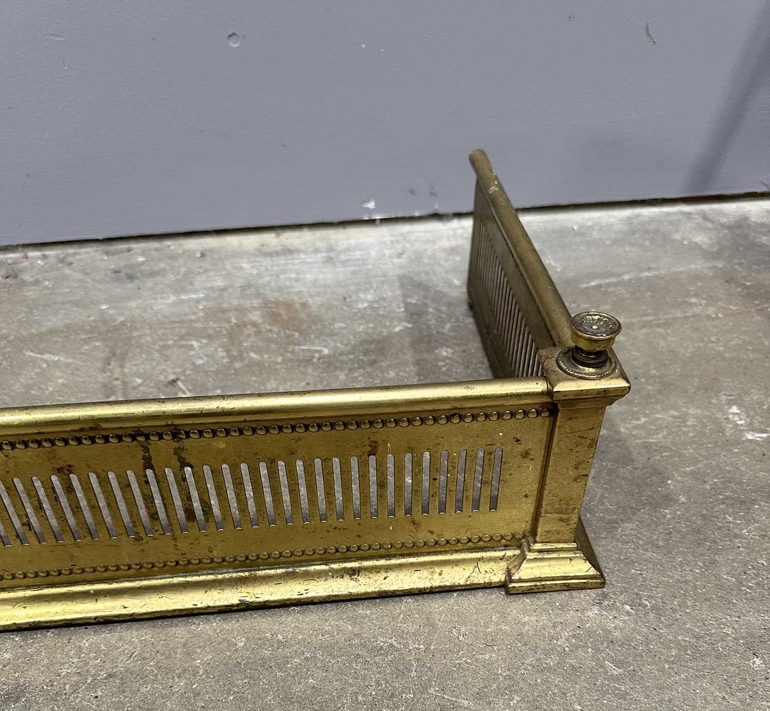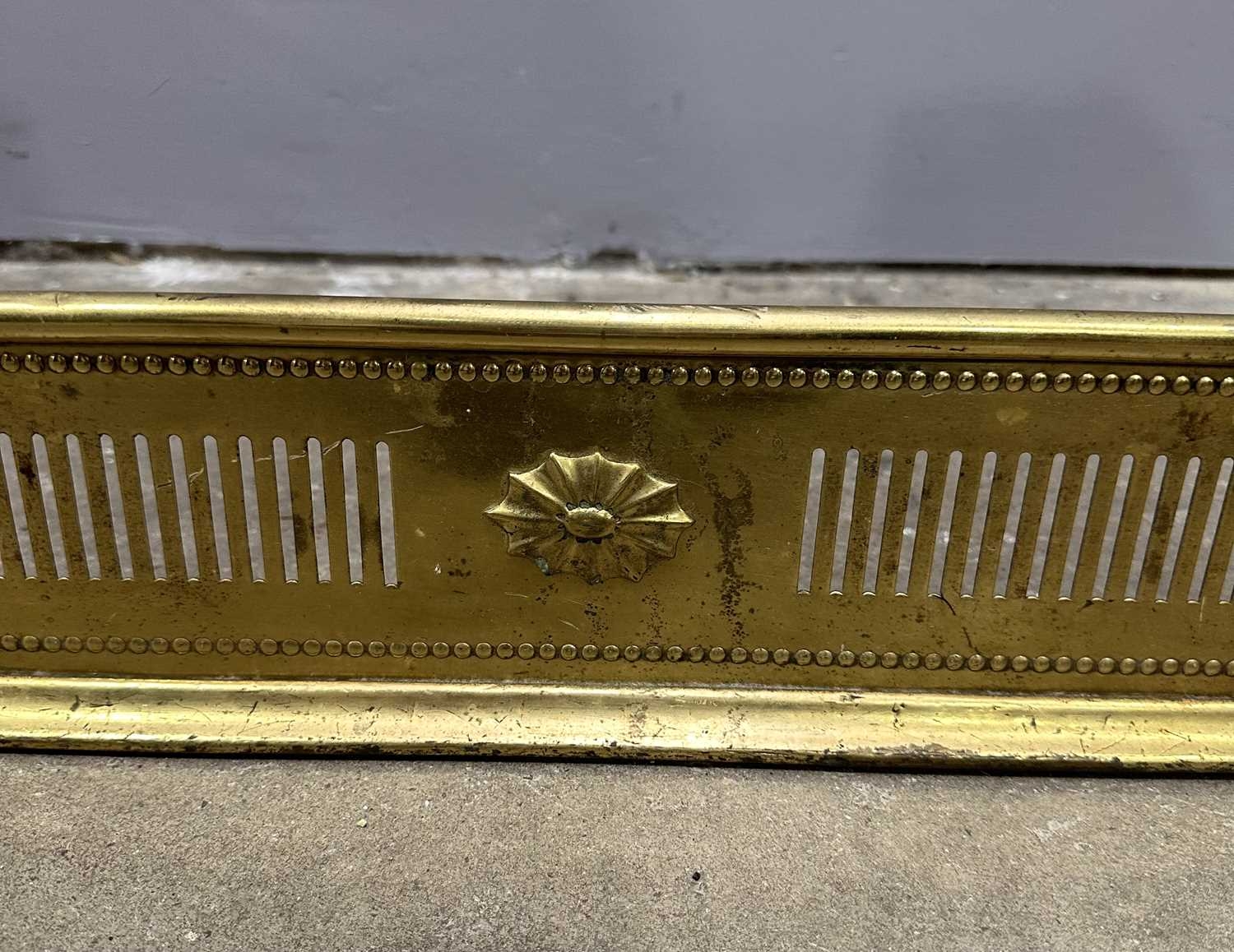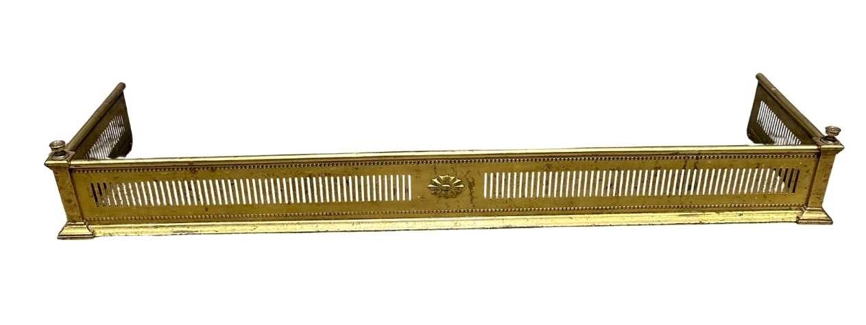 An Edwardian brass fire fender, circa 1910, bar pierced frieze, 15cm high, 118cm wide, 32cm deep (1)