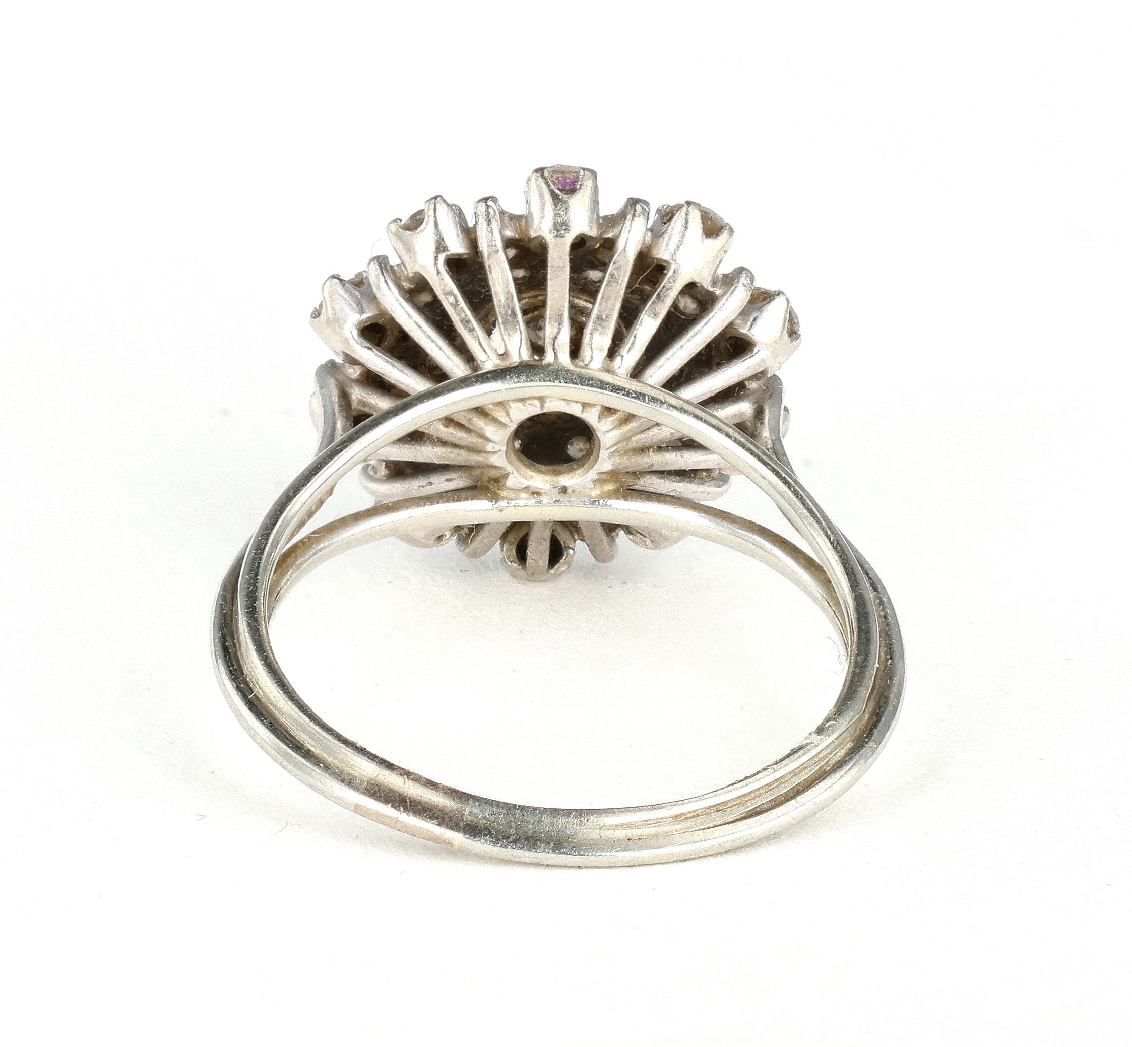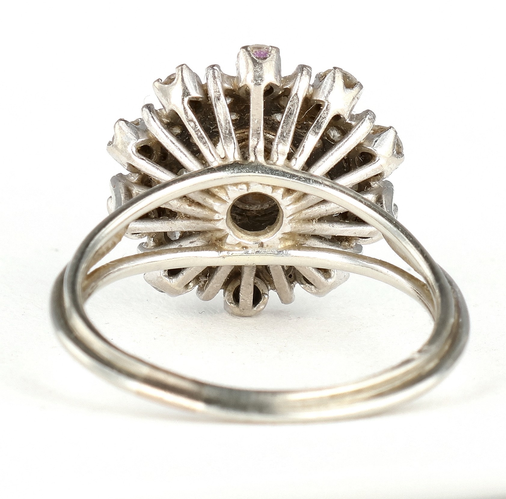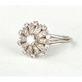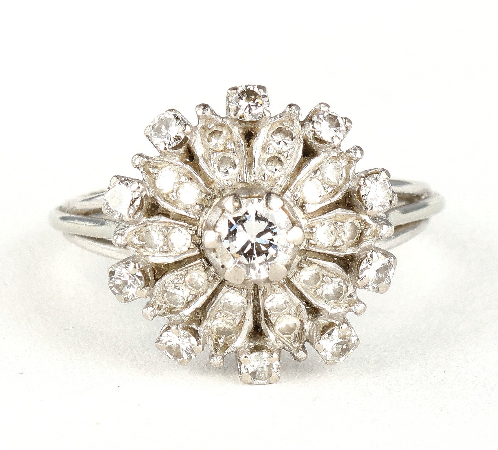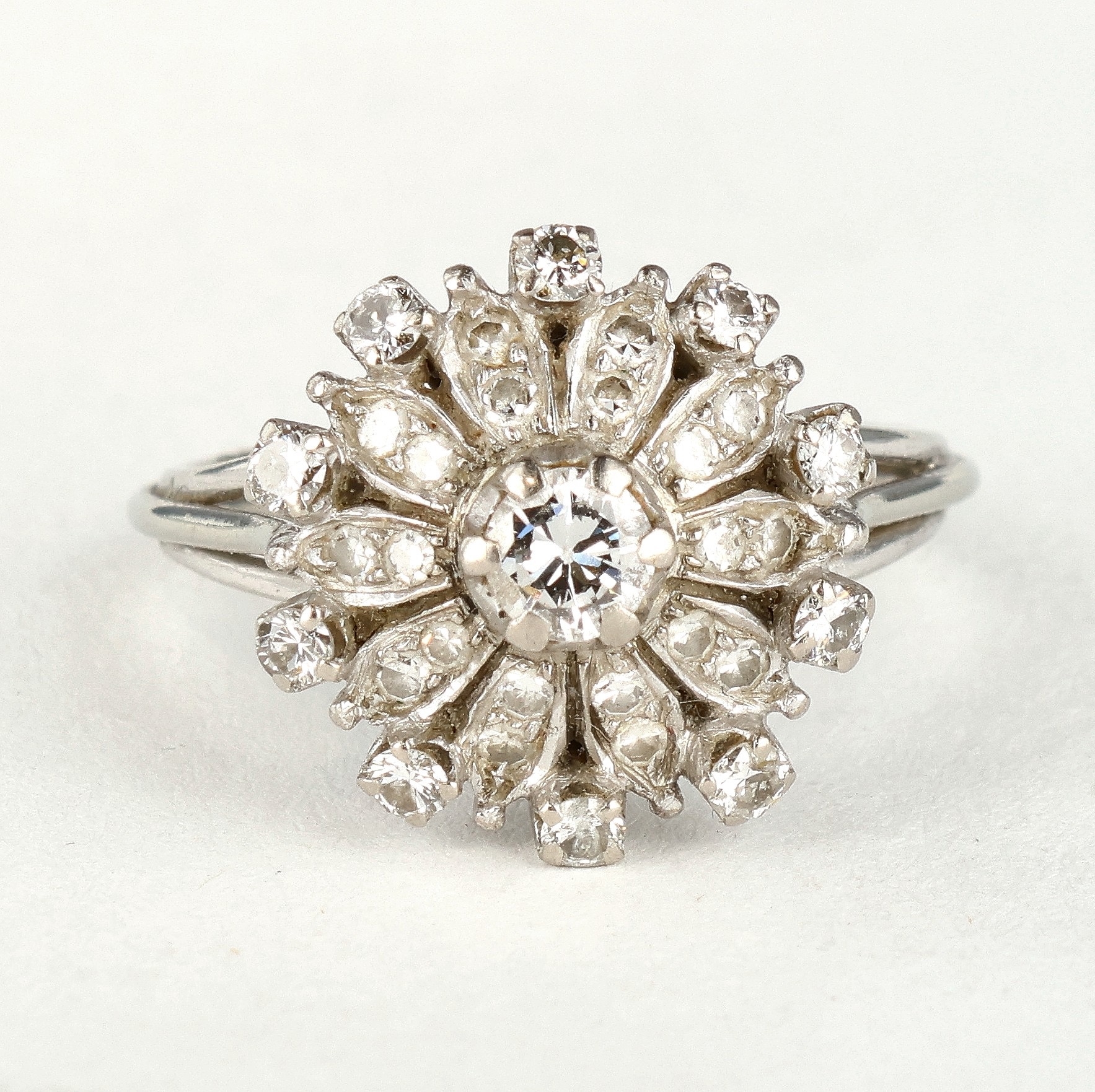 AN 18 CARAT WHITE GOLD DIAMOND CLUSTER RING