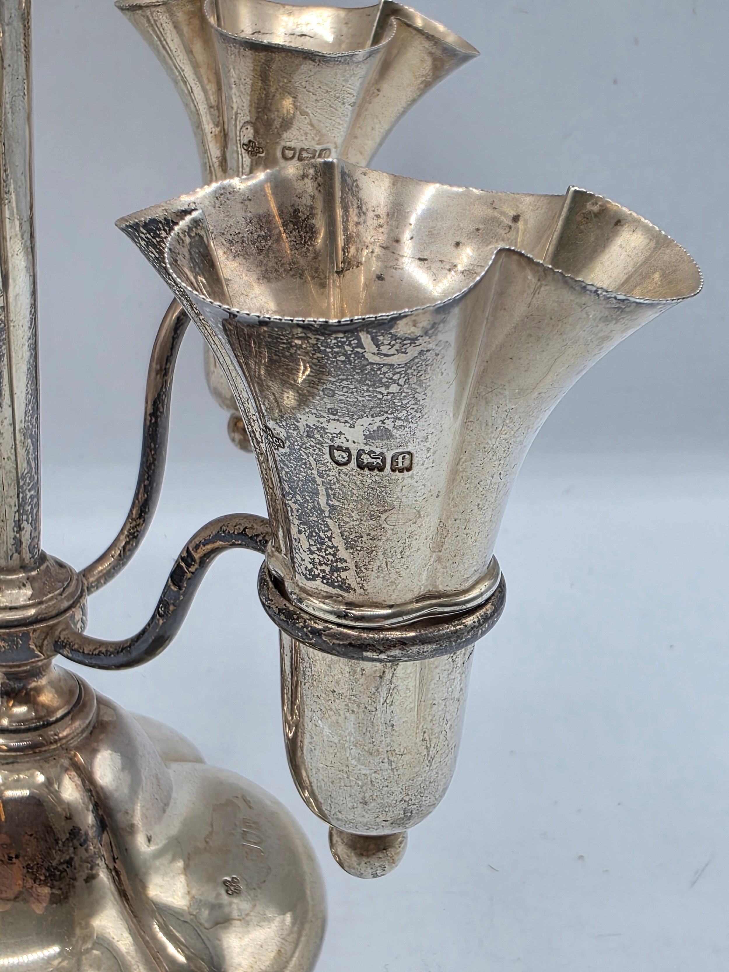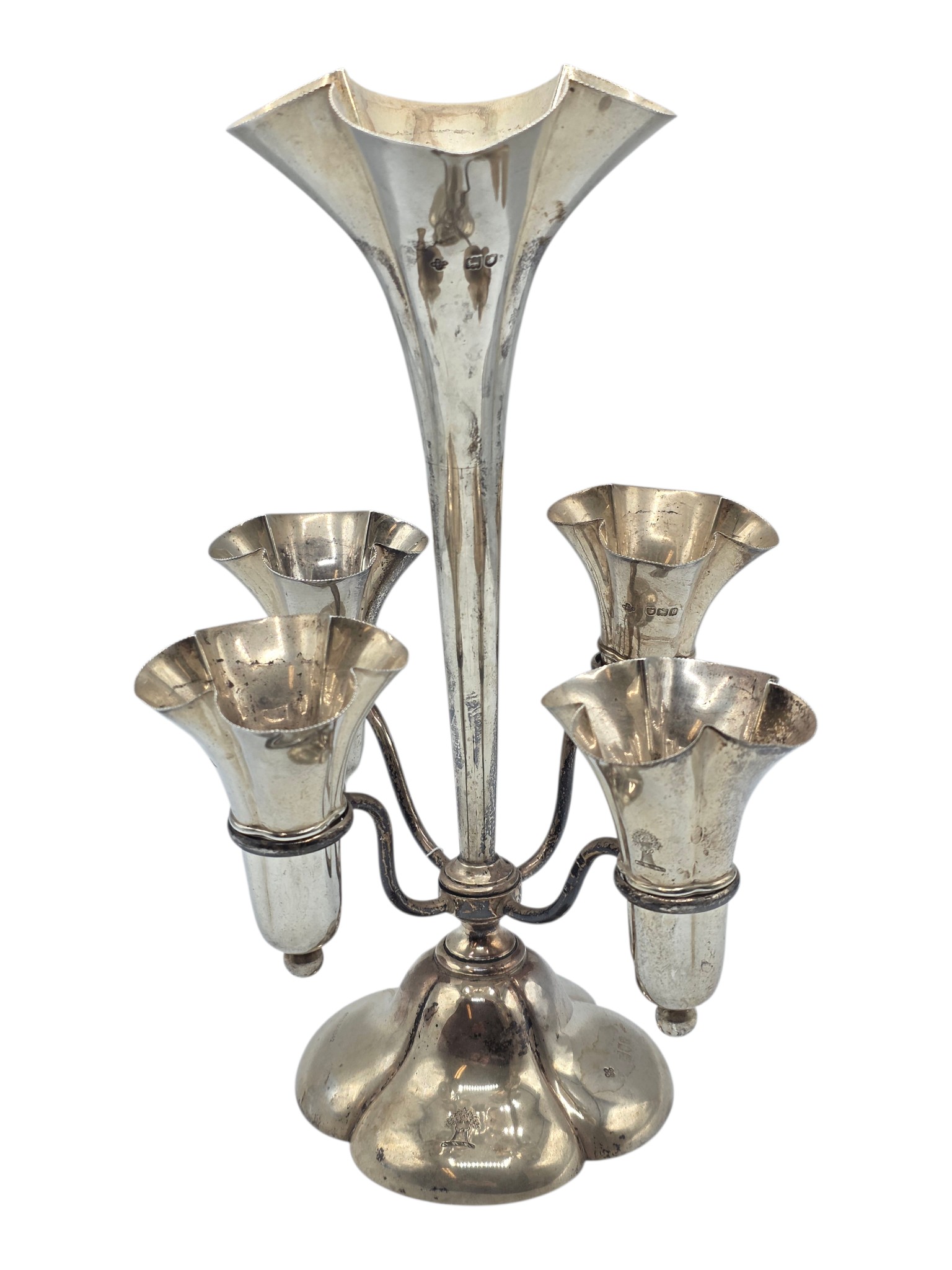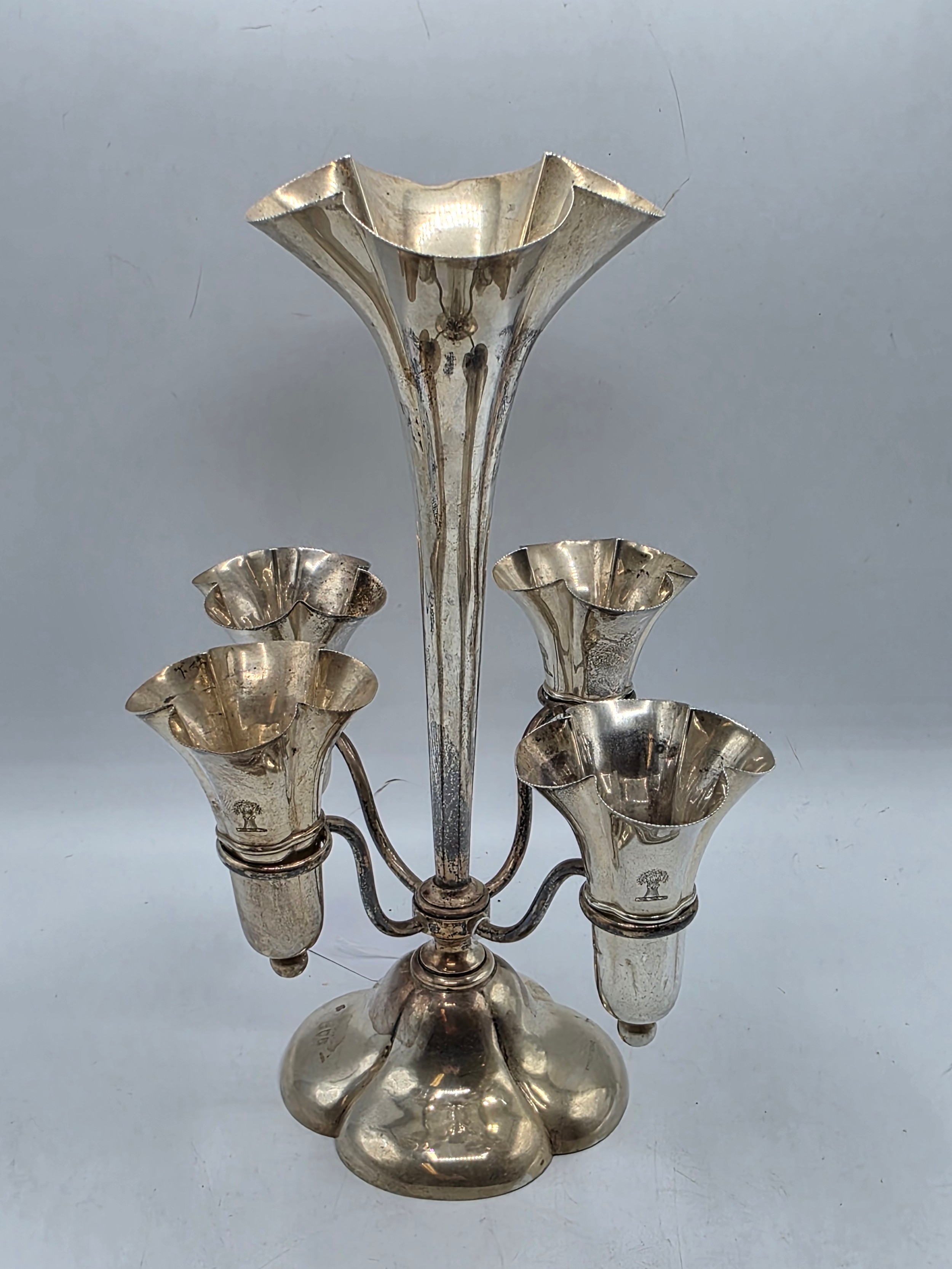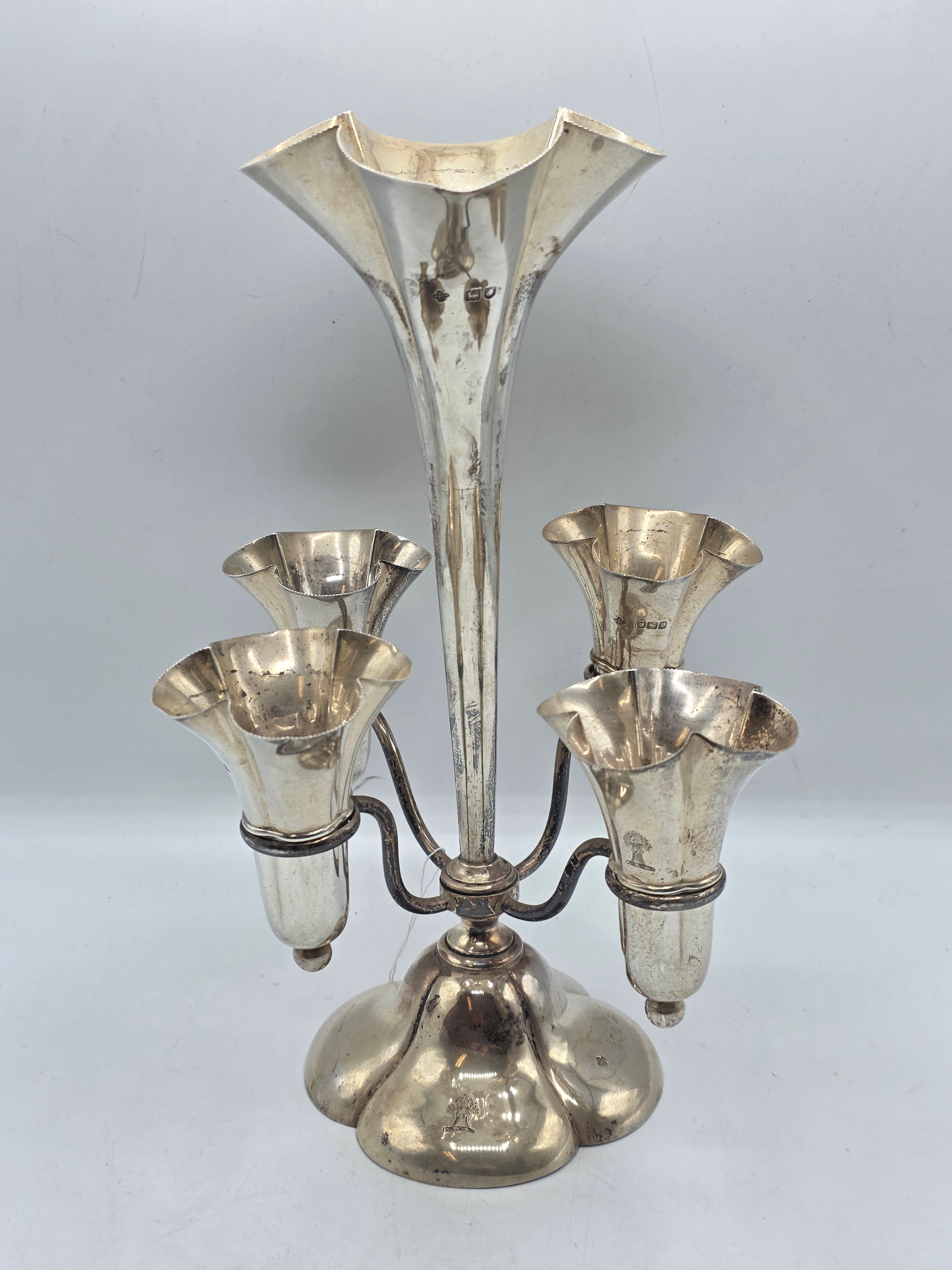 A sterling silver table centre epergne with weighted quatrefoil base 25 cm H, gross weight 662 g
