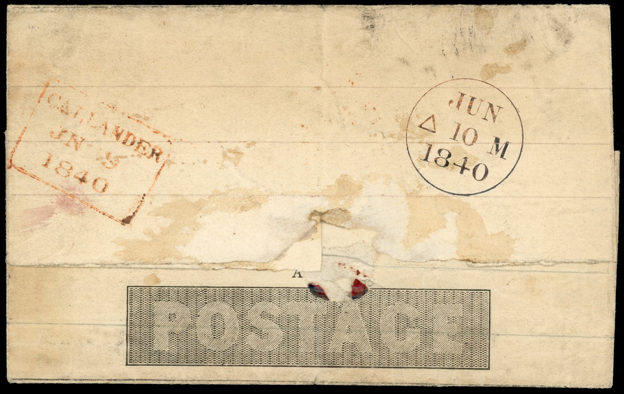 1840 1d lettersheet to Buxton bearing orange-red Maltese Cross, manuscript â??Missent toâ??at left, backstamped with Callander (9.6) boxed despatch handstamp and Edinburgh (10.6) transit cds; some peripheral faults. Good and unusual. SG ME
