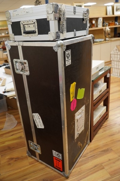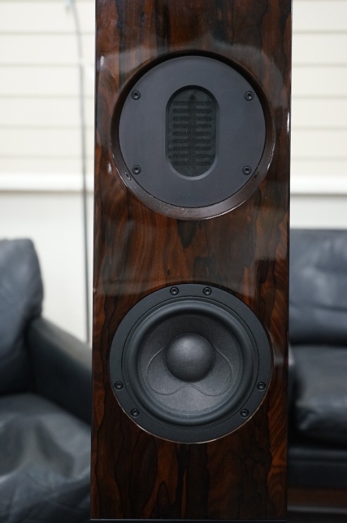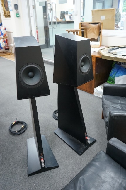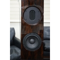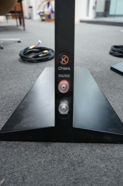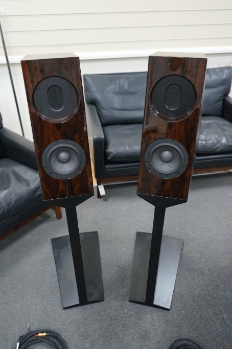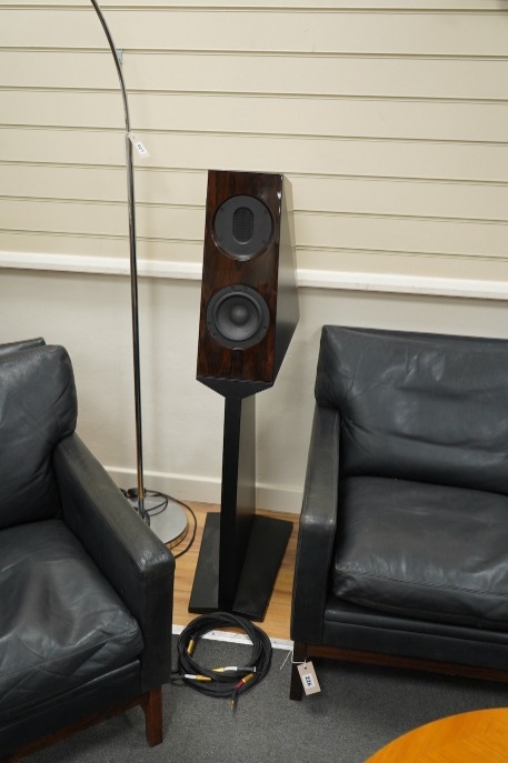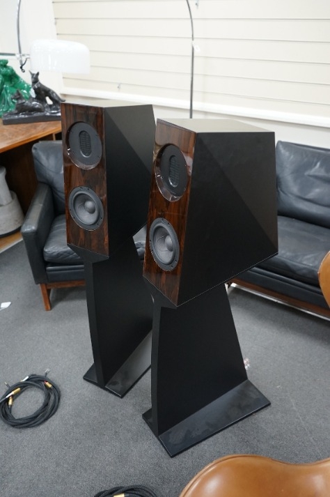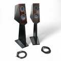 A pair of Kaiser Acoustics Kawero Chiara loudspeakers, made in Germany, high density plywood cabinets and integrated stands, with the fronts in the rosewood finish, 116cm high, the base; 30cm x 47cm, together with two flight cases.