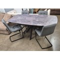 A Naples twist top printed glass extending dining table and four Hampton pewter upholstered dining chairs, boxed